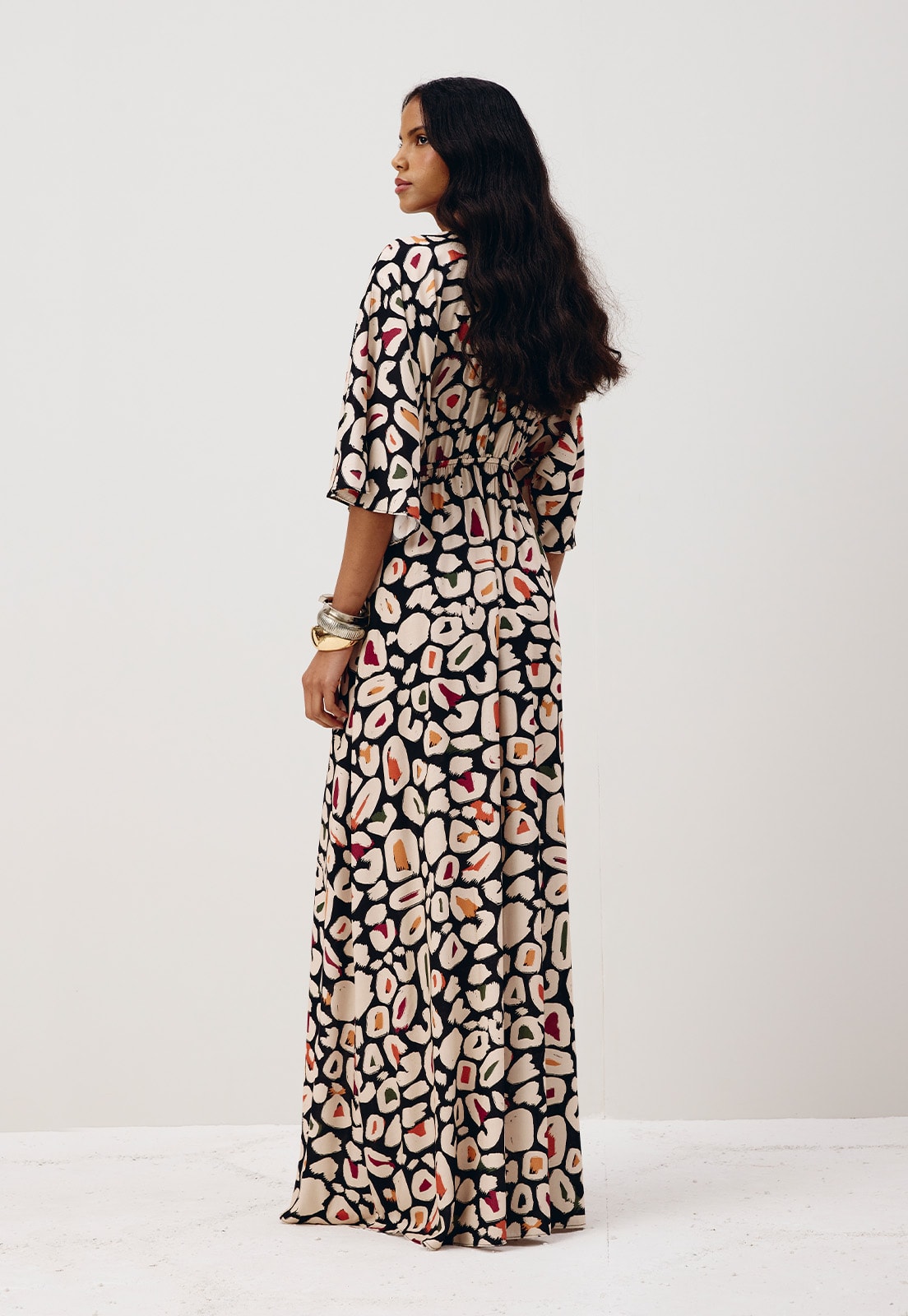 O Vestido Longo Manga Ampla Detalhe Ponteira Onza da CaCay é a expressão do movimento e da sofisticação em uma peça única. Com design fluido e caimento solto que valoriza diferentes silhuetas, seu decote V profundo adiciona elegância atemporal, enquanto as mangas amplas com abertura sutil garantem leveza e conforto ao vestir. Confeccionado em 100% viscose, o tecido oferece toque suave e respirabilidade, ideal para quem busca estilo sem abrir mão do bem-estar. A estampa de formas orgânicas distribui-se harmoniosamente, criando um visual moderno e versátil.