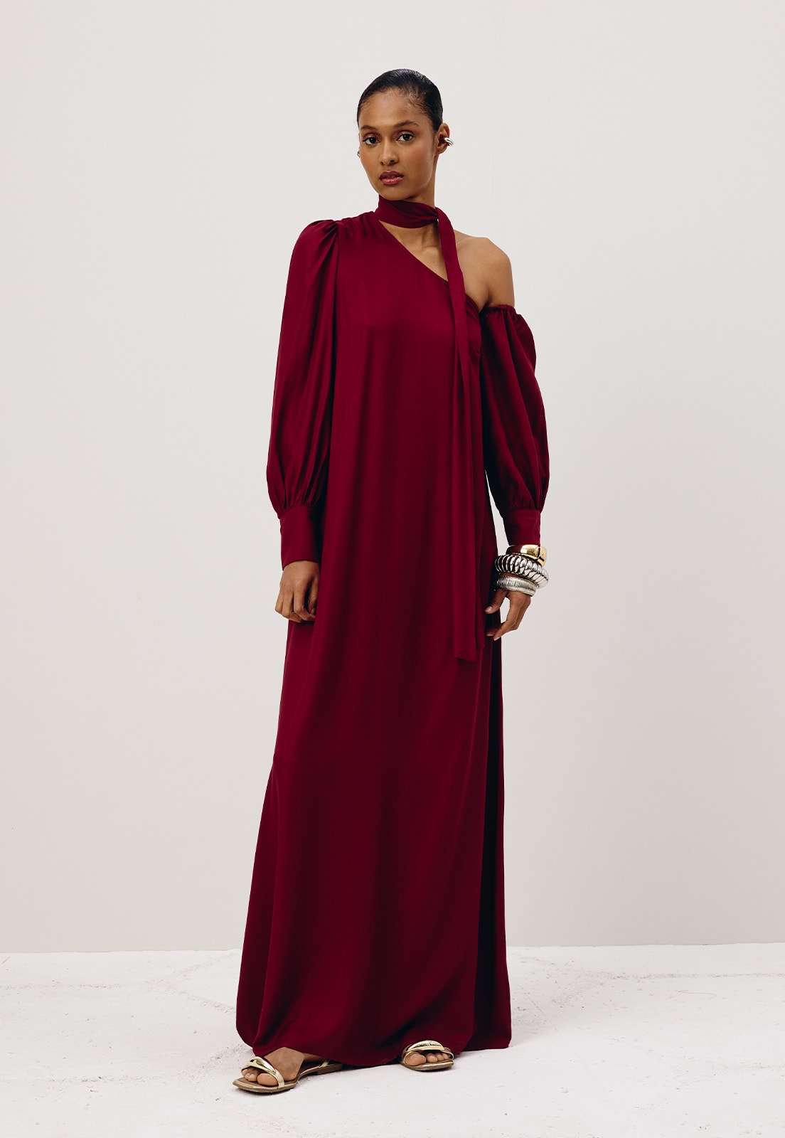 O Vestido Longo de Manga Assimétrica combina elegância contemporânea e leveza em uma peça única e marcante. Com decote assimétrico e mangas longas com punhos abotoados, traz um equilíbrio sutil entre estrutura e fluidez. O detalhe da faixa para amarração no pescoço acrescenta charme ao visual. Confeccionado em 100% viscose, oferece toque macio e caimento impecável, enquanto o elástico na cava da manga assimétrica garante conforto sem comprometer o estilo. Um vestido pensado para ocasiões que pedem presença e originalidade.