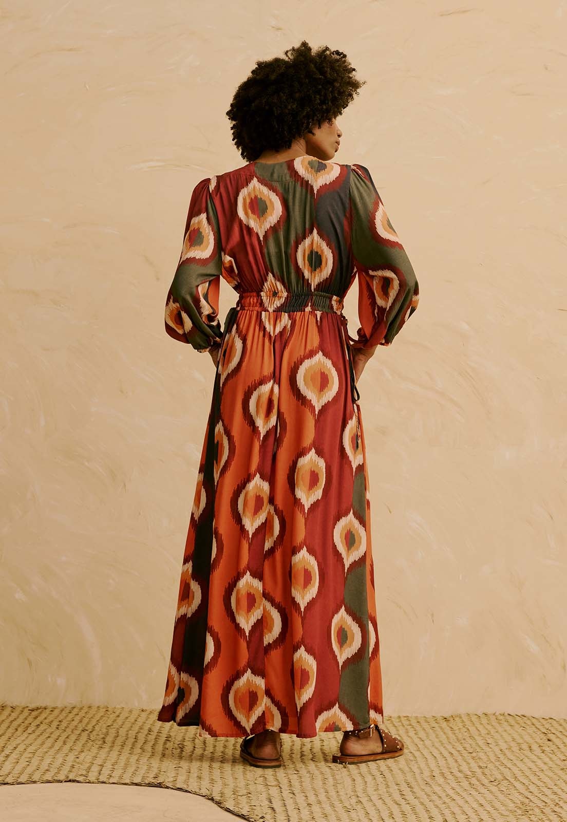 O Vestido Longo Manga Bufante Estampado Taquile da CaCay tem modelagem ampla e fluida, com caimento leve e elegante que valoriza o corpo sem marcar. A cintura é levemente ajustada com elástico confortável e o quadril segue solto, garantindo liberdade de movimento. O comprimento é longo e acompanha o balanço do tecido, ideal para quem busca uma peça versátil com toque sofisticado. A forma é grande. Se estiver em dúvida entre dois tamanhos, recomendamos optar pelo menor, sempre conferindo a tabela de medidas. A modelo da foto tem 1,75 m, veste manequim 36 e está usando o tamanho P.