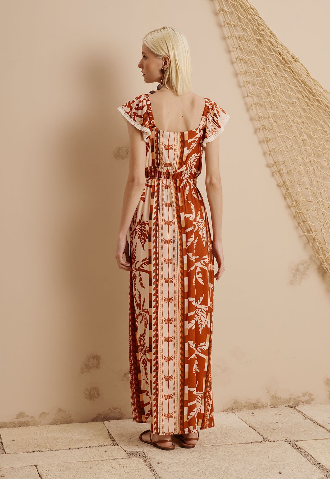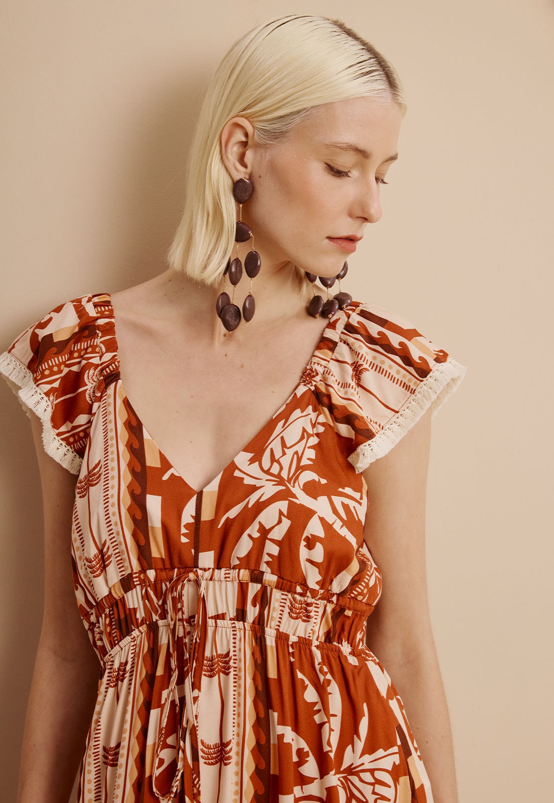 O Vestido Longo Mangas Franjas Estampado Uruará CaCay é a escolha perfeita para quem busca leveza e sofisticação em uma única peça. Confeccionado em 100% viscose, oferece caimento fluido e toque suave, garantindo conforto durante todo o dia. Seu design apresenta mangas com franjas delicadas e estampa inspirada em elementos naturais, criando um visual elegante e atemporal. Ideal para ocasiões que pedem praticidade sem abrir mão do estilo, como passeios, eventos ao ar livre ou encontros casuais.