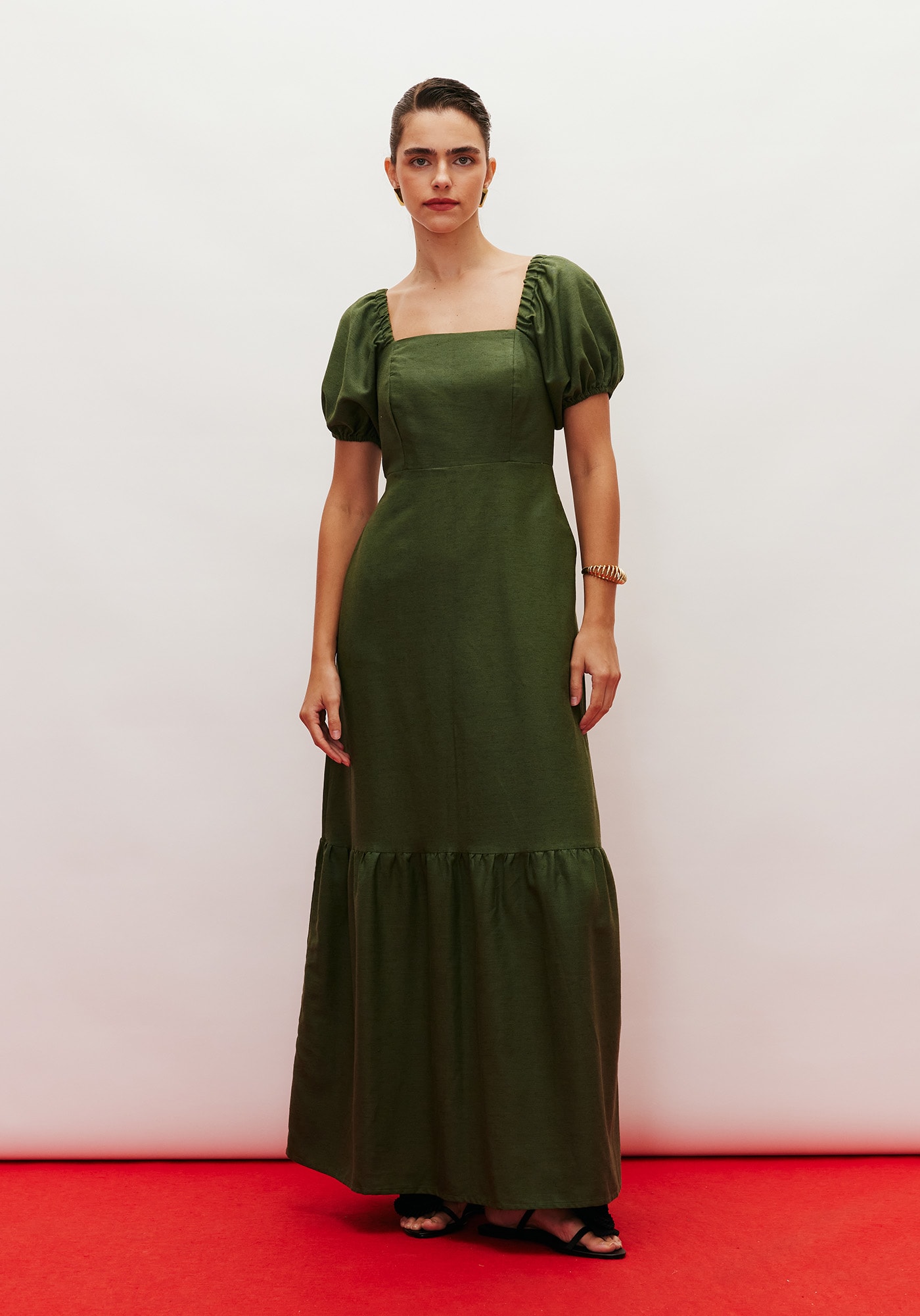 O vestido longo é um modelo românticoe versátil. Confeccionado em tecido 42% algodão 38% viscose 14% modal 6% linho,possui decote reto e manga curta bufante. O bolso na lateral dá um toquemoderno e prático à peça. O babado no comprimento dá volume e movimento à peça.
