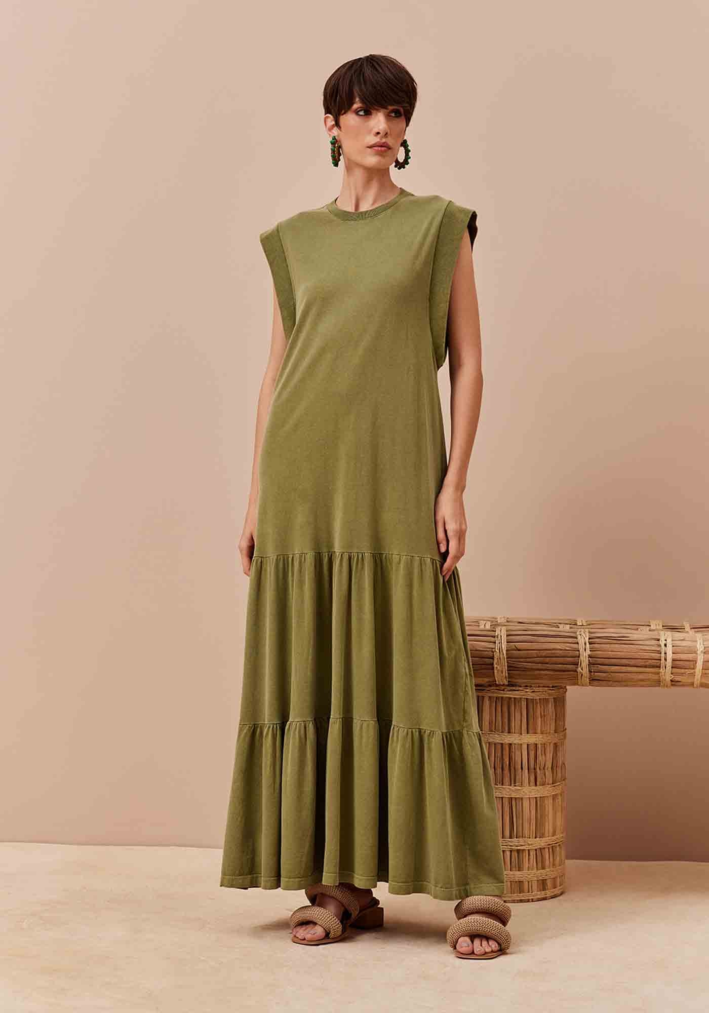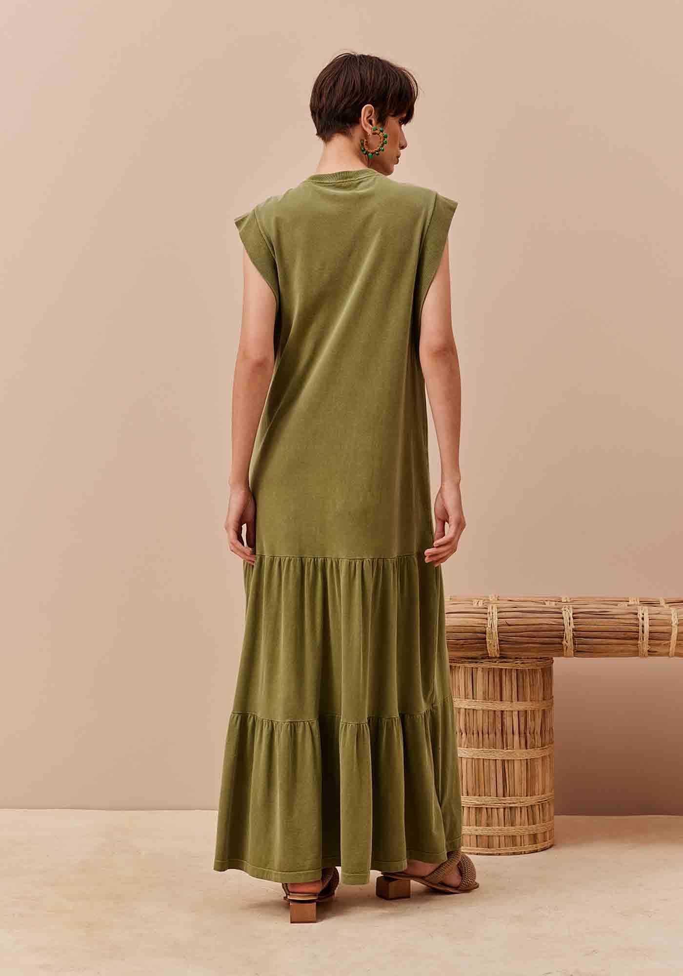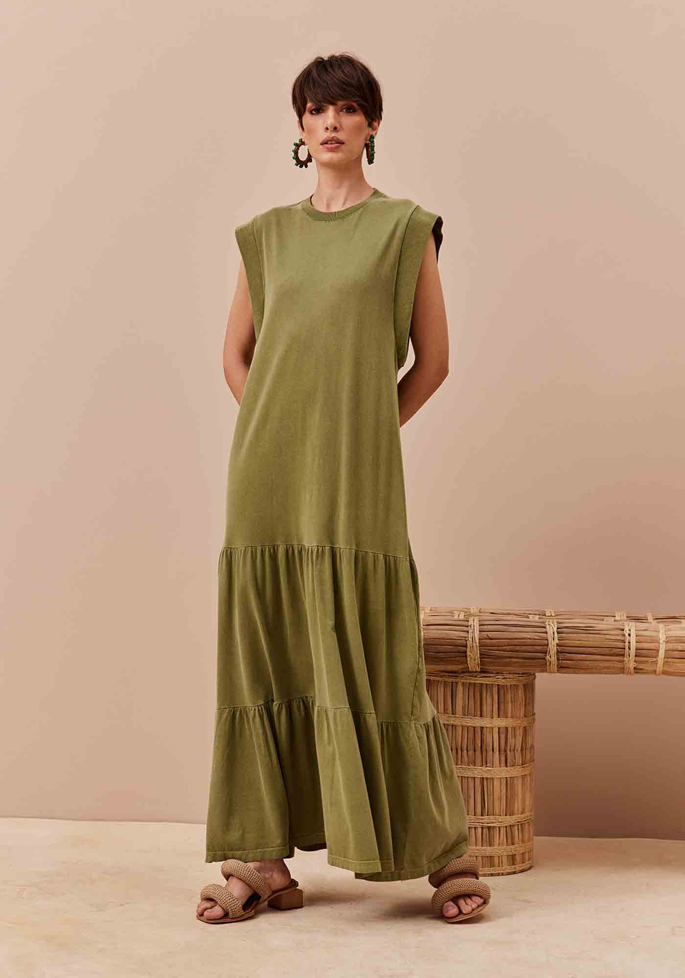 O vestido longo estanado é confeccionado em malha. O modelo possui amplo possui manga estilo muscleteee babados ao longo do comprimento, aumentando o volumento e o movimento da peça.