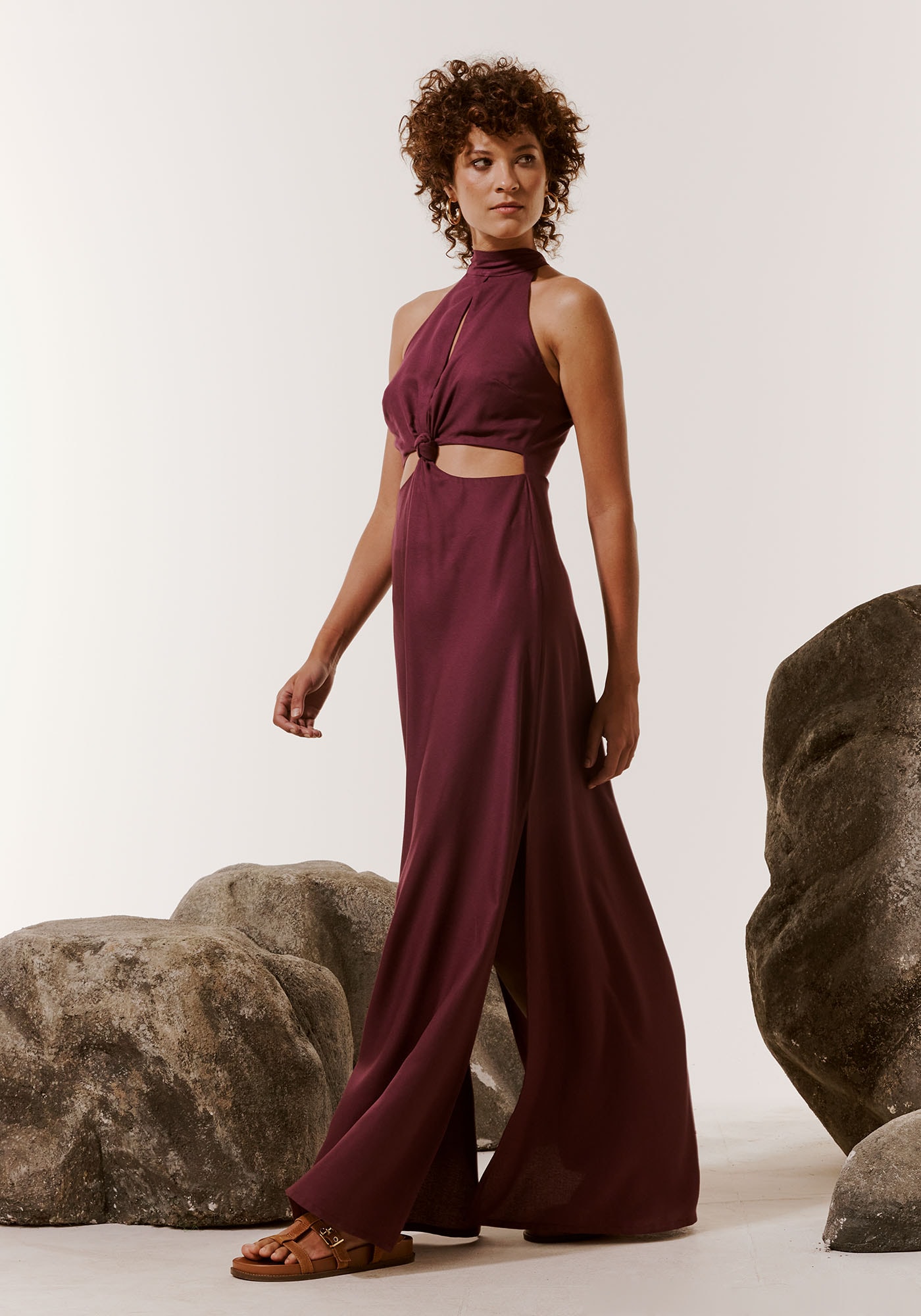 O vestido longo é elegante e sensualao mesmo tempo. Confeccionado em tecido 100% viscose, o modelo belíssimo contacom golinha alta que amarra na parte de trás e abertura frontal. O nó nacintura exibe os recortes laterais que destacam a silhueta. A parte de tráspossui um decote que valoriza as costas.