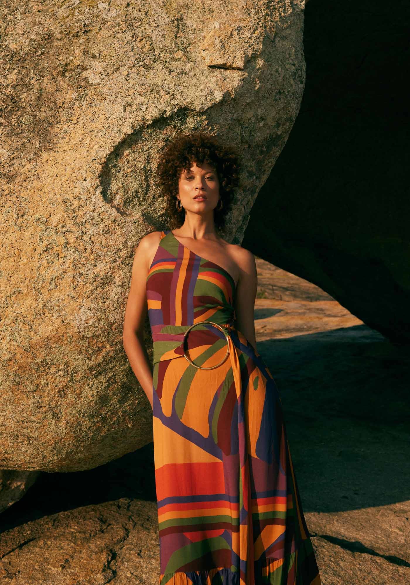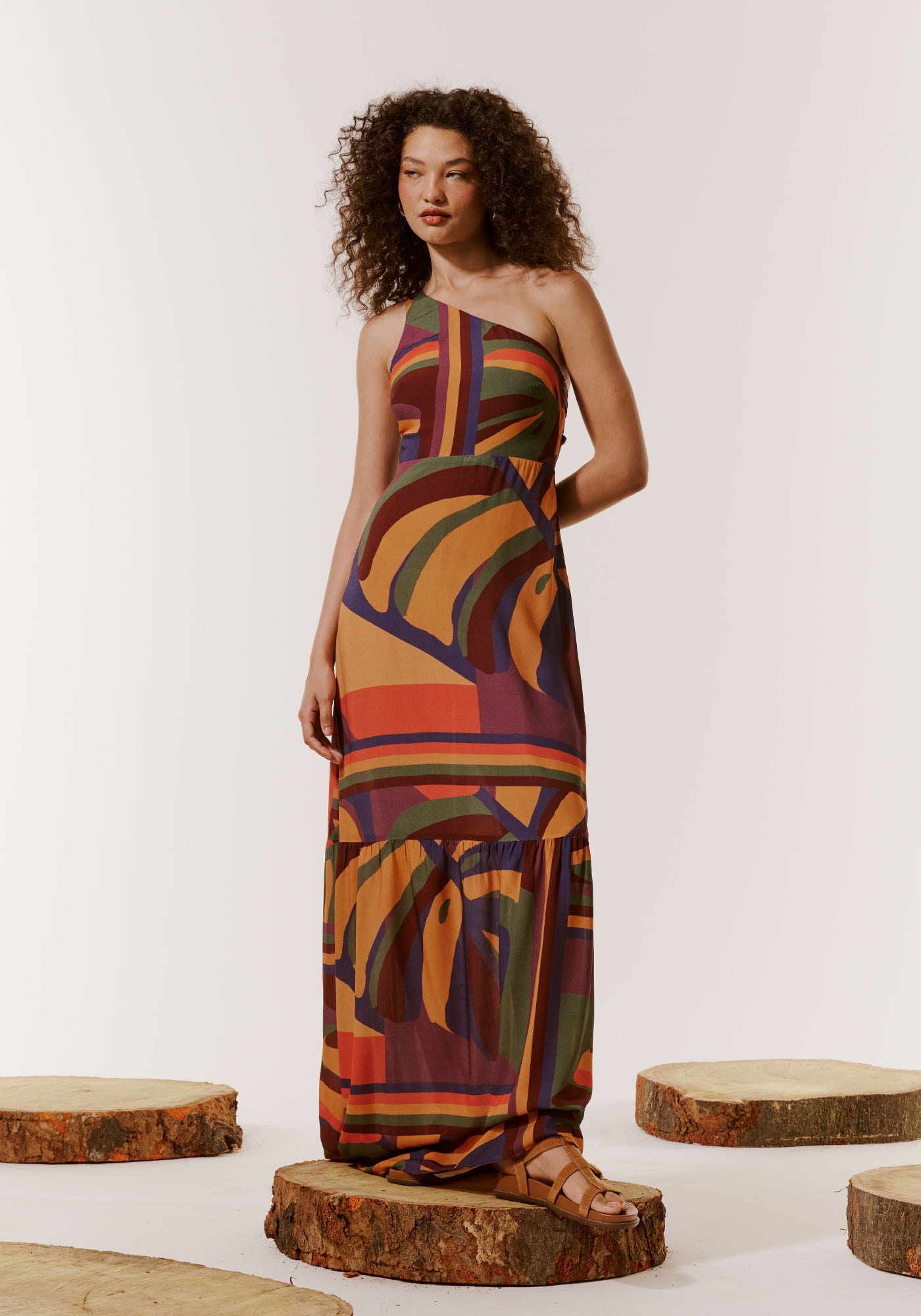 O Vestido longo de um ombro só estampado é um modelo marcante.Confeccionado em tecido 100% viscose, amodelagem de um ombro só ganha um toque especial de ousadia e sensualidade. Amaria ao longo do vestido dá leveza e fluidez à peça.