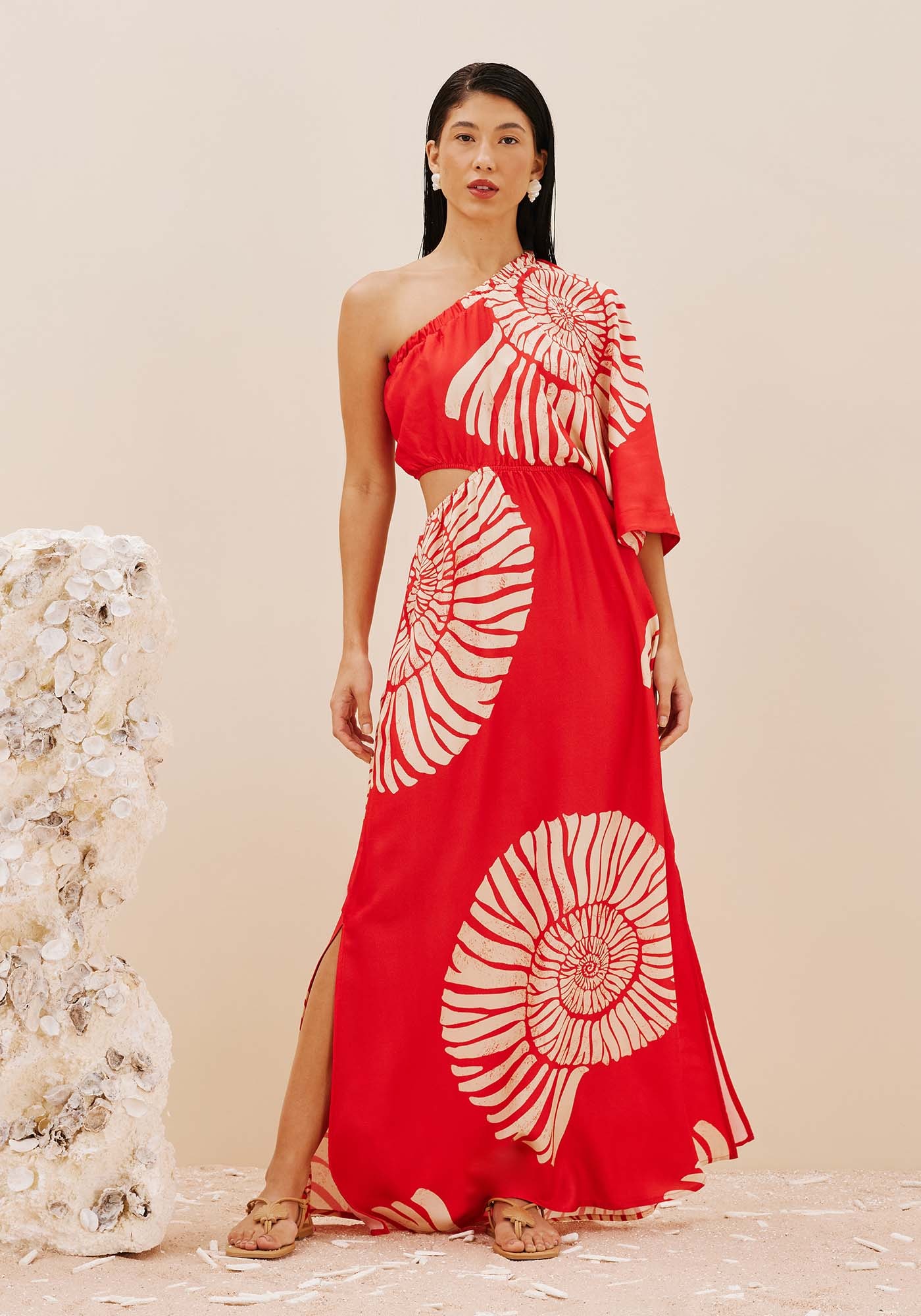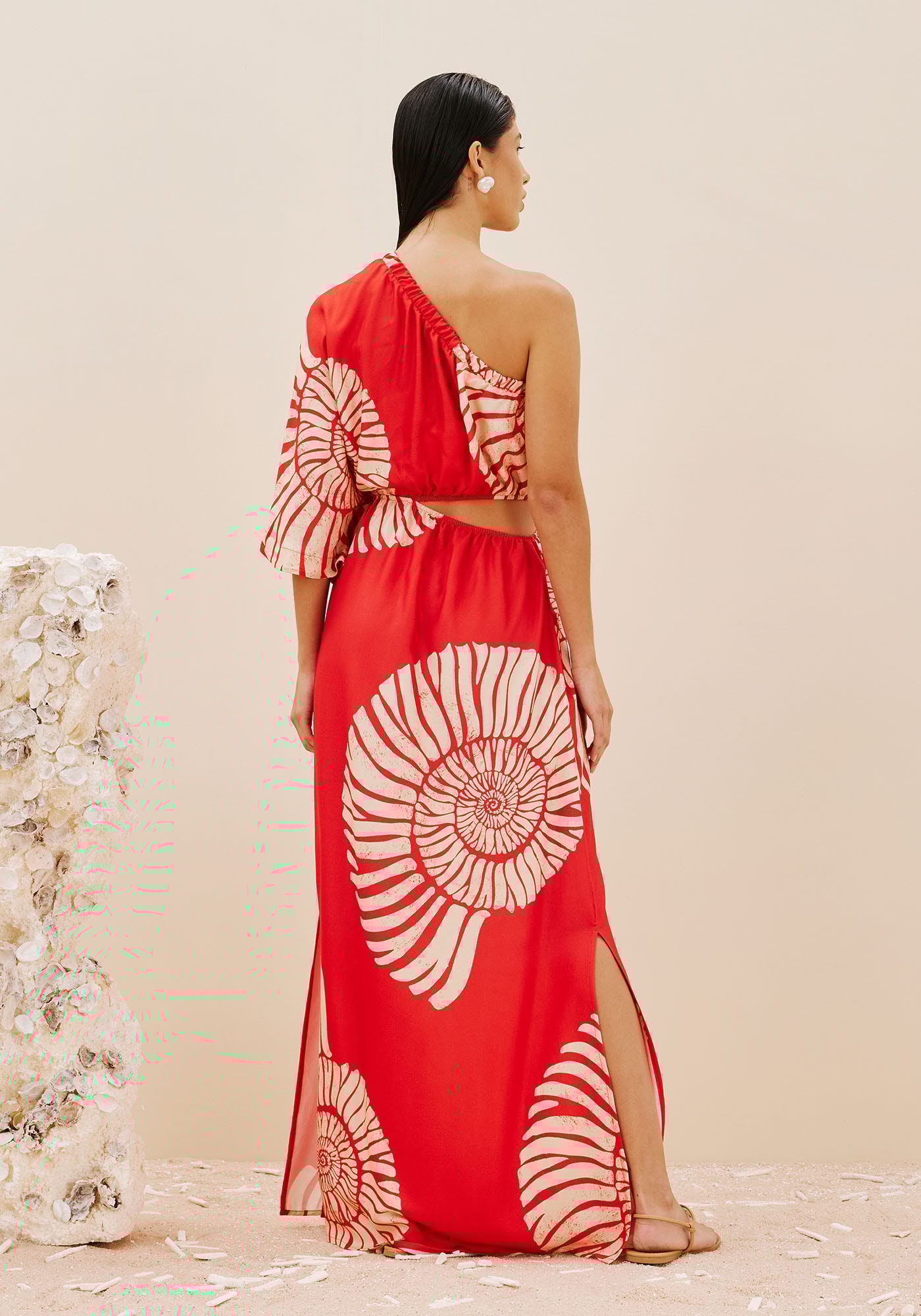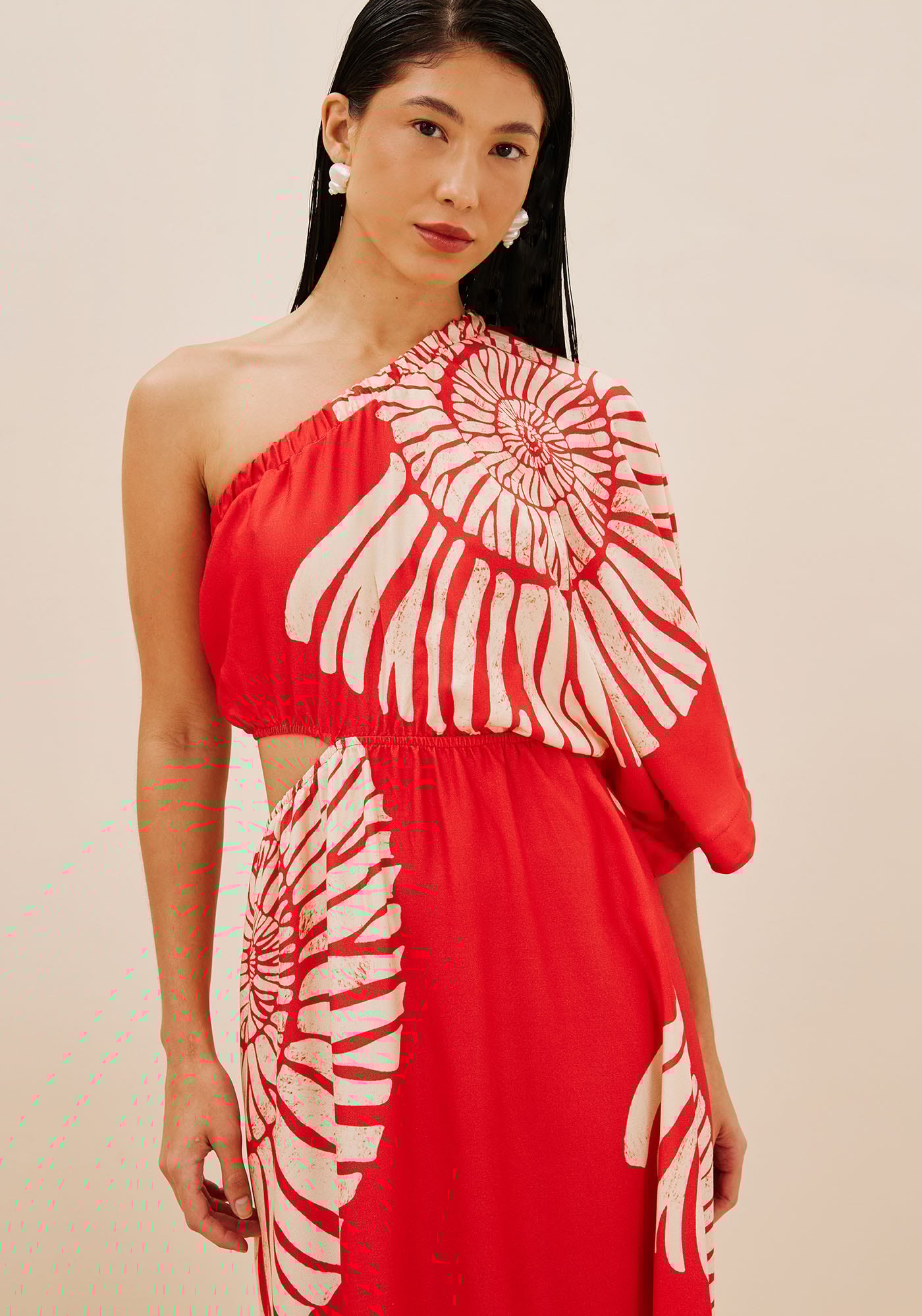 Confeccionadoem tecido 100% viscose, o vestido estampado Caracas é simplesmente maravilhoso.Modelo de um ombro só com manga ¾, possui recorte lateral que valoriza as curvasdo corpo. A saia contém fendas laterais e modelagem soltinha, que traz umafluidez maior.
