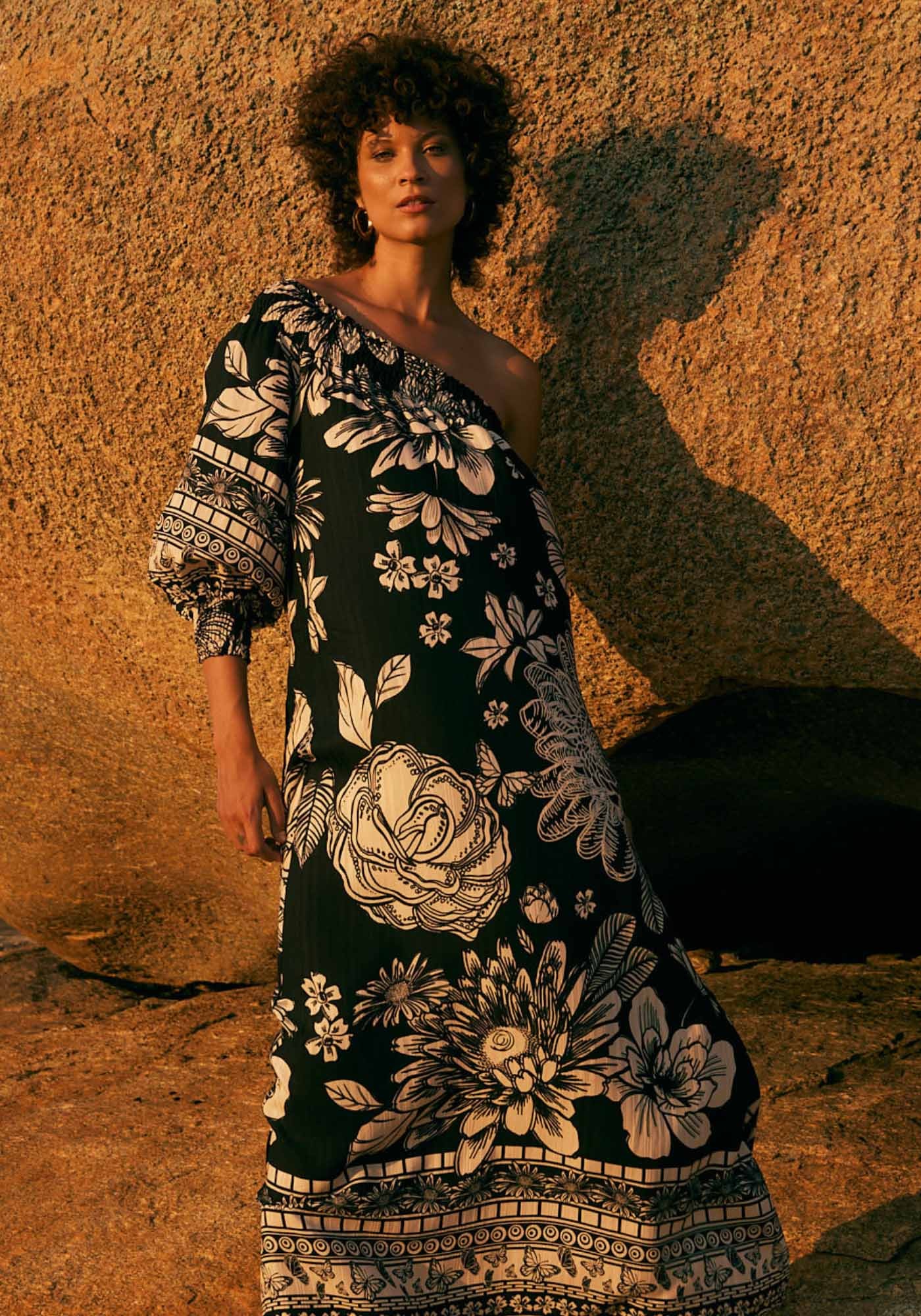 Esse vestido é elegante e encantador. Confeccionado em tecido 100%viscose, o modelo longo possui uma linda manga única e ampla, que se finalizacom um detalhe de lastex e proporciona um ajuste ideal, além de enriquecer amodelagem. O decote com lastex faz com que a peça se ajuste bem no busto. A estampa Pradaria é um clássico P&B com elementos florais dediferentes modelos e tamanhos.