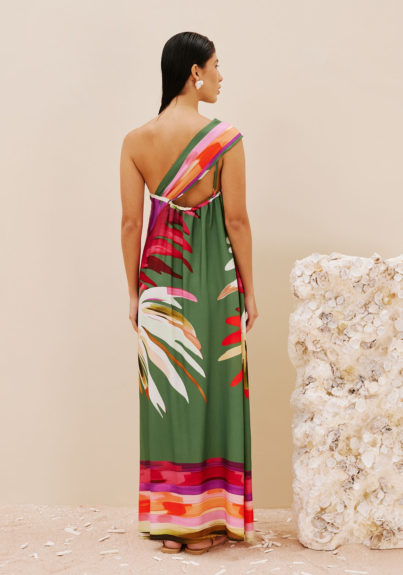 Confeccionado em tecido 100%viscose, o vestido longo estampa Ráfia é um verdadeiro espetáculo. O modelo deum ombro só possui um caimento é belíssimo e sofisticado e possui um caimentoreto, que alonga e valoriza a silhueta.