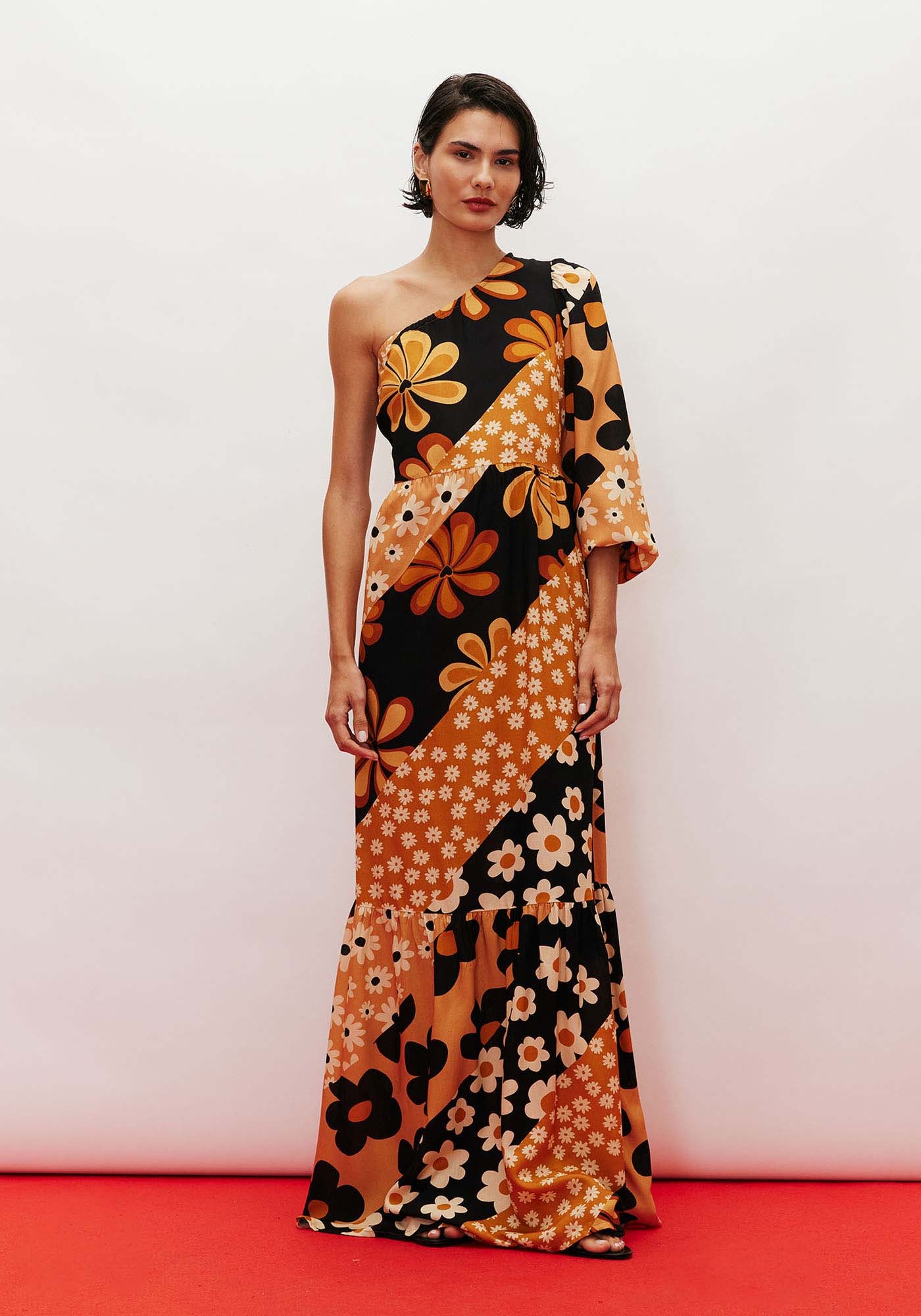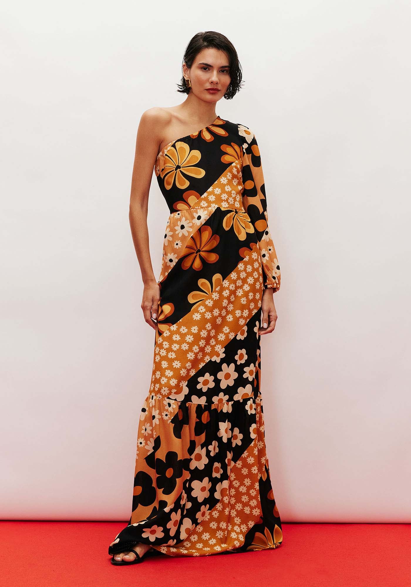 Modelagem de um ombro só em manga longa, ovestido longo é puro charme e sofisticação. O shape reto ajustado ao corpopossui cintura marcada e maria no comprimento, o que dá mais movimento à peça.