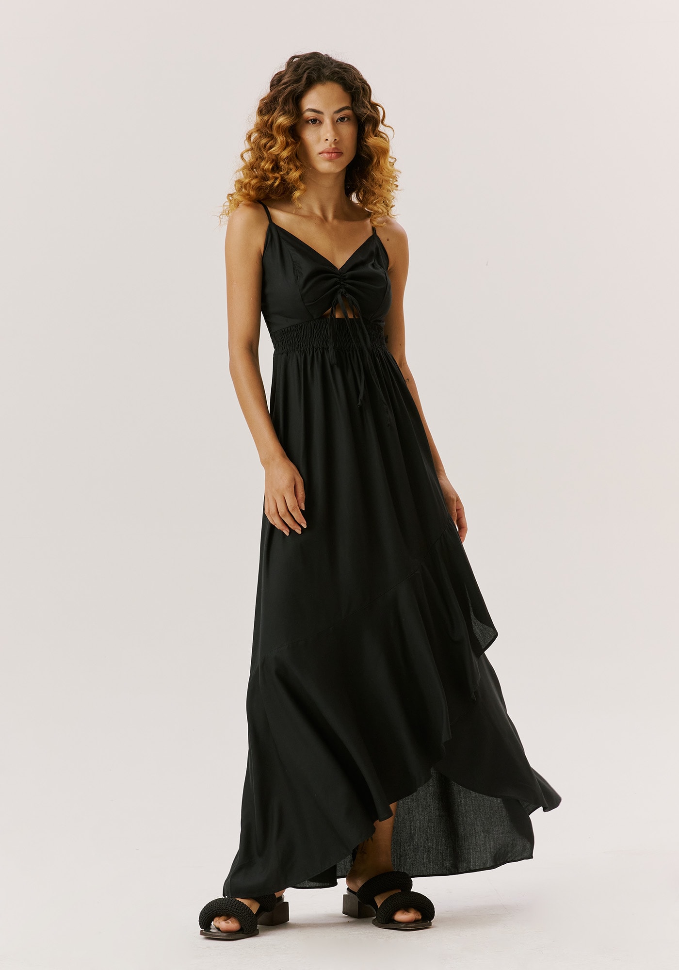 O vestido longo é uma explosão debeleza. Confeccionado em tecido 100% viscose, é um modelo de alcinha comamarração em túnel no busto e pala em lastex. O babado na lateral dá movimento efluidez à peça. Para maior conforto e adaptabilidade ao corpo, possui lastexnas costas também.