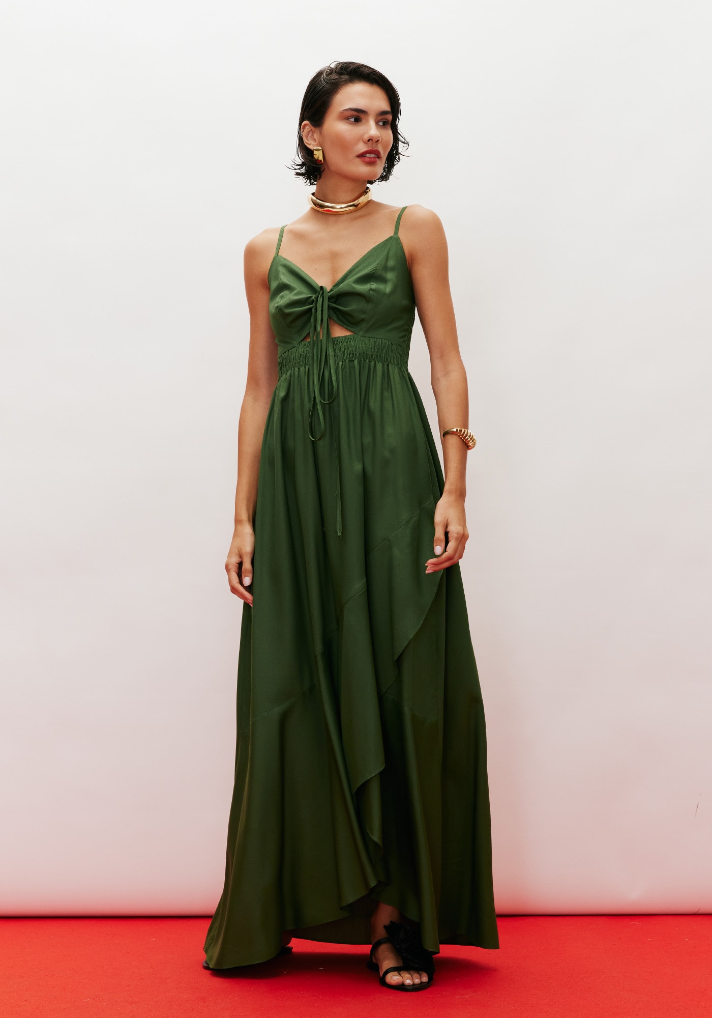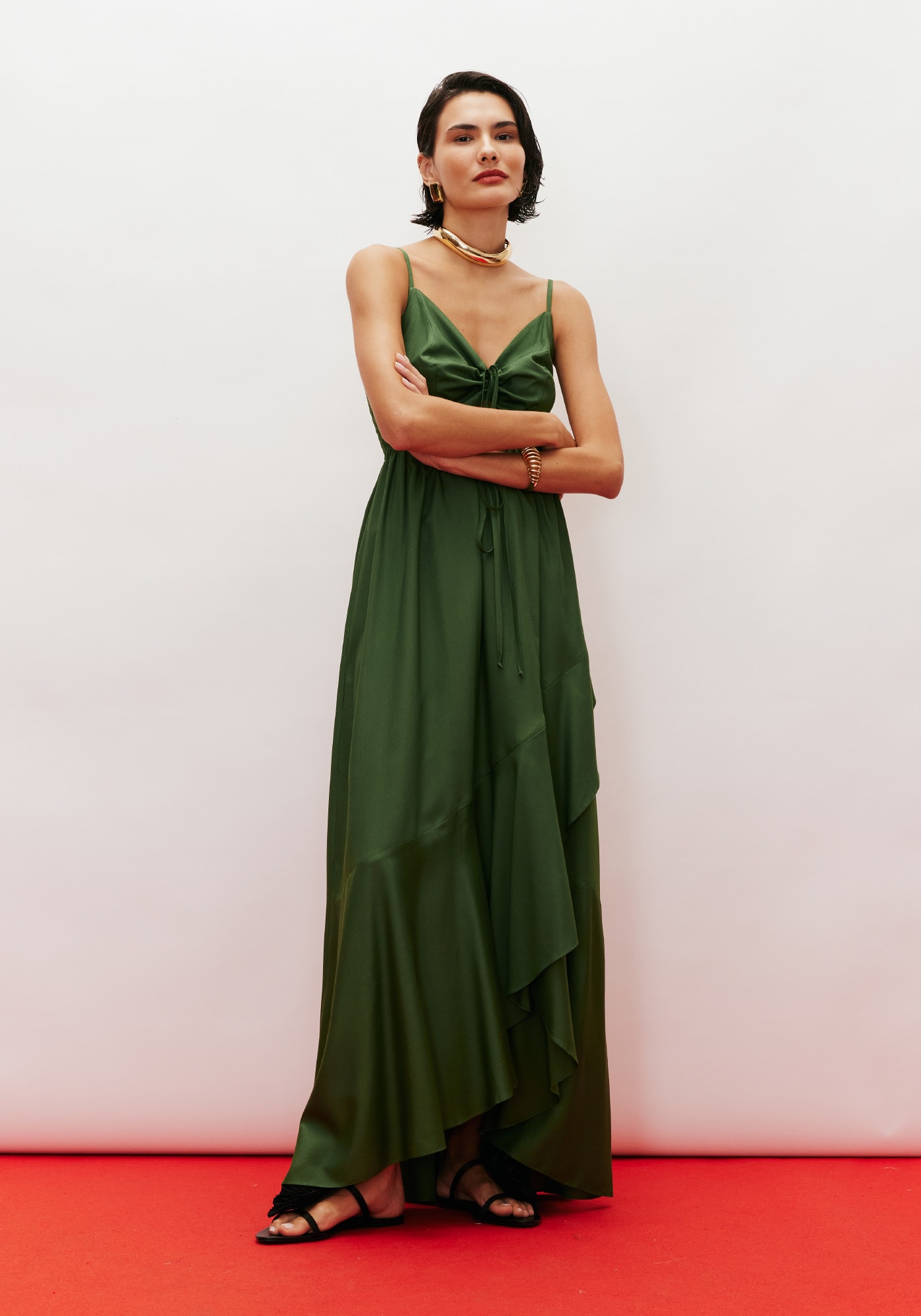 O vestido longo é uma explosão debeleza. Confeccionado em tecido 100% viscose, é um modelo de alcinha comamarração em túnel no busto e pala em lastex. O babado na lateral dá movimento efluidez à peça. Para maior conforto e adaptabilidade ao corpo, possui lastexnas costas também.