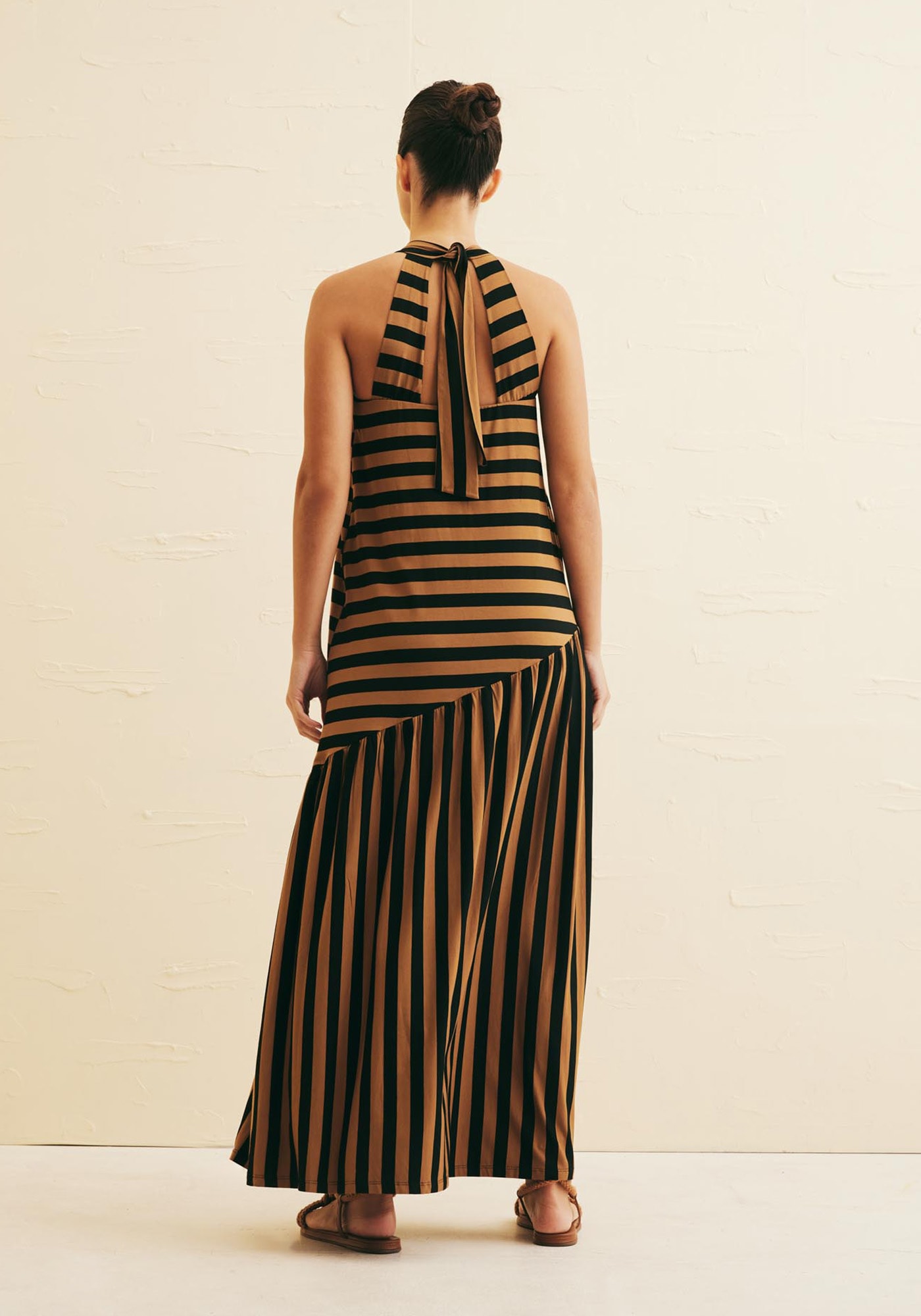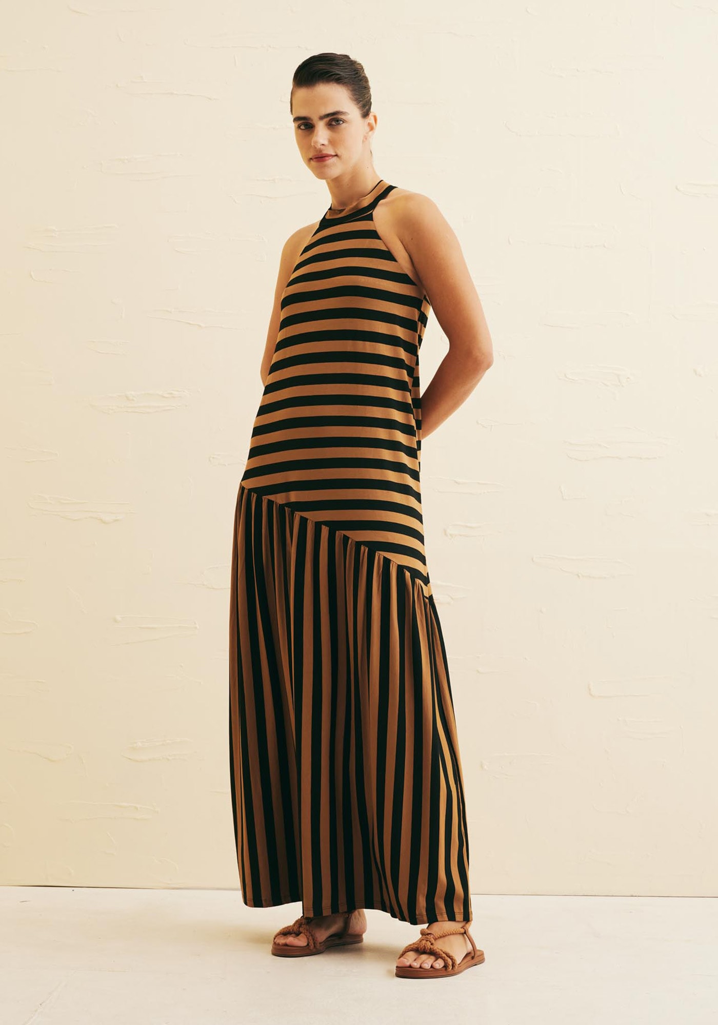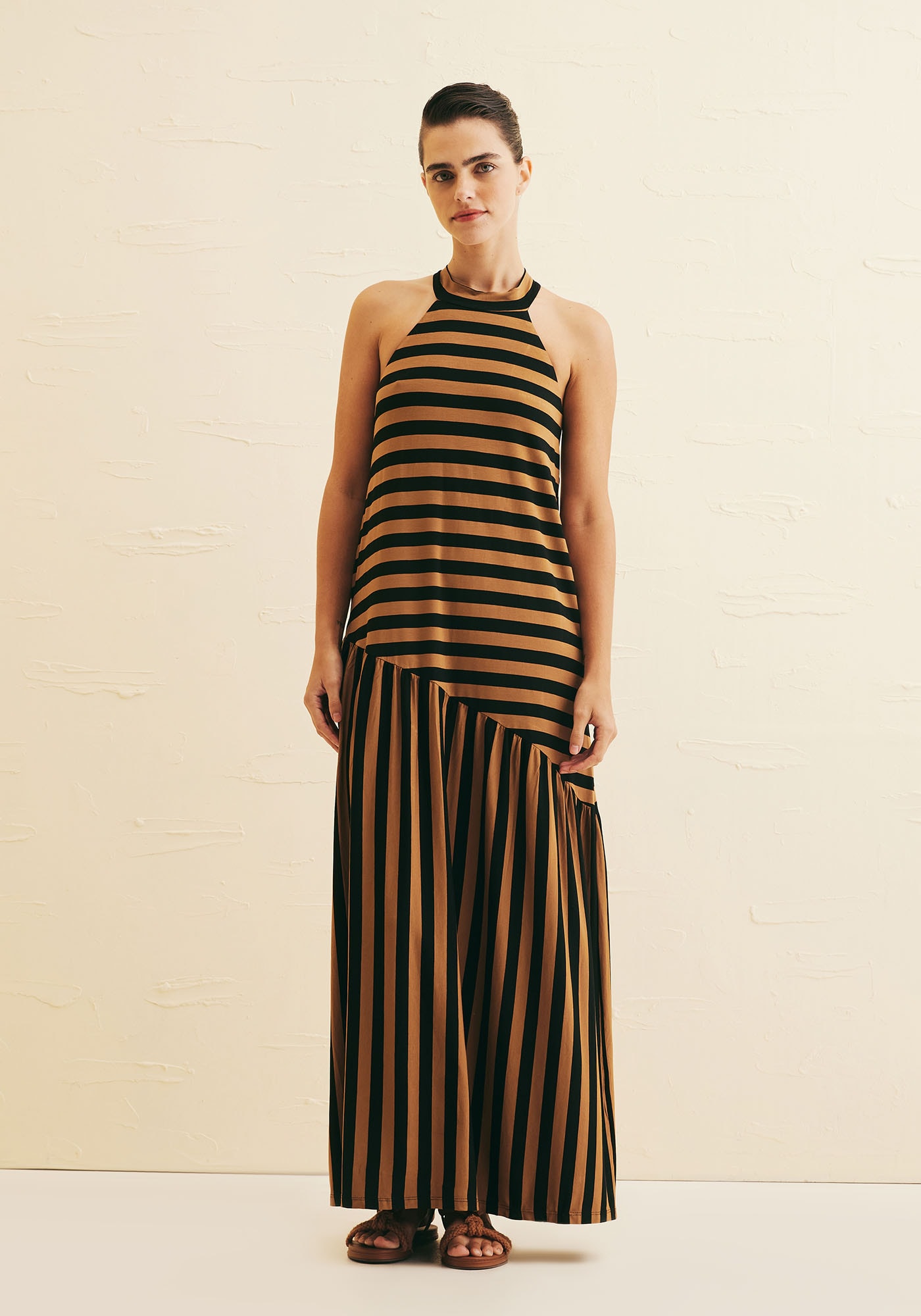Estevestido longo com combinação única de listas é confeccionado em malha eproporciona um visual moderno e elegante mantendo conforto e praticidade. Agola alta com amarração nas costas traz um toque de sofisticação enquanto amaria em recorte assimétrico torna a peça ainda mais estilosa. Seu tecido decomposição 96% Viscose 4% Elastano oferece conforto e um caimento perfeito.