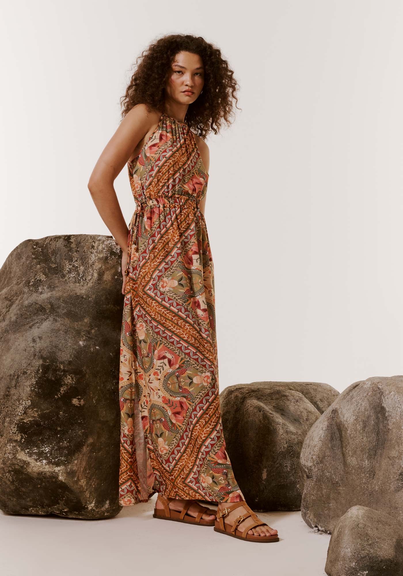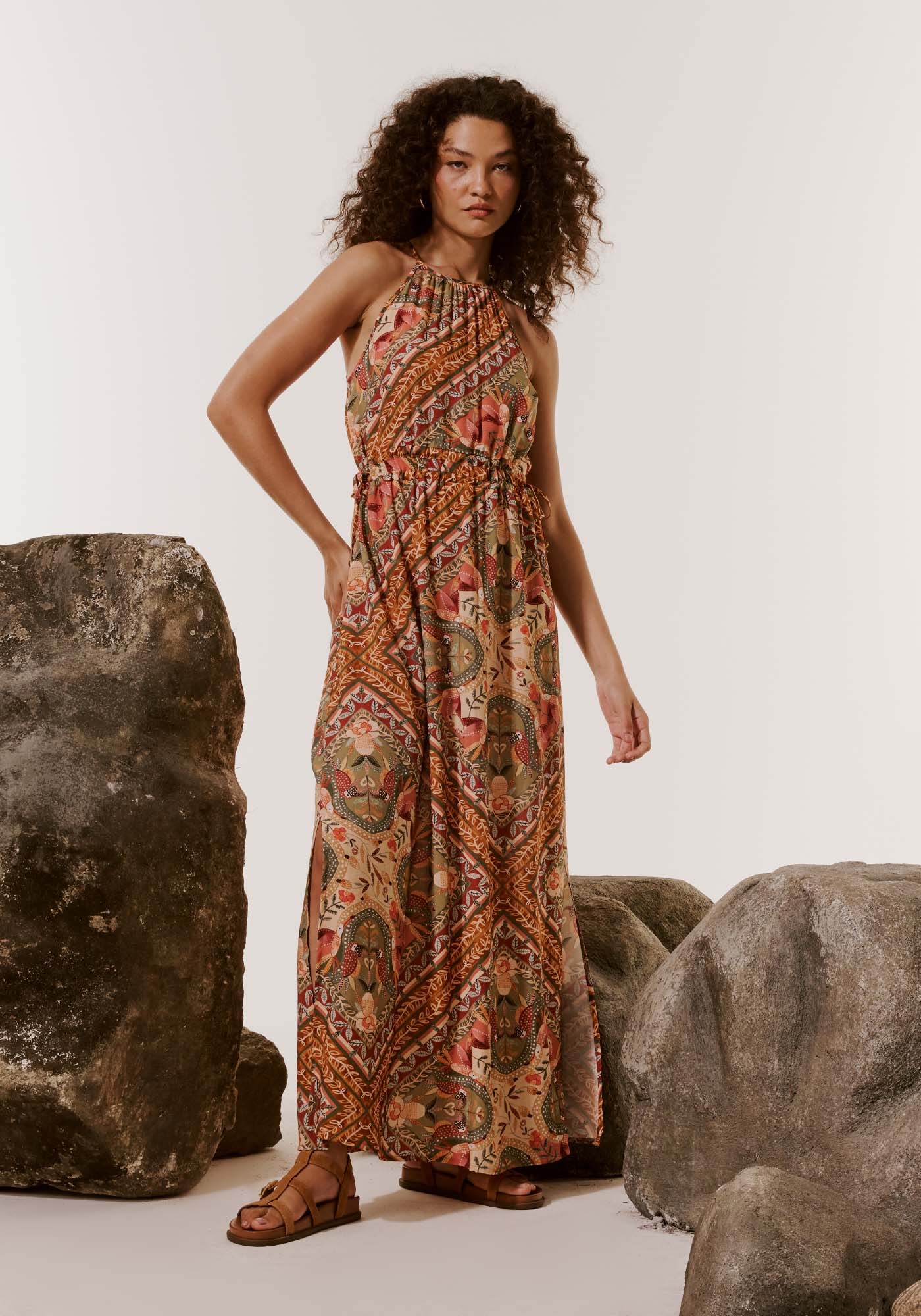 Confeccionado em tecido 100% viscose, o modelo possui decote altoe amarração em túnel na cintura. As fendas laterais deixam o vestido moderno esensual. A estampa Lenço Ipê composta por flores e aves se entrelaça de maneirarevolucionária, adicionando um toque de originalidade à peça.