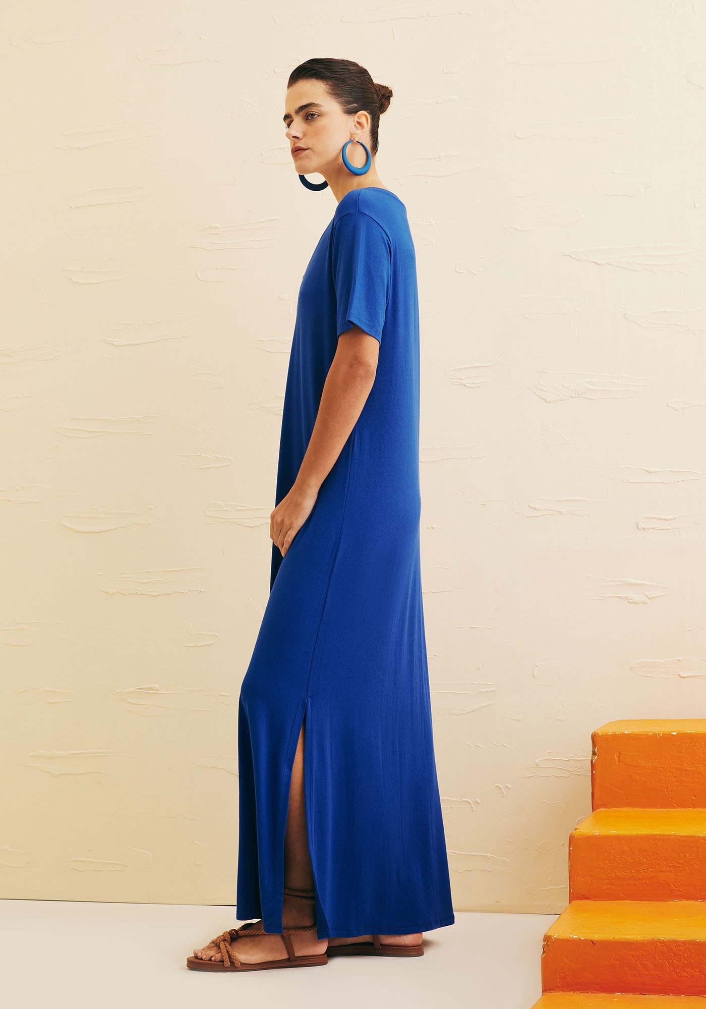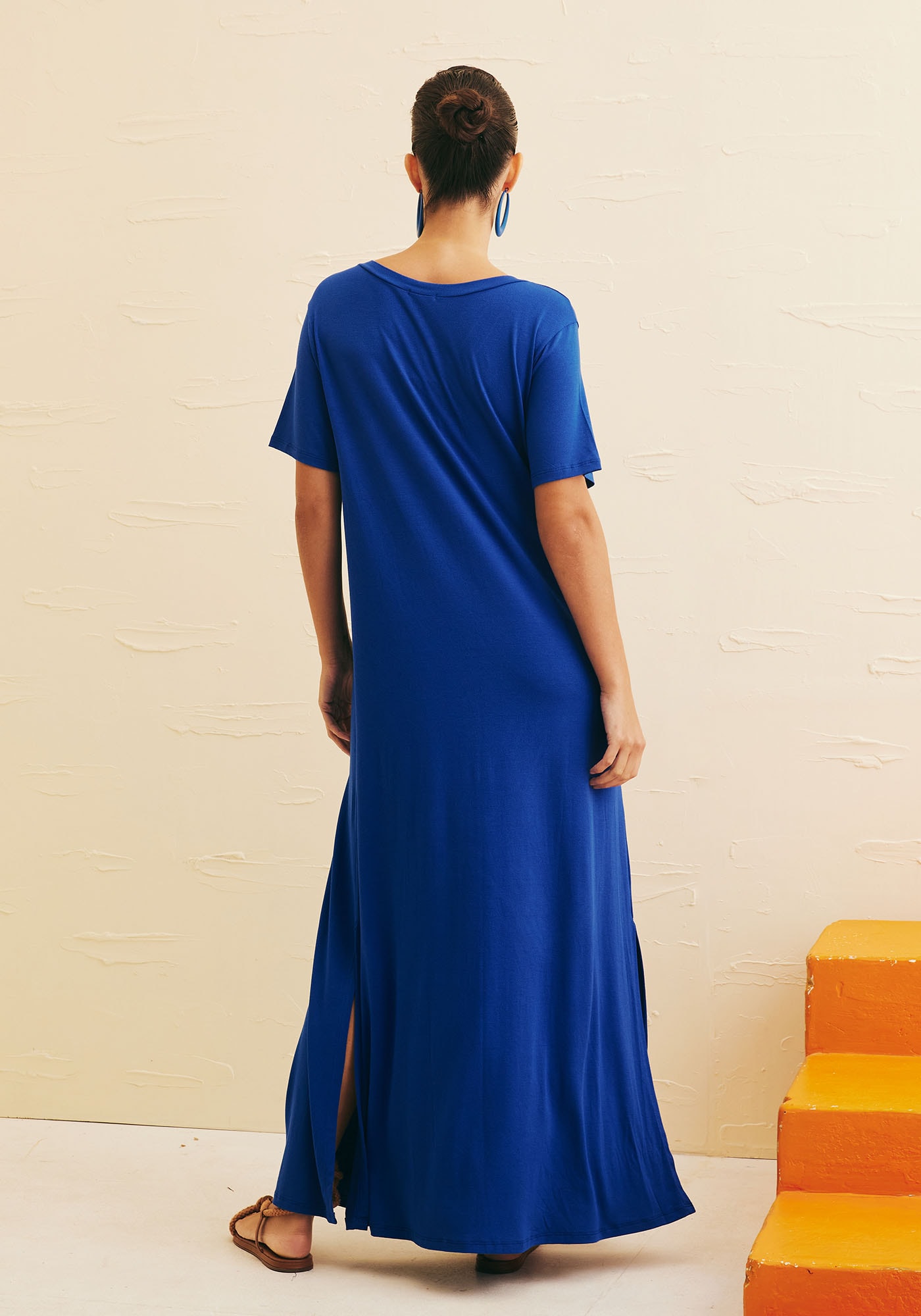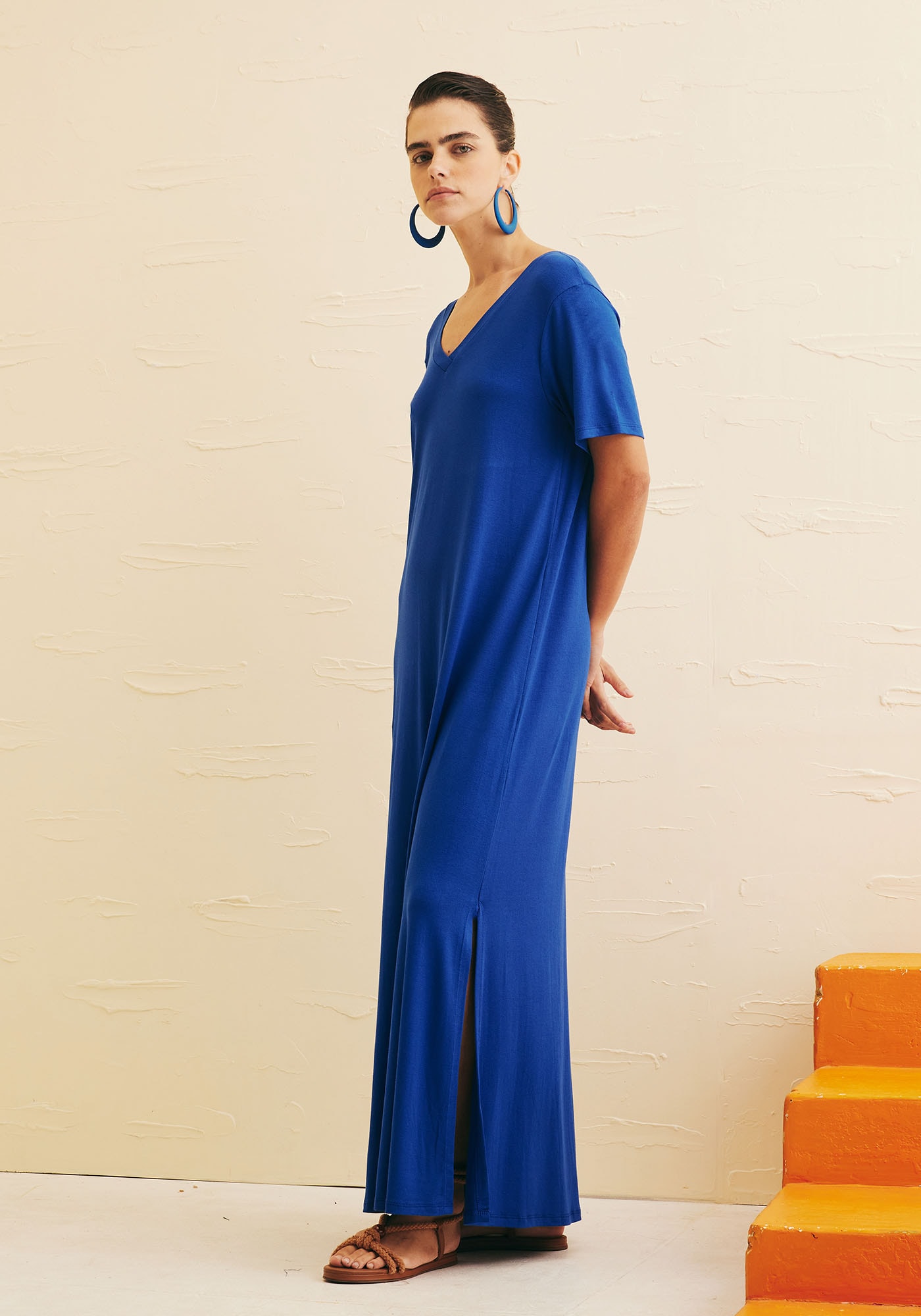 OVestido Longo Reto é a escolha ideal para quem busca um visual moderno eminimalista. Com decote V e mangas curtas, é uma peça que proporciona confortosem perder o estilo. As fendas laterais adicionam ainda mais movimento