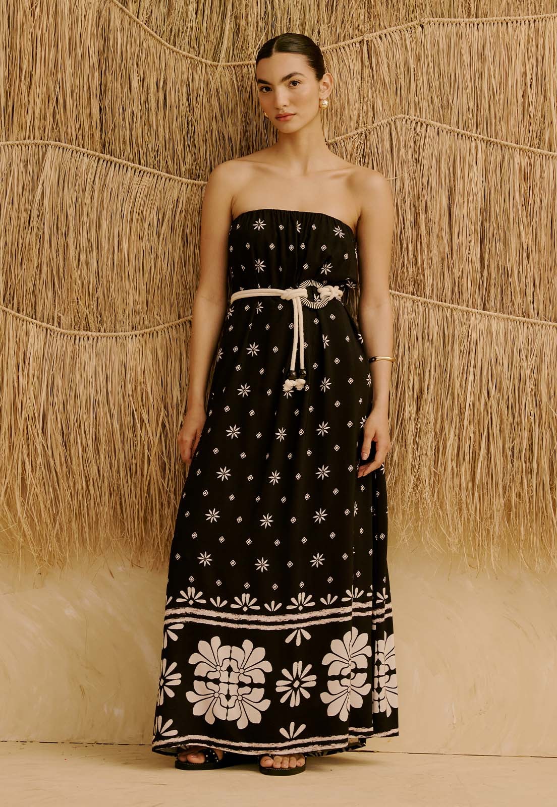 Confeccionado em 100% viscose, o tecido é leve, sem elasticidade e pensado para conforto prolongado, ideal para ocasiões casuais, trabalho ou eventos que pedem sofisticação acessível. A estampa adiciona um toque artesanal e atemporal, enquanto o cinto em corda traz personalidade ao visual. Versátil, combina bem com acessórios delicados, sandálias ou uma bolsa estruturada para compor looks que transitam entre o dia e a noite.