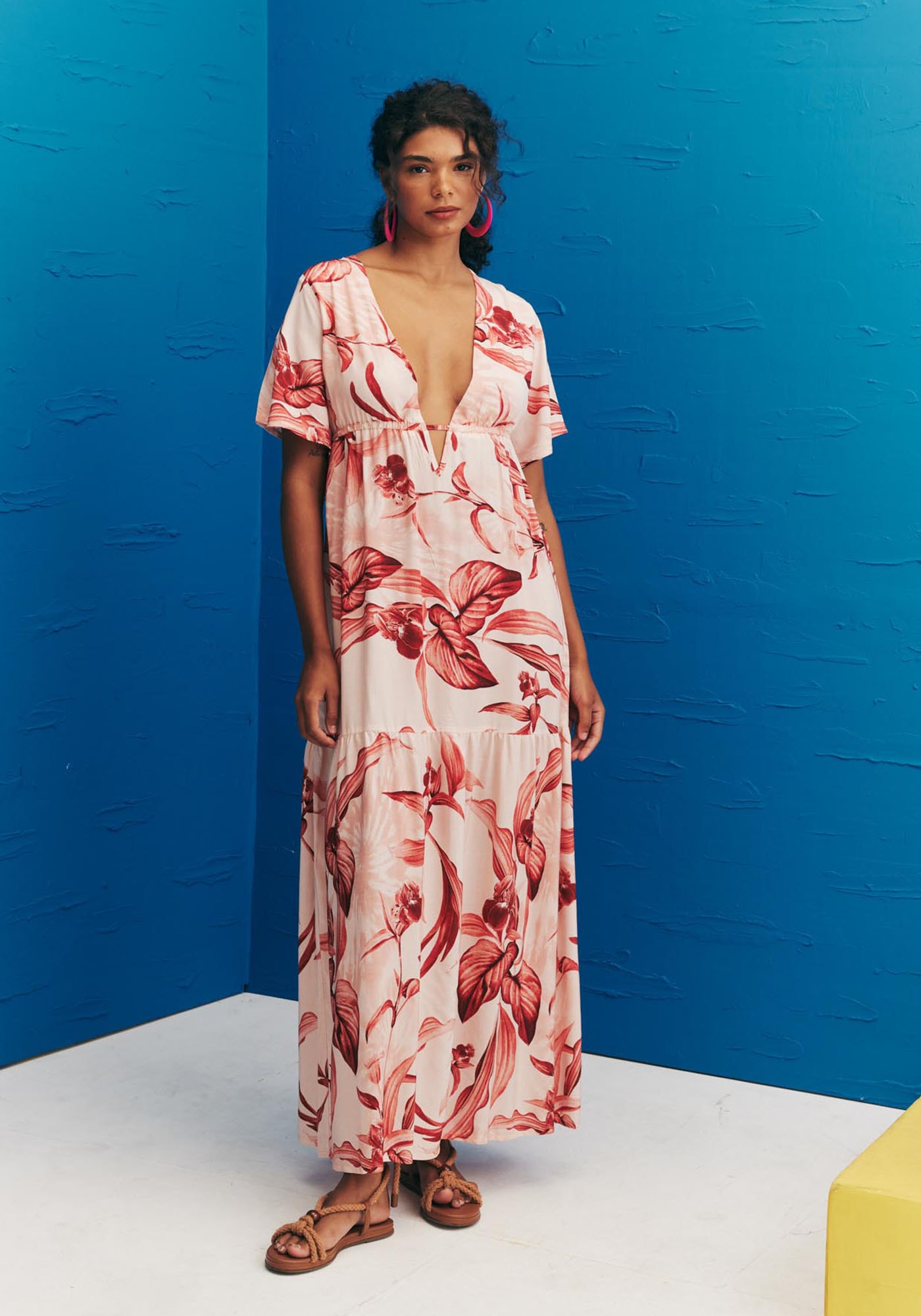 O vestido longo estampado Las Orquídeasé um charme. Confeccionado em tecido 100% viscose, o modelo possui decoteprofundo com túnel frontal. A manga ampla e o babado na barra deixam a peça commais movimento e leveza. O decote das costas é belíssimo e pode ser ajustadoatravés da amarração.