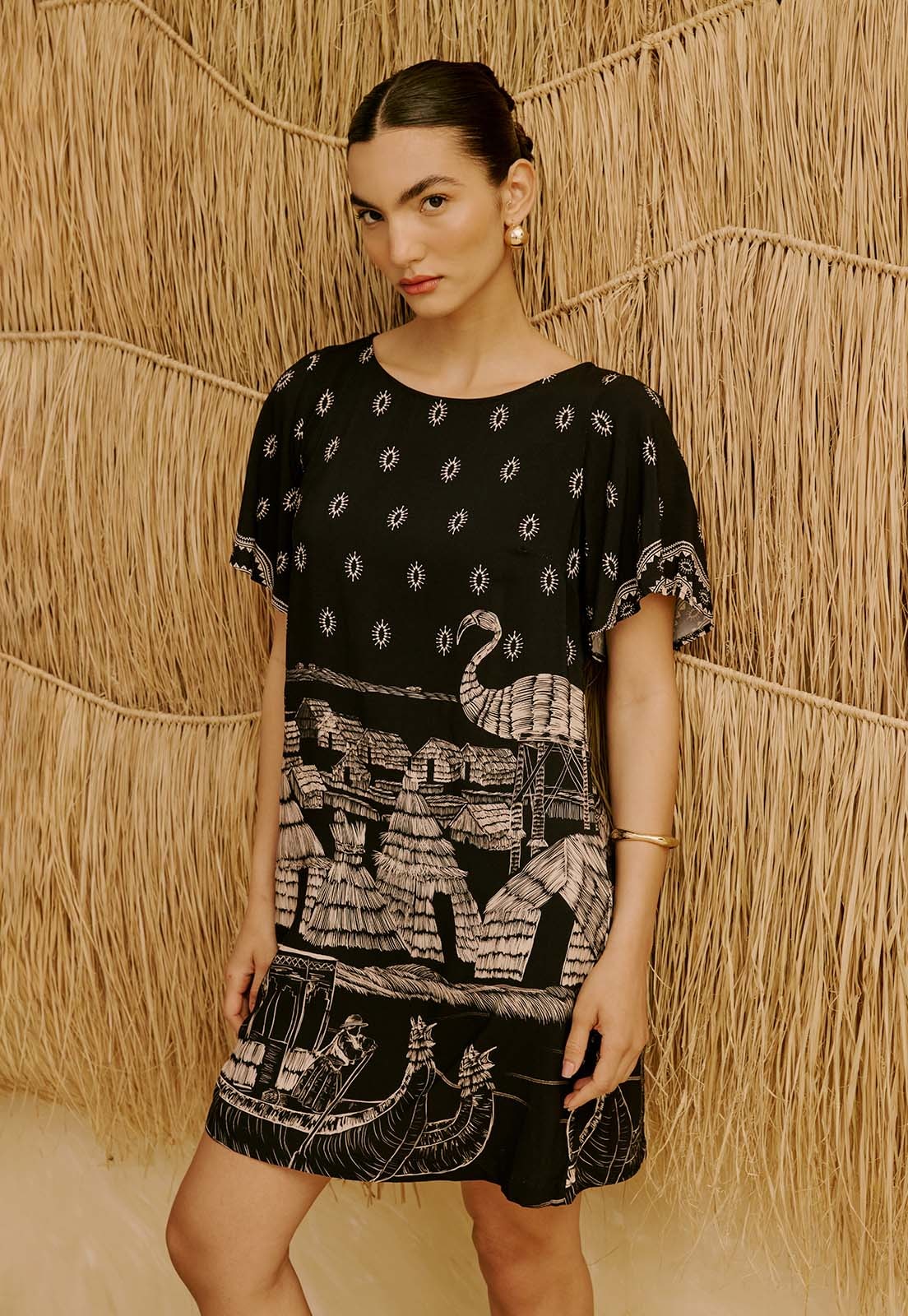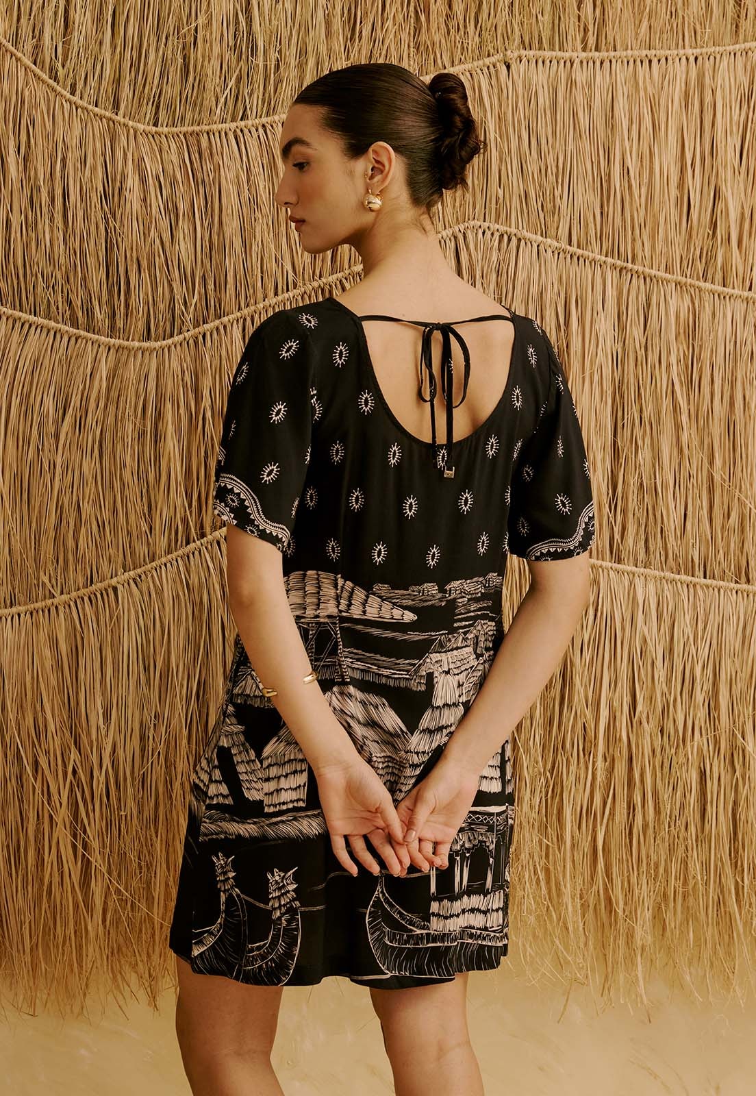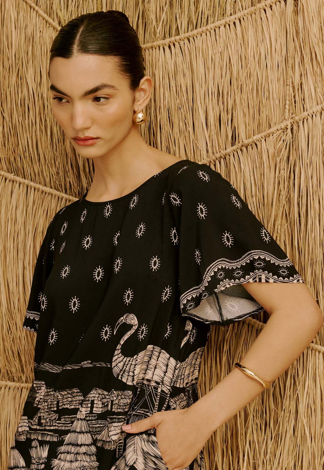 Confeccionado em 100% viscose, o vestido tem toque leve e é ideal para uso prolongado com frescor e liberdade. A estampa artística traz elementos inspirados em paisagens culturais, tornando a peça versátil para ocasiões casuais, trabalho ou eventos diurnos. Combine com acessórios naturais, sandálias ou tênis minimalistas para um look elegante e descomplicado.
