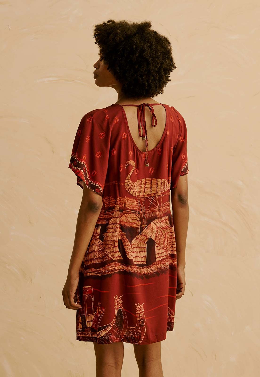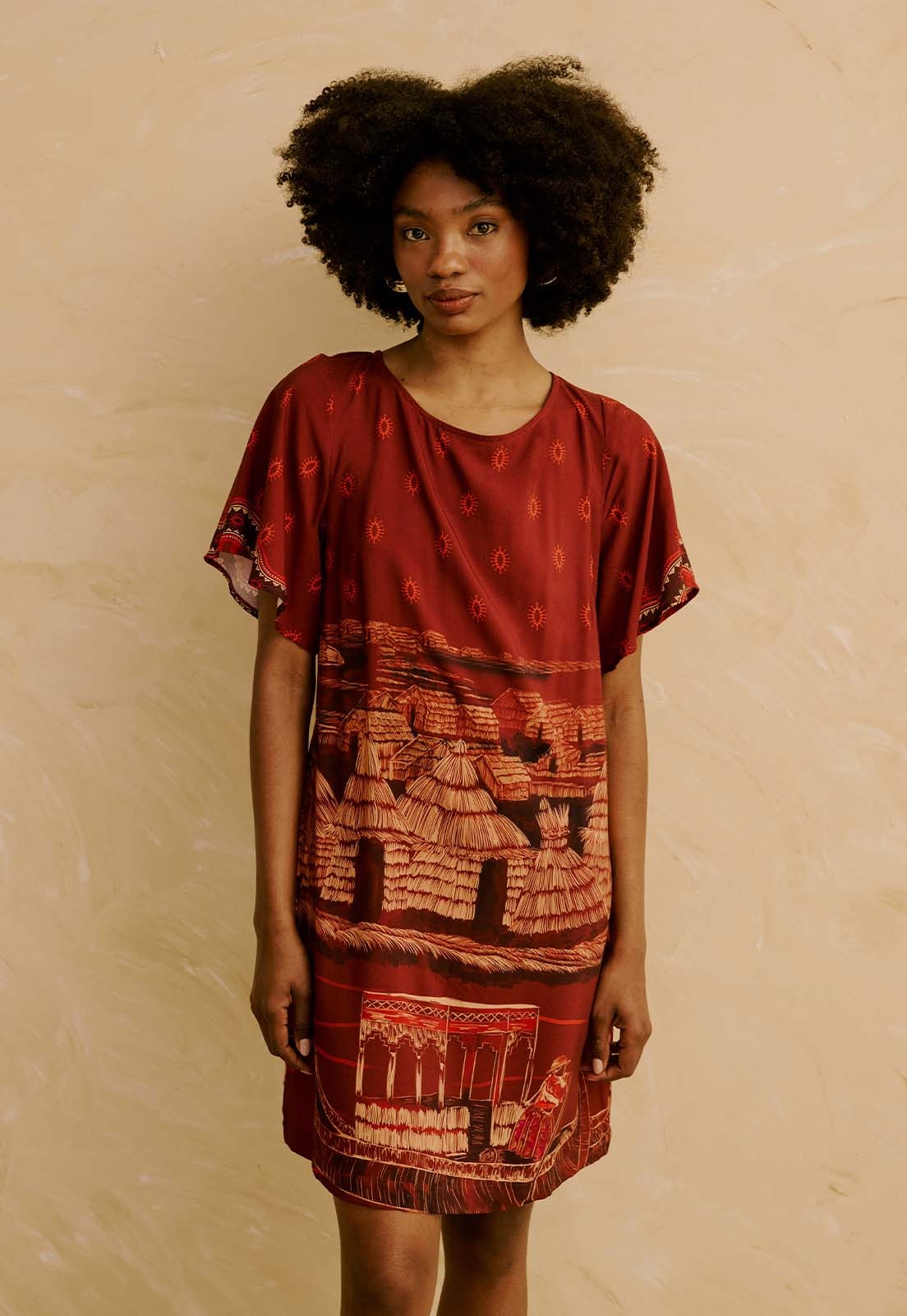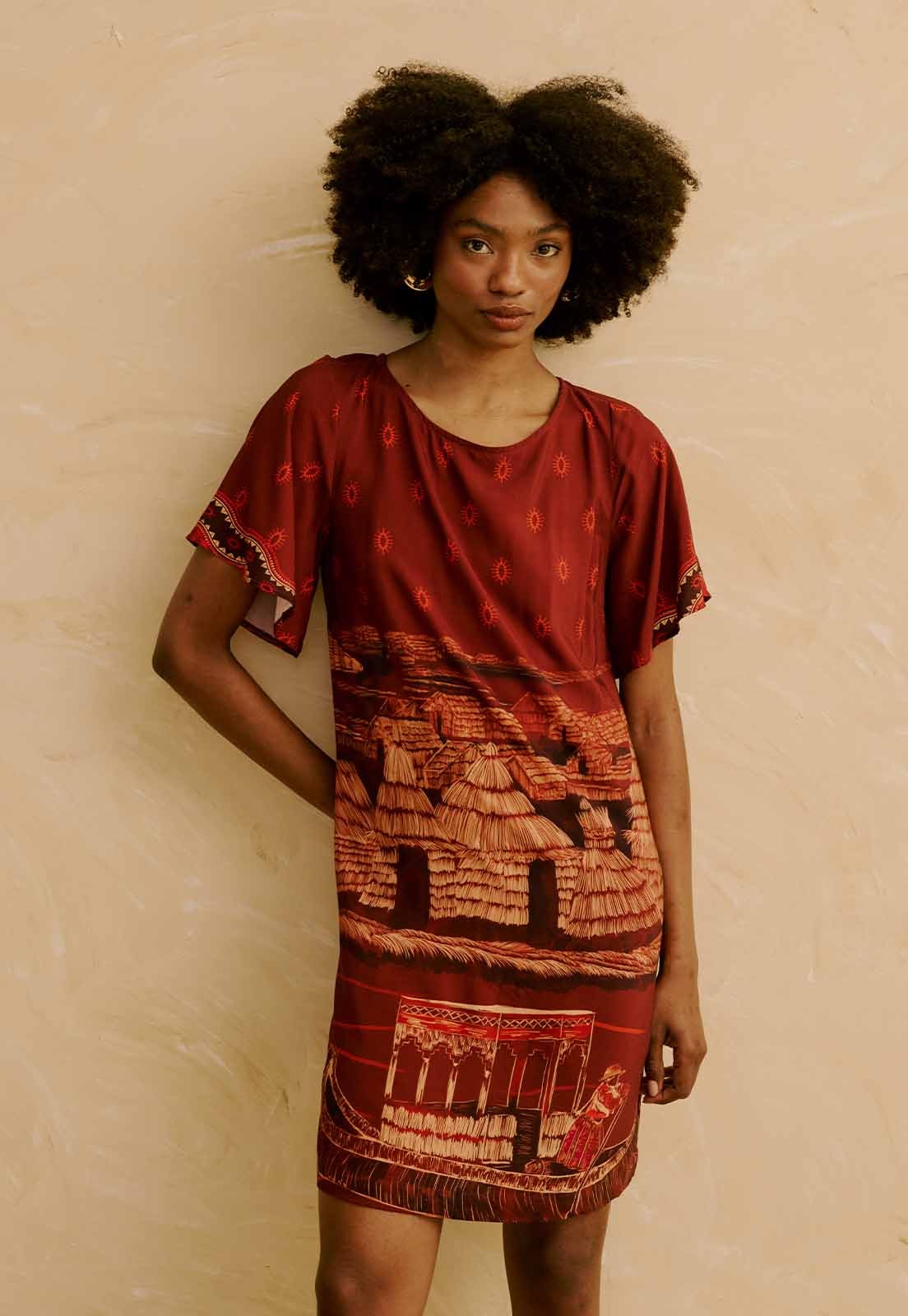 Confeccionado em 100% viscose, o vestido tem toque leve e é ideal para uso prolongado com frescor e liberdade. A estampa artística traz elementos inspirados em paisagens culturais, tornando a peça versátil para ocasiões casuais, trabalho ou eventos diurnos. Combine com acessórios naturais, sandálias ou tênis minimalistas para um look elegante e descomplicado.