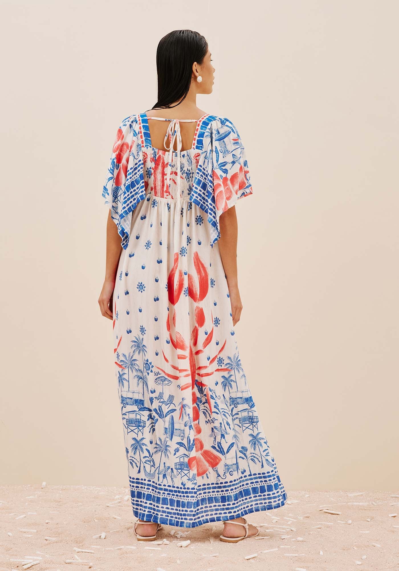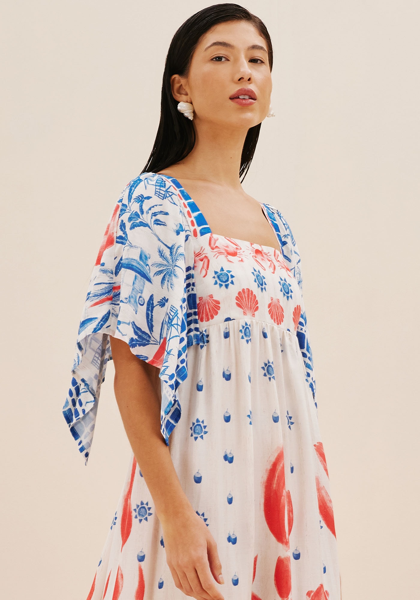 Confeccionado em tecido 97%viscose 3% linho, o vestido maxi midi é simplesmente maravilhoso. Com decotequadrado e lastex na parte de trás, o modelo possui um shape solto e fluído combastante movimento e com mangas abertas com pontas. A estampa Icapui é superdelicada e possui elementos que remetem ao verão e seus dias ensolarados.