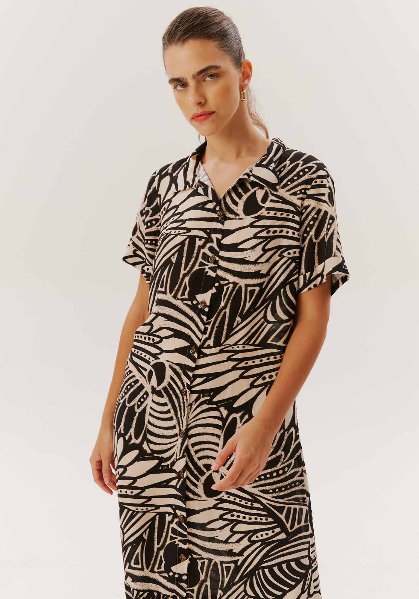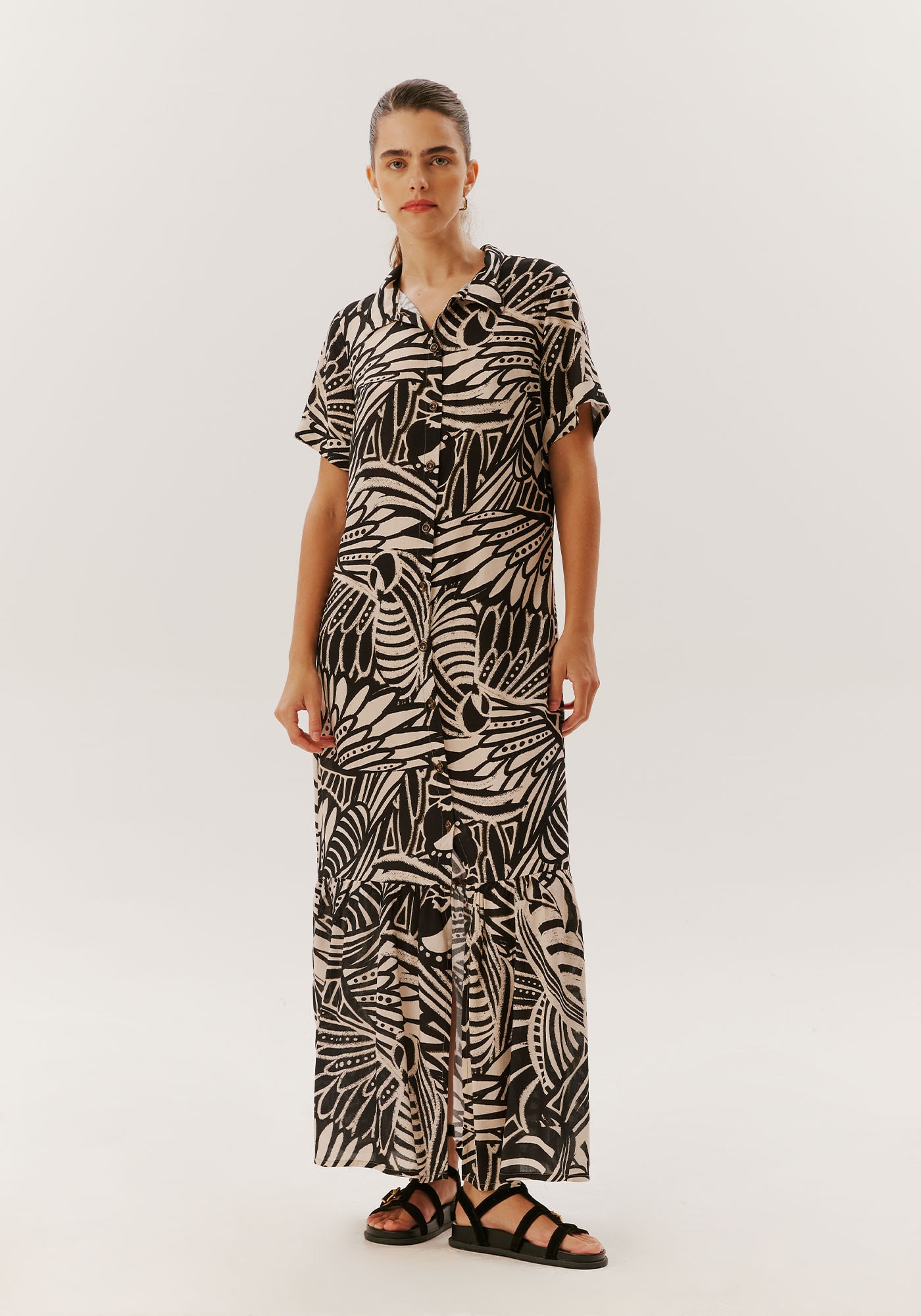 Este vestido maxi chemise em viscosedestaca-se pela versatilidade, podendo ser usado como blusa ou vestido.Finalizado com botões na frente, oferece praticidade e um toque elegante. Asmangas curtas complementam o design, tornando esta peça uma escolha moderna econfortável para diversas ocasiões.
