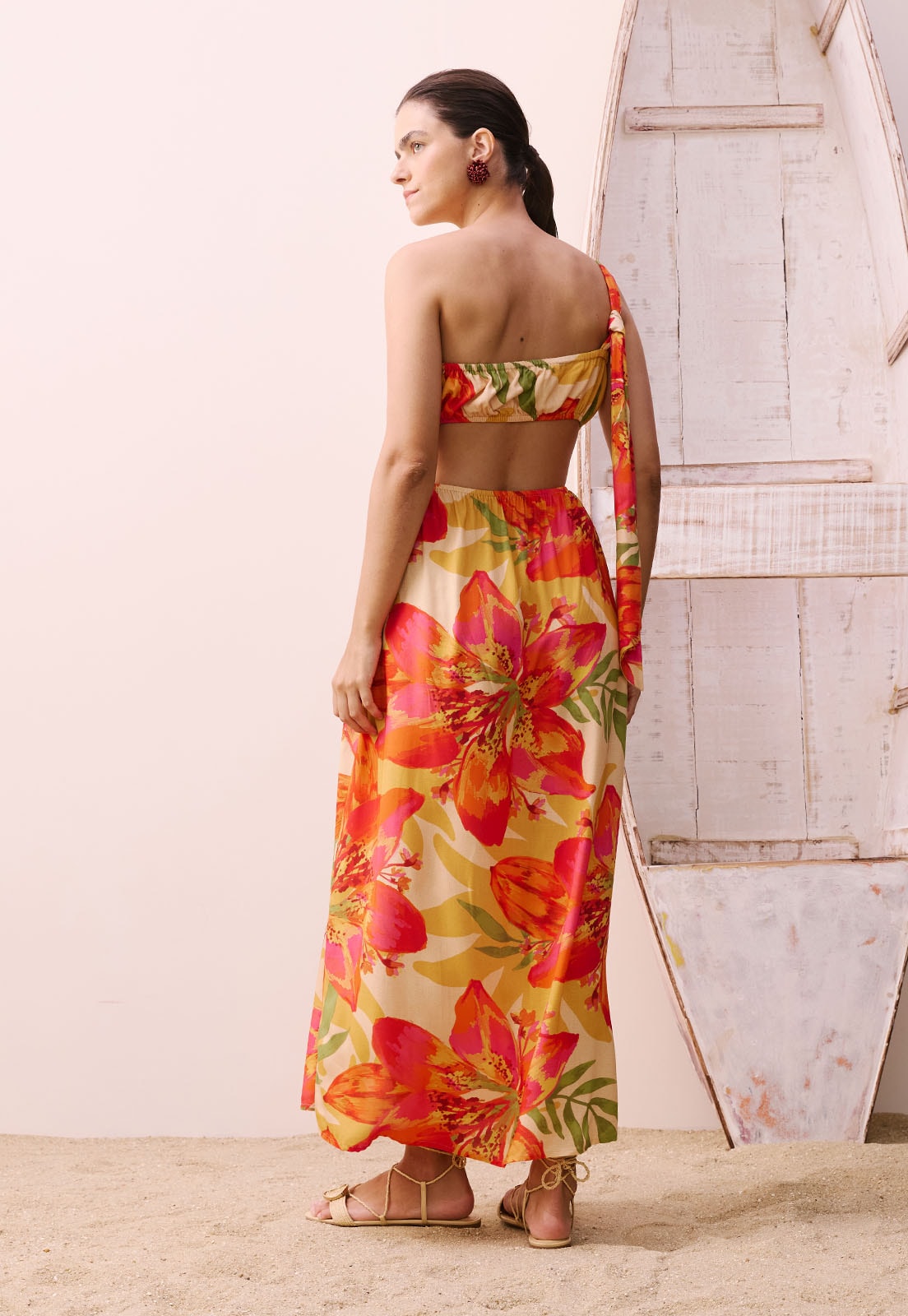 O Vestido Maxi Midi Cut Out Estampado Carimbó da CaCay é a expressão perfeita de leveza e sofisticação tropical. Com design assimétrico e recorte estratégico na cintura, ele valoriza a silhueta com elegância e frescor. A estampa exclusiva, inspirada em elementos orgânicos e movimentos fluidos, traz um toque artístico que transforma qualquer ocasião em um momento especial. Confeccionado em 100% viscose, o caimento é suave e confortável, ideal para dias quentes e eventos ao ar livre, como almoços, festas no jardim ou passeios à beira-mar.