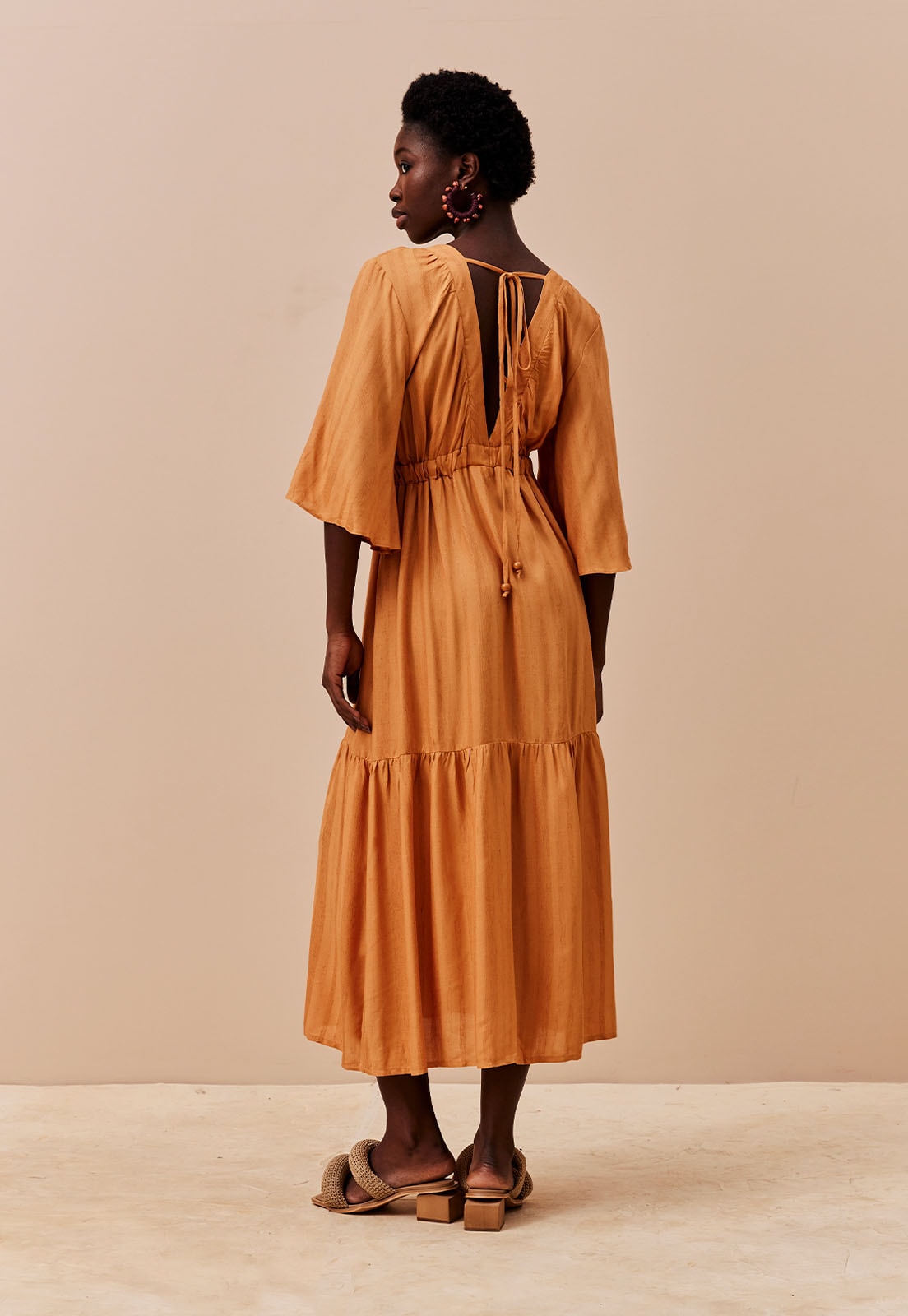 A abertura traseira com amarração adiciona um detalhe surpreendente e delicado, tornando a peça ainda mais versátil. Perfeito para momentos especiais ou produções casuais com toque refinado, o vestido combina bem com sandálias de tiras, bolsas estruturadas e acessórios minimalistas. A modelo veste tamanho P e tem 1,77m de altura, evidenciando o comprimento midi que favorece diferentes biotipos.