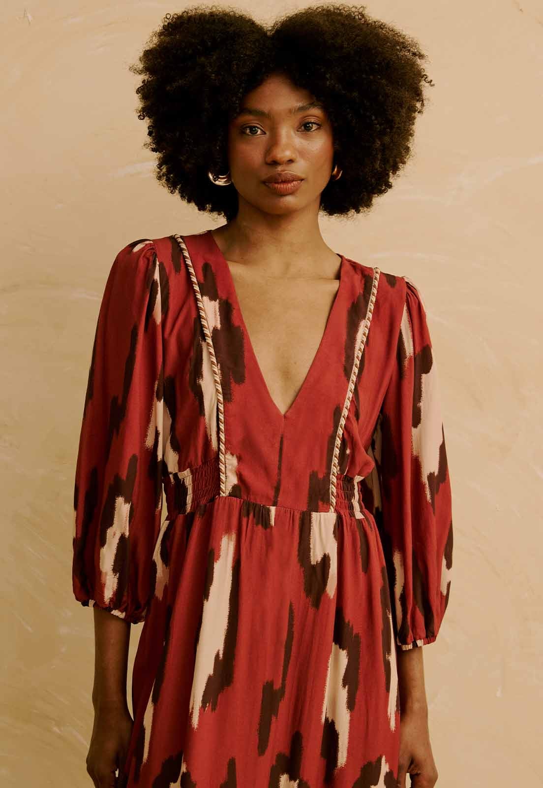 O Vestido Maxi Midi Detalhe Vivo Estampado Chimu Marrom da CaCay tem modelagem ampla e fluida, com caimento leve e confortável. A peça valoriza a cintura com faixa ajustável e acompanha o contorno do quadril sem marcar (não acompanha o cinto). O comprimento alongado traz elegância e movimento. A forma é grande. Se estiver em dúvida entre dois tamanhos, recomendamos optar pelo menor, considerando a tabela de medidas. A modelo da foto tem 1,75 m, veste manequim 36 e está usando o tamanho P.