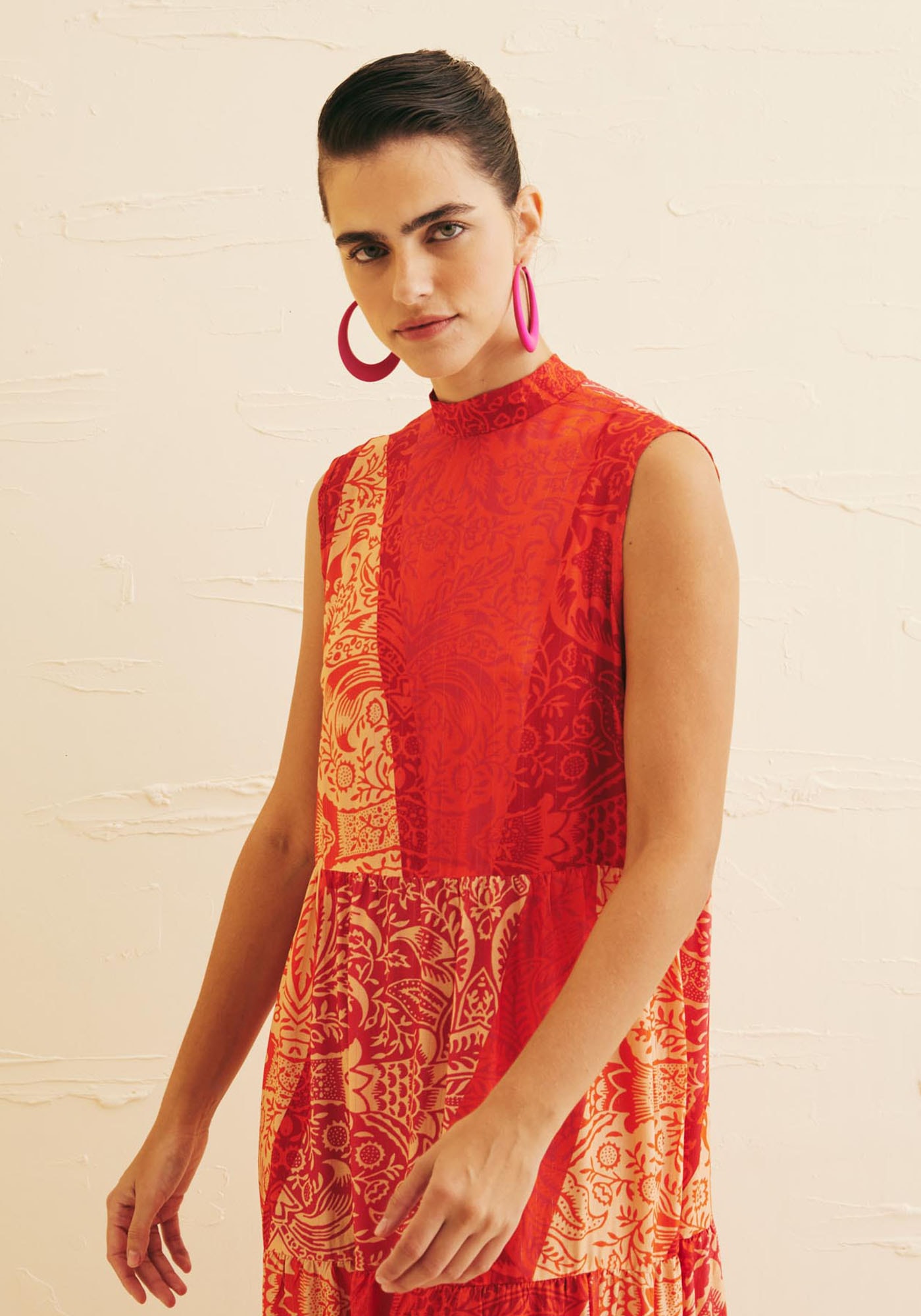 O Vestido Maxi Midi C/ MariasEstampado Nueva Cancion é a peça perfeita para um visual sofisticado e moderno.Com sua gola alta que adiciona um toque de elegância, o vestido apresenta umdesign amplo e suas três marias conferem ao modelo bastante movimento, leveza efeminilidade. A amarração na parte de trás da gola traz um detalhe charmoso àpeça. Seu tecido tem composição de 99% Viscose e 1% Poliéster