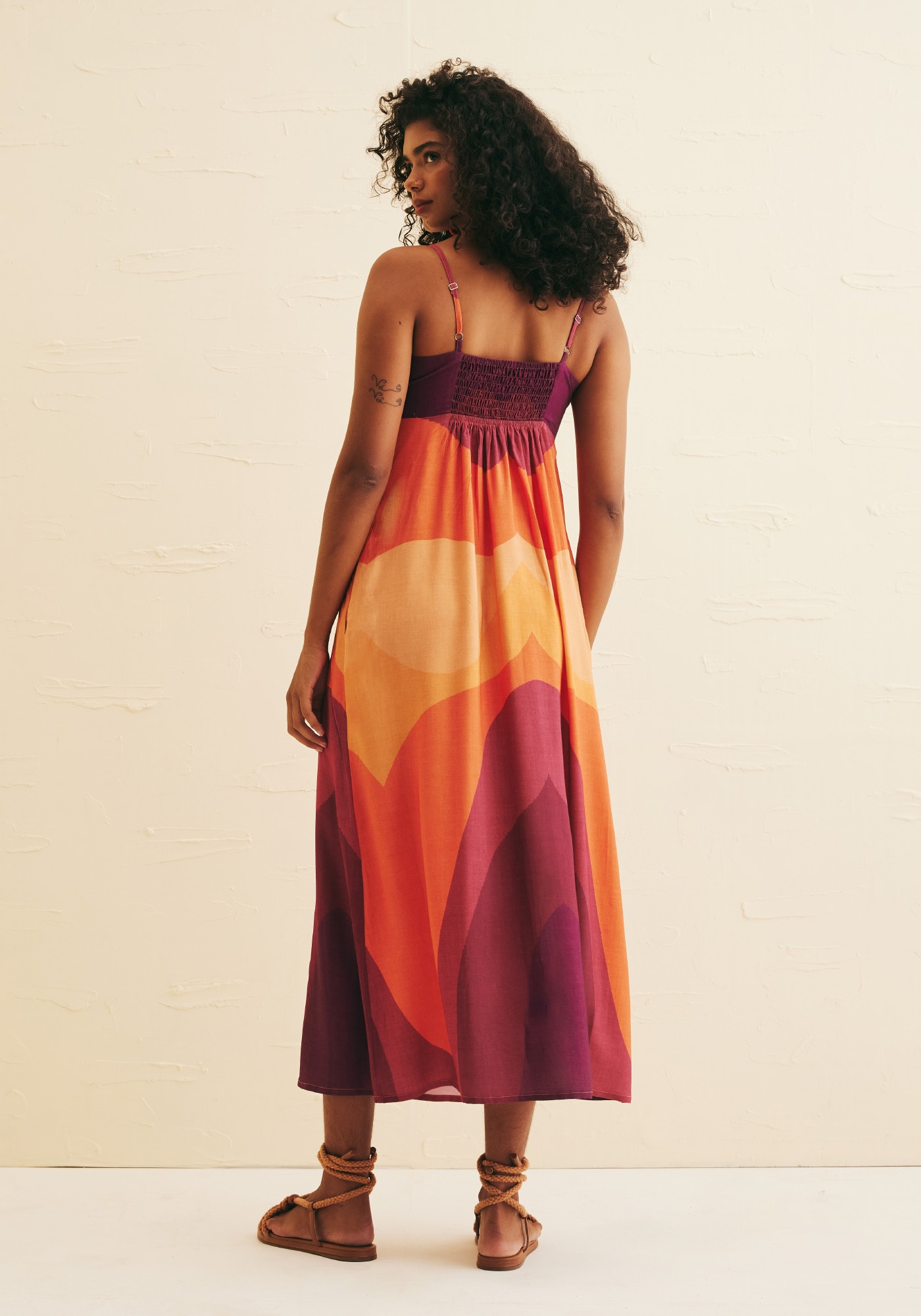 O Vestido Alcinha Midi éperfeito para quem busca conforto, estilo e praticidade. Seu busto possuimodelagem mais ajustada com decote frontal que valoriza o colo, enquanto suascostas são em lastex permitindo um ajuste ideal ao corpo e mantendo o conforto.A saia do vestido tem modelagem evasê trazendo elegância e sofisticação e aomesmo tempo praticidade com seu comprimento midi. Seu destaque se dá pelaencantadora estampa Las Coloradas, em tons de laranja e roxo e com formasmodernas que adicionam mais estilo ao look.