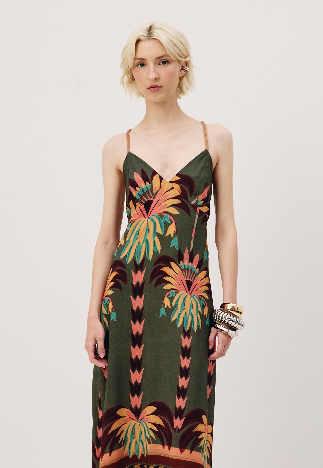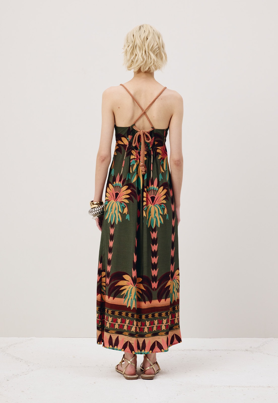 O vestido midi estampado Maimara é confeccionado em tecido 100% viscose.É um modelo com alça em corda e amarração nas costas. Possui uma modelagem ampla com decote justo ao corpo,valorizando a silhueta.