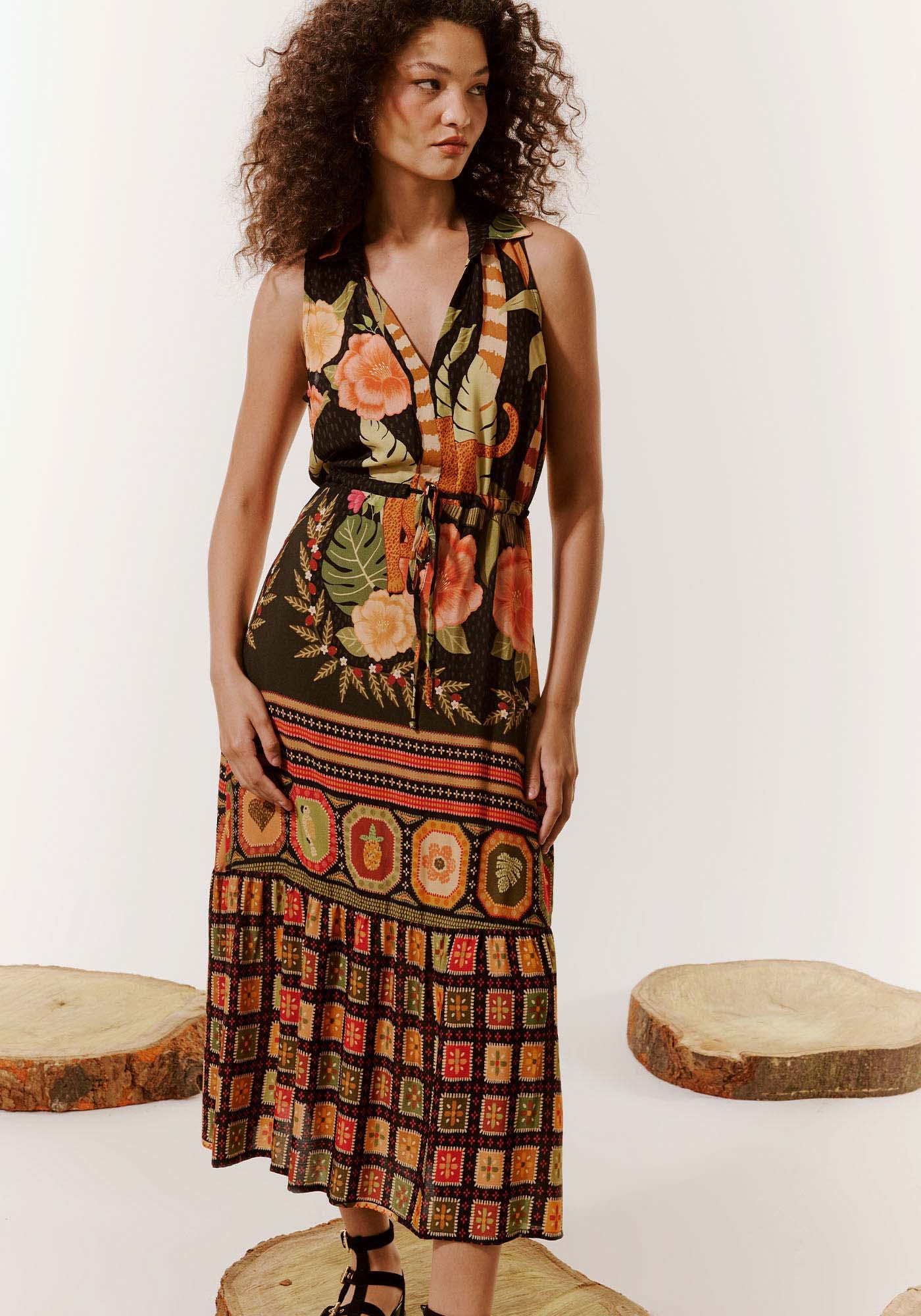 O vestidocom amarração é um modelo estampado sofisticado. Confeccionado com comprimentomidi e tecido 100% viscose, é um modelo sem manga, com decote em V e golinha. Oshape fica mais elegante com a amarração em túnel na cintura. A estampa Pequi éuma homenagem à fauna e a flora brasileira e suas cores ganham mais destaquecom o fundo preto.