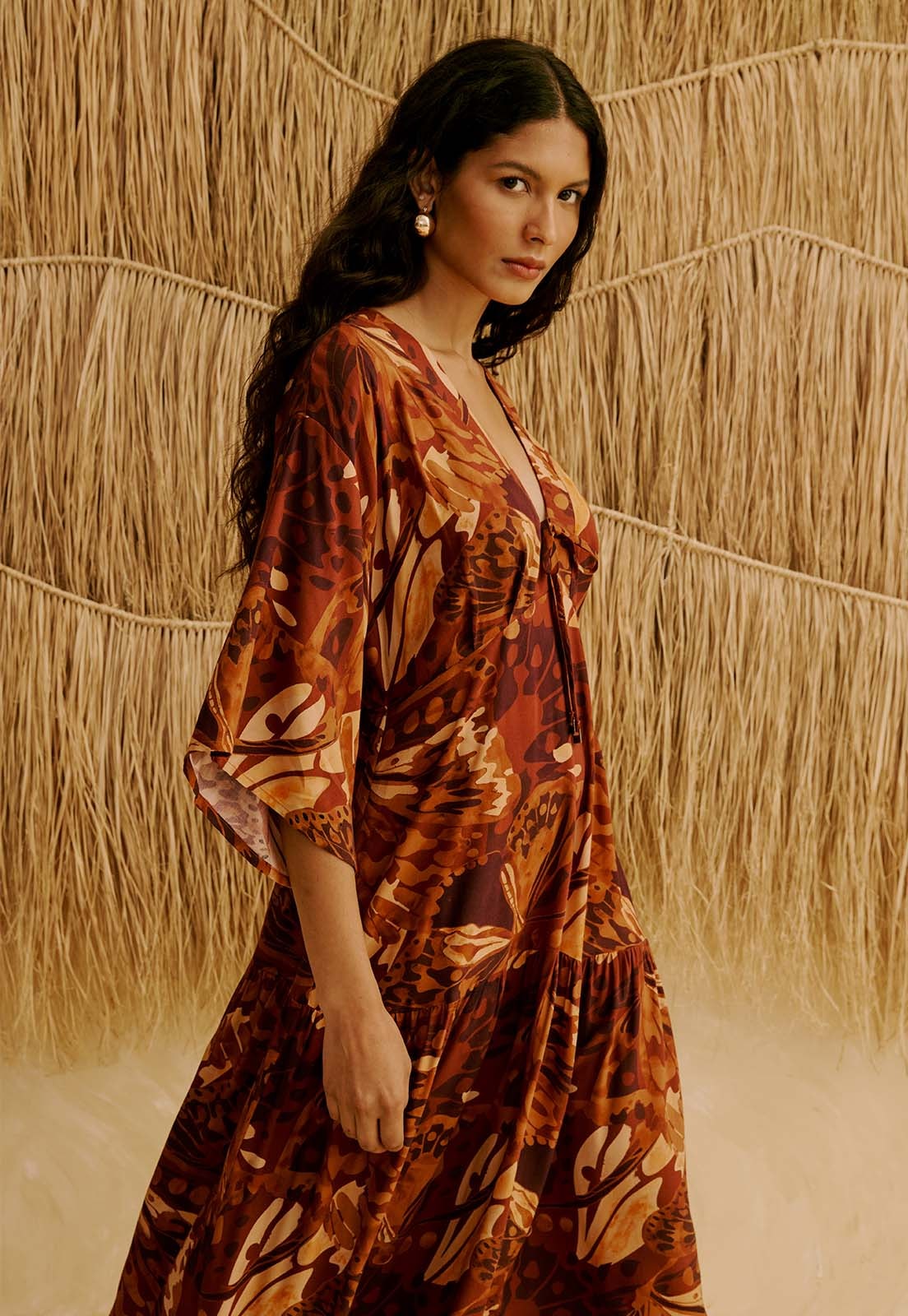 O Vestido Midi Babados Estampado Borbo Boho da CaCay traz uma modelagem fluida e elegante, com caimento suave, cintura levemente marcada e saia que acompanha o quadril, garantindo movimento natural até o comprimento midi. A forma de tamanho é grande. Se estiver em dúvida entre dois números, recomenda-se optar pelo menor, sempre conferindo a tabela de medidas. A modelo da foto tem 1,75m de altura, veste manequim 36 e usa o tamanho P.
