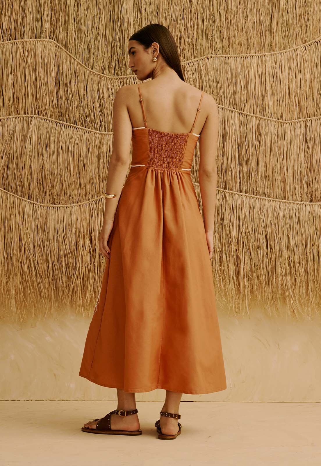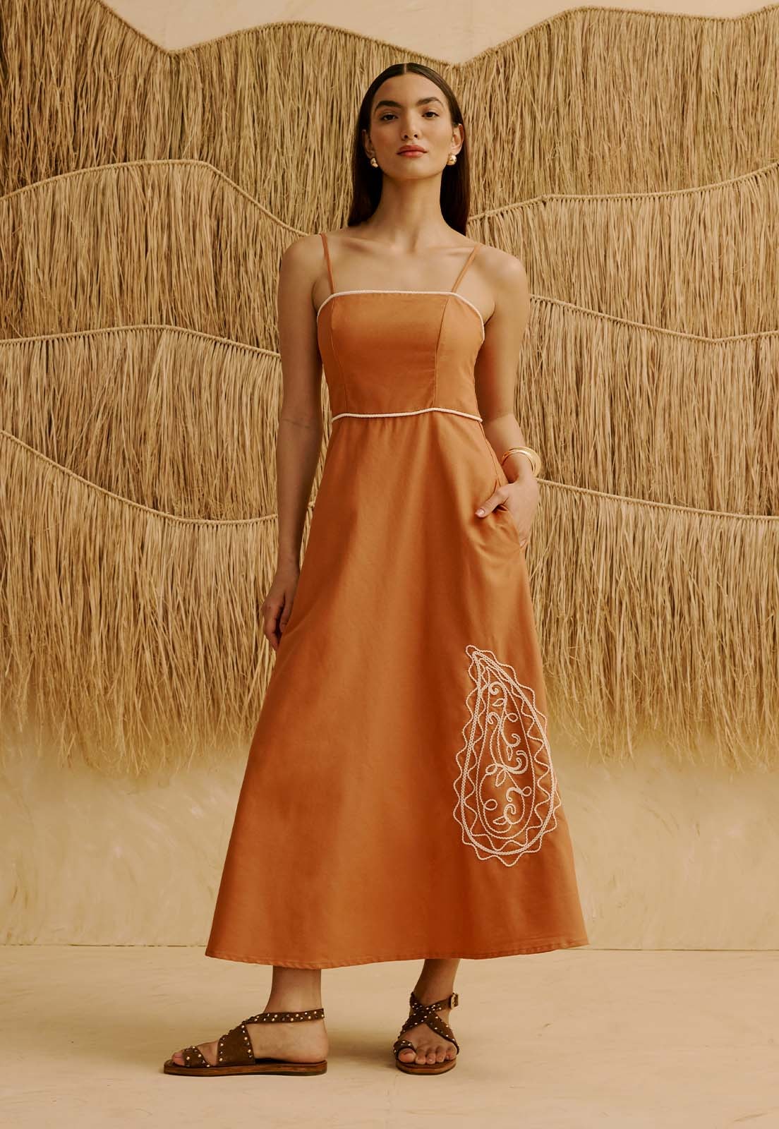 O Vestido Midi Bordado Cashmere da CaCay tem modelagem levemente evasê, com caimento solto no quadril e comprimento que acompanha o movimento do corpo. O busto é ajustado com delicadeza, graças ao lastex nas costas e às alças finas reguláveis. A cintura é suavemente marcada e o bordado em estilo cashmere próximo à barra adiciona um toque artesanal ao visual. A modelo da foto tem 1,75m, veste manequim 36 e está usando o tamanho P. A forma é grande. Se estiver em dúvida entre dois tamanhos, sugerimos escolher o menor, com base na tabela de medidas.