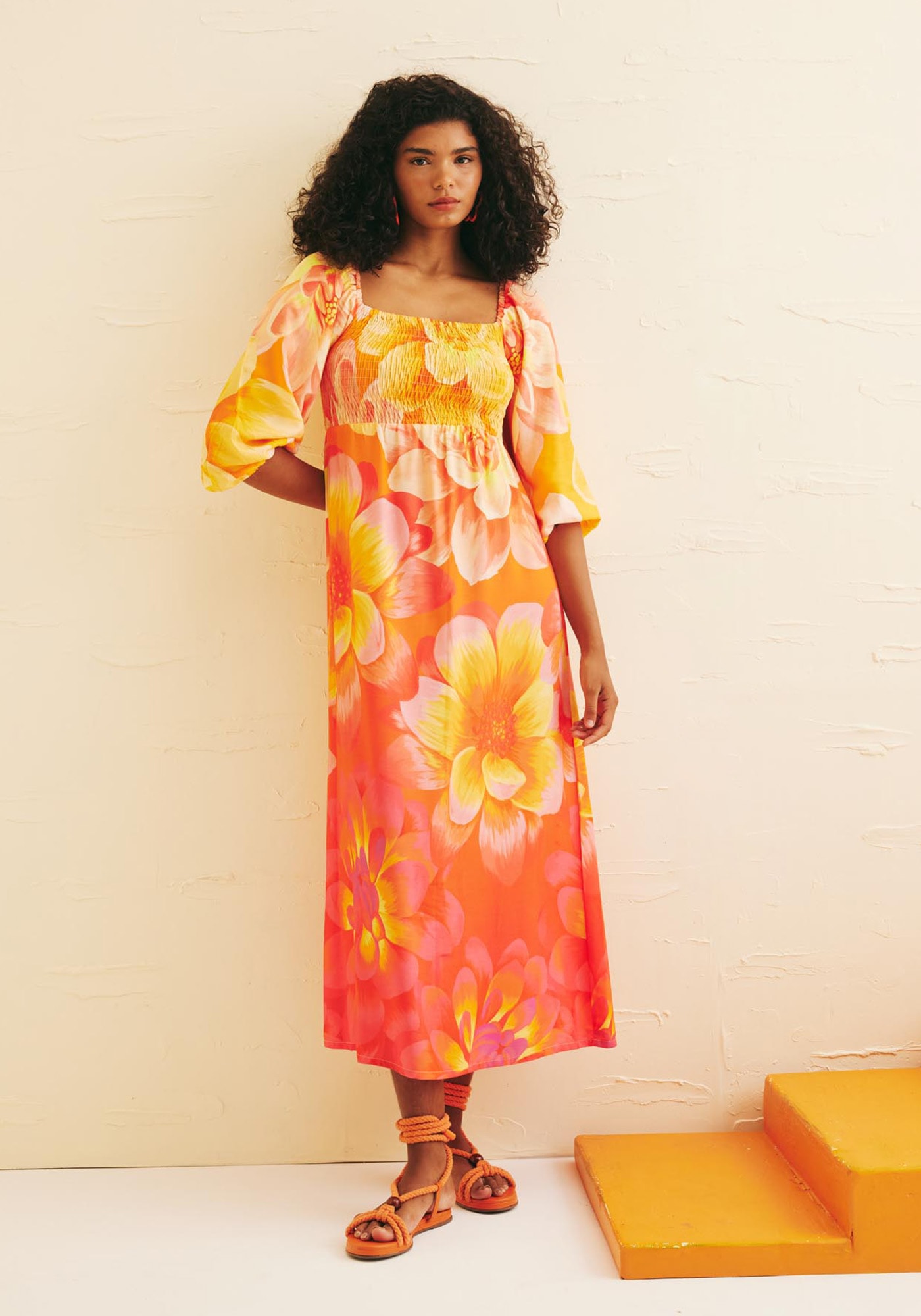 Oencantador Vestido Midi Busto Lastex Estampado Dalia é a escolha certa paraquem deseja um look delicado e feminino. Com mangas bufantes, este modelo possuia parte do busto em lastex proporcionando muito conforto e um ajuste ideal aocorpo. O decote quadrado e a saia evasê acrescentam um toque de elegância e sofisticação,com um caimento perfeito. Confeccionado em 100% viscose, este vestido é idealpara diversas ocasiões, trazendo um visual com leveza, movimento e feminilidade.