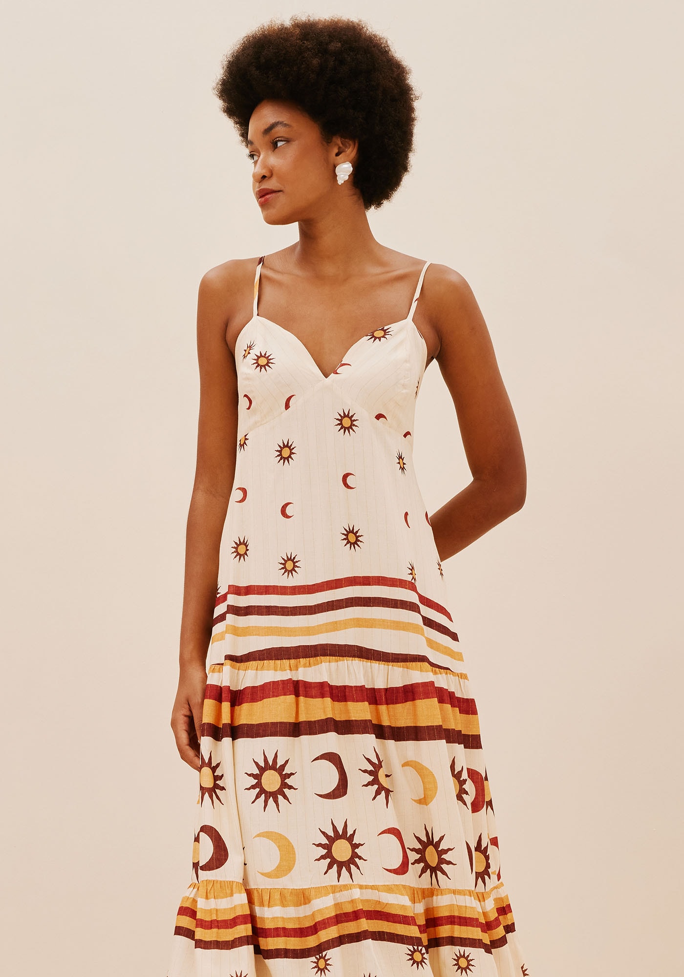 Este Vestido Midi é a escolhaideal se você busca uma peça clássica com um toque de feminilidade eromantismo. As alças finas são ajustáveis e o decote coração valoriza a regiãodo busto, enquanto as duas marias presentes na saia adicionam leveza e movimento.Possui lastex na parte das costas garantindo conforto e um ajustepersonalizado, e é confeccionada em 99% Viscose e 1% Poliéster.