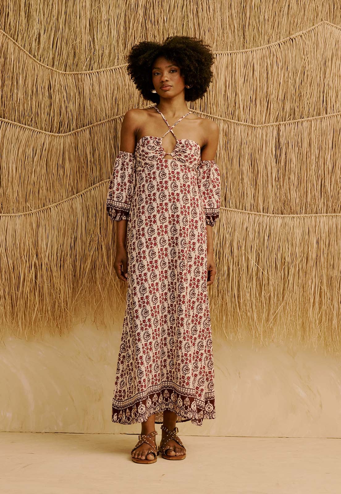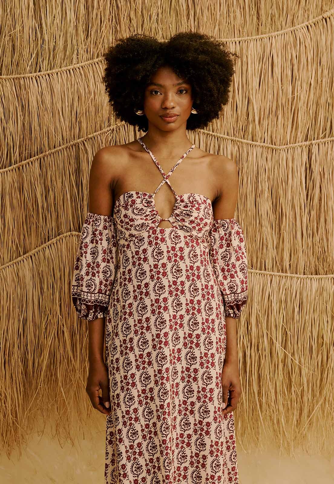 Confeccionado em viscose com poliamida e algodão, o vestido é leve, sem elasticidade, pensado para uso prolongado com conforto e bem-estar. Versátil, transita entre ocasiões casuais, trabalho ou encontros diurnos, sempre com estilo feminino e sofisticado. A estampa adiciona um toque artesanal e atemporal. Combine com sandálias rasteiras, acessórios naturais ou uma bolsa estruturada para compor looks que respiram leveza.