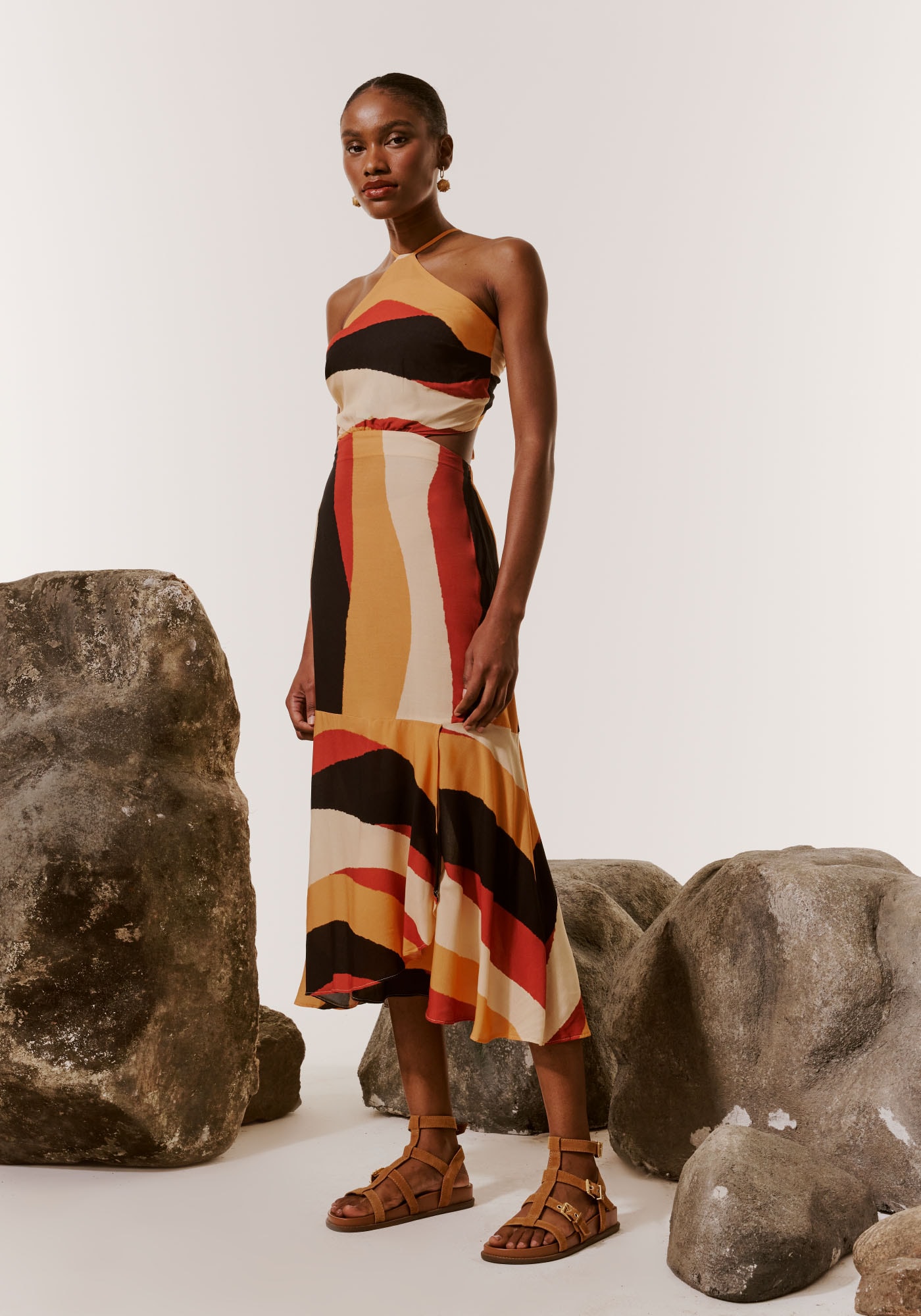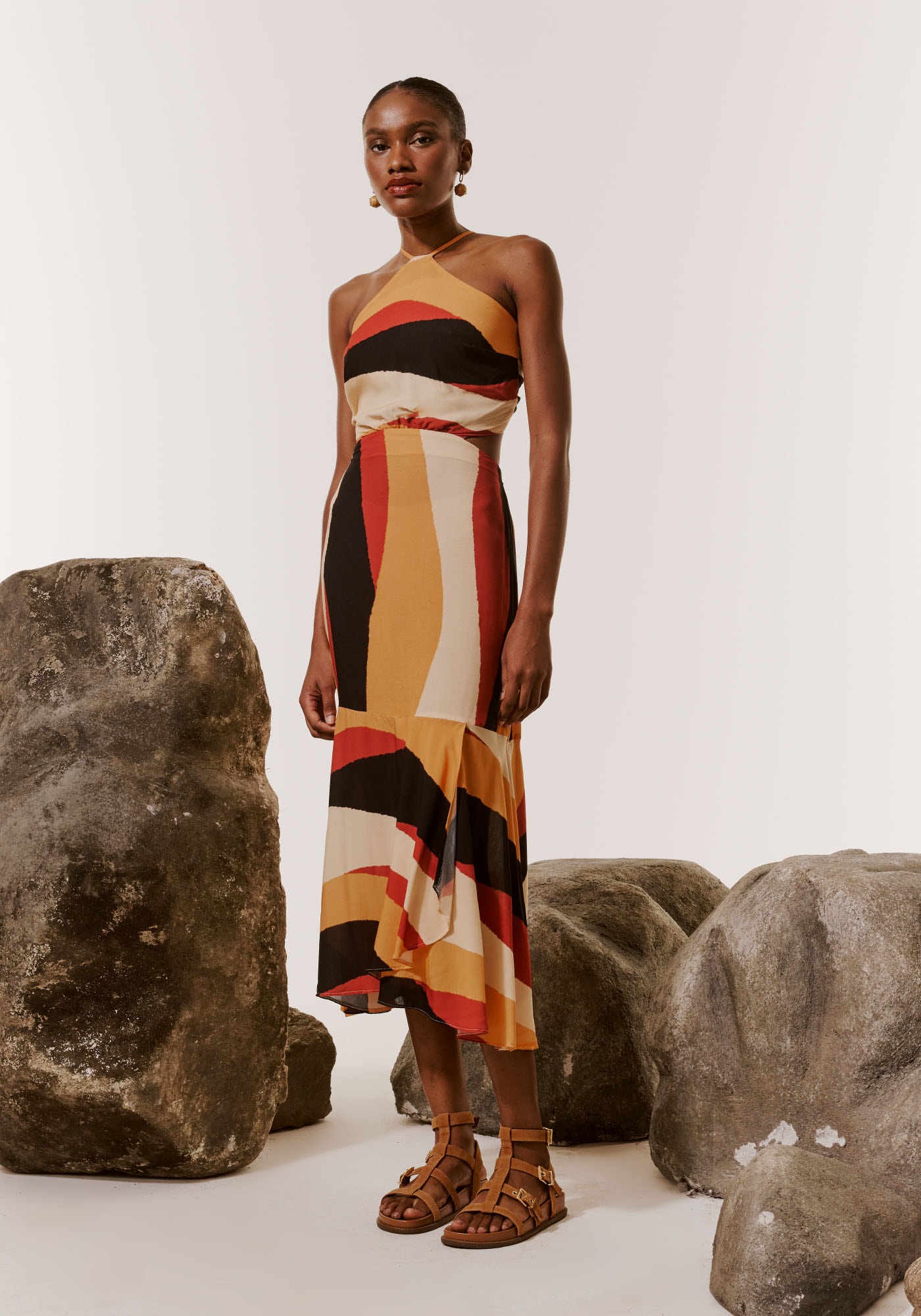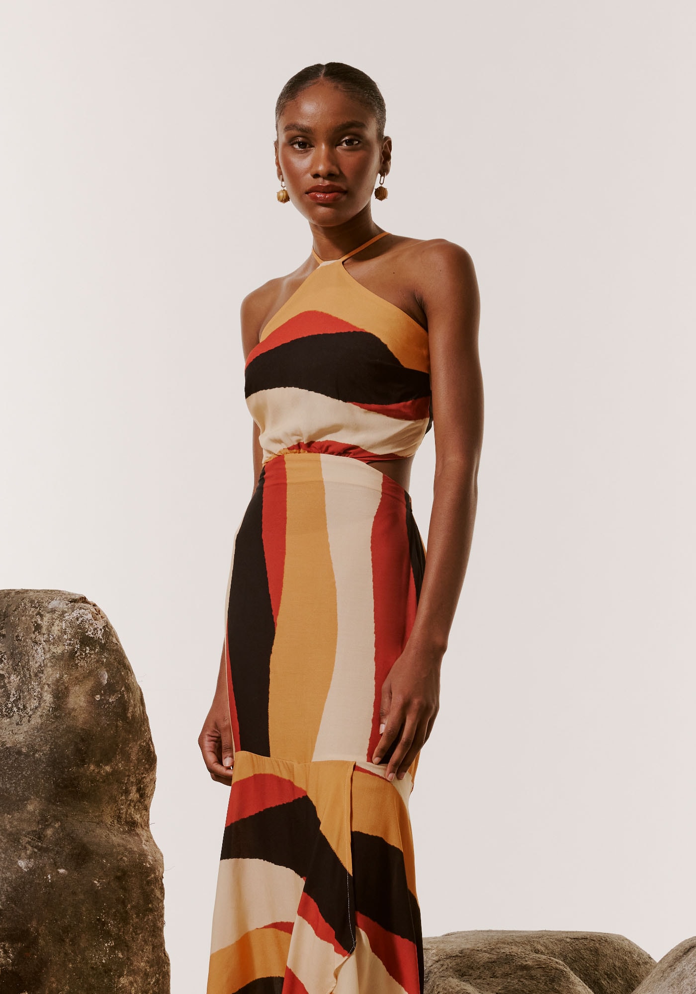 Sofisticado e elegante,o vestido midi é confeccionado em tecido 100% viscose e possui uma modelagemmais ajustada ao corpo. A estampa Relevo se destaca pela modernidade das formase combinação de cores. O decote alto preso no pescoço e as costas nuas dão umtoque de sensualidade para a peça. Os recortes laterais e o babado na barra sãoo complemento perfeito.