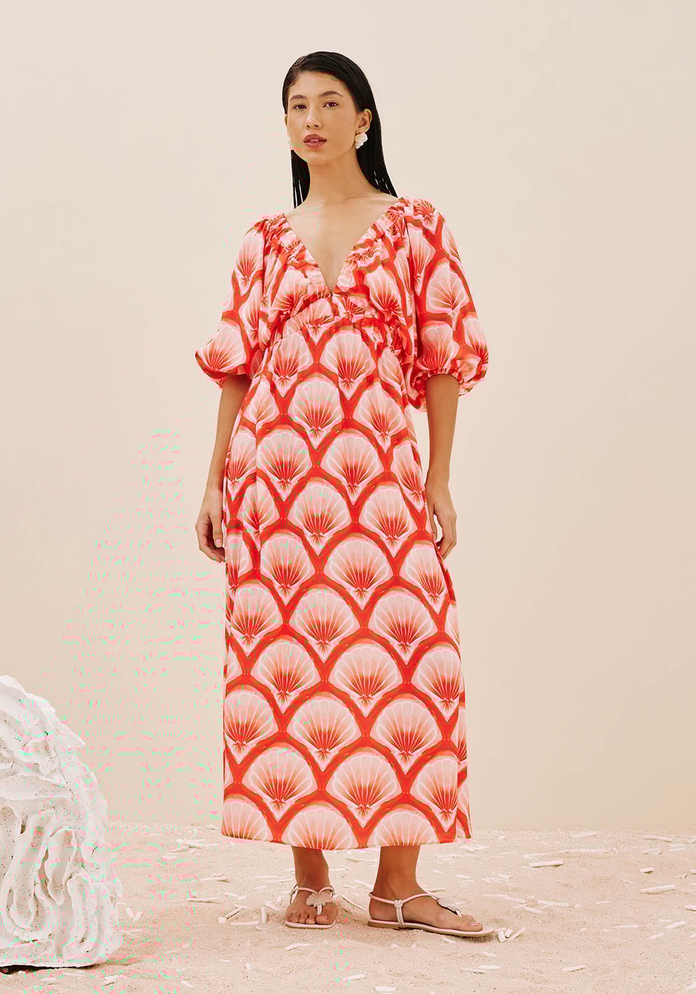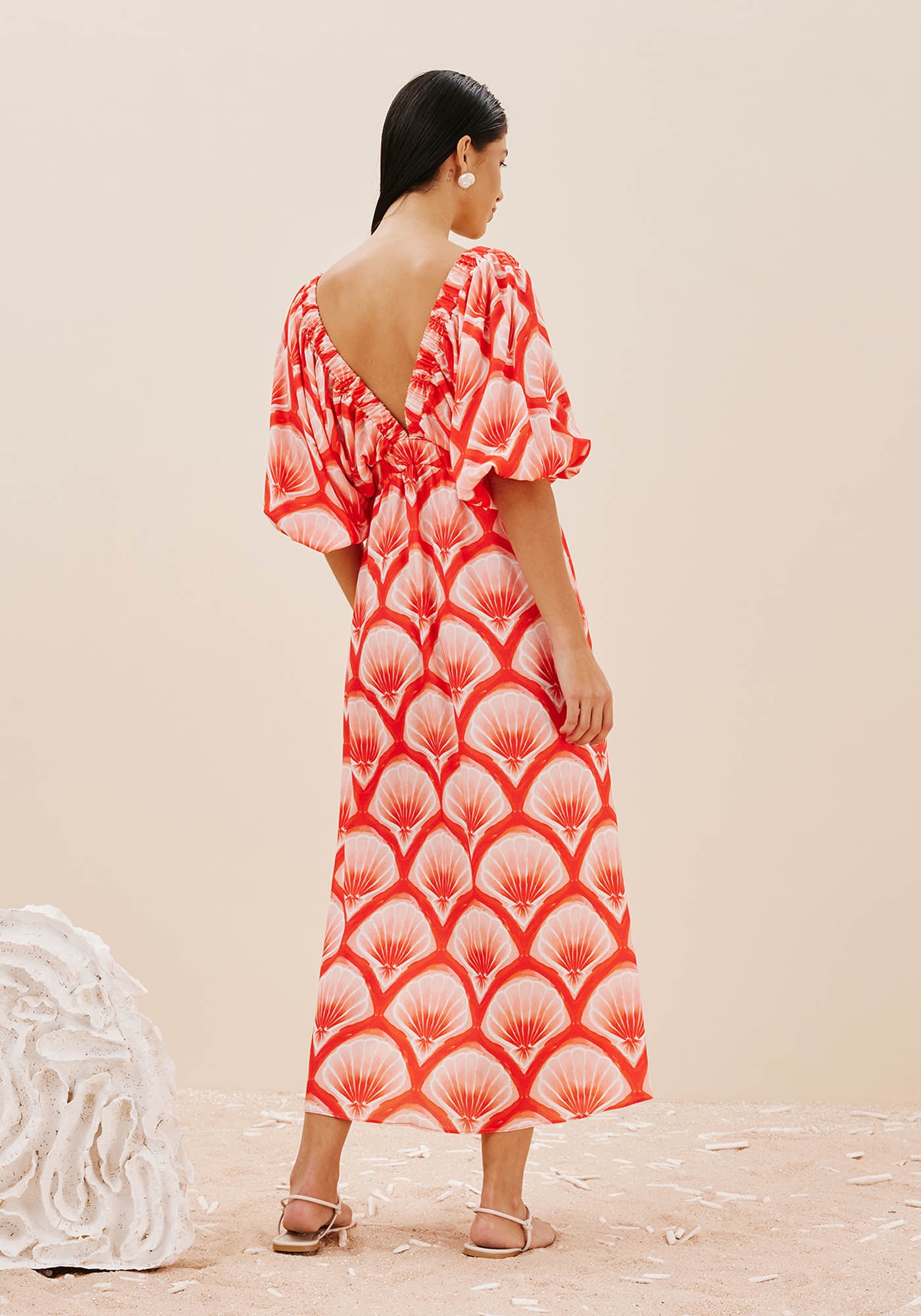 O vestido midi estampado PinkBeach é confeccionado em tecido 100% viscose. O modelo possui decote profundofranzido e manga curta bufante, com cores vivas que são a cara do verão.