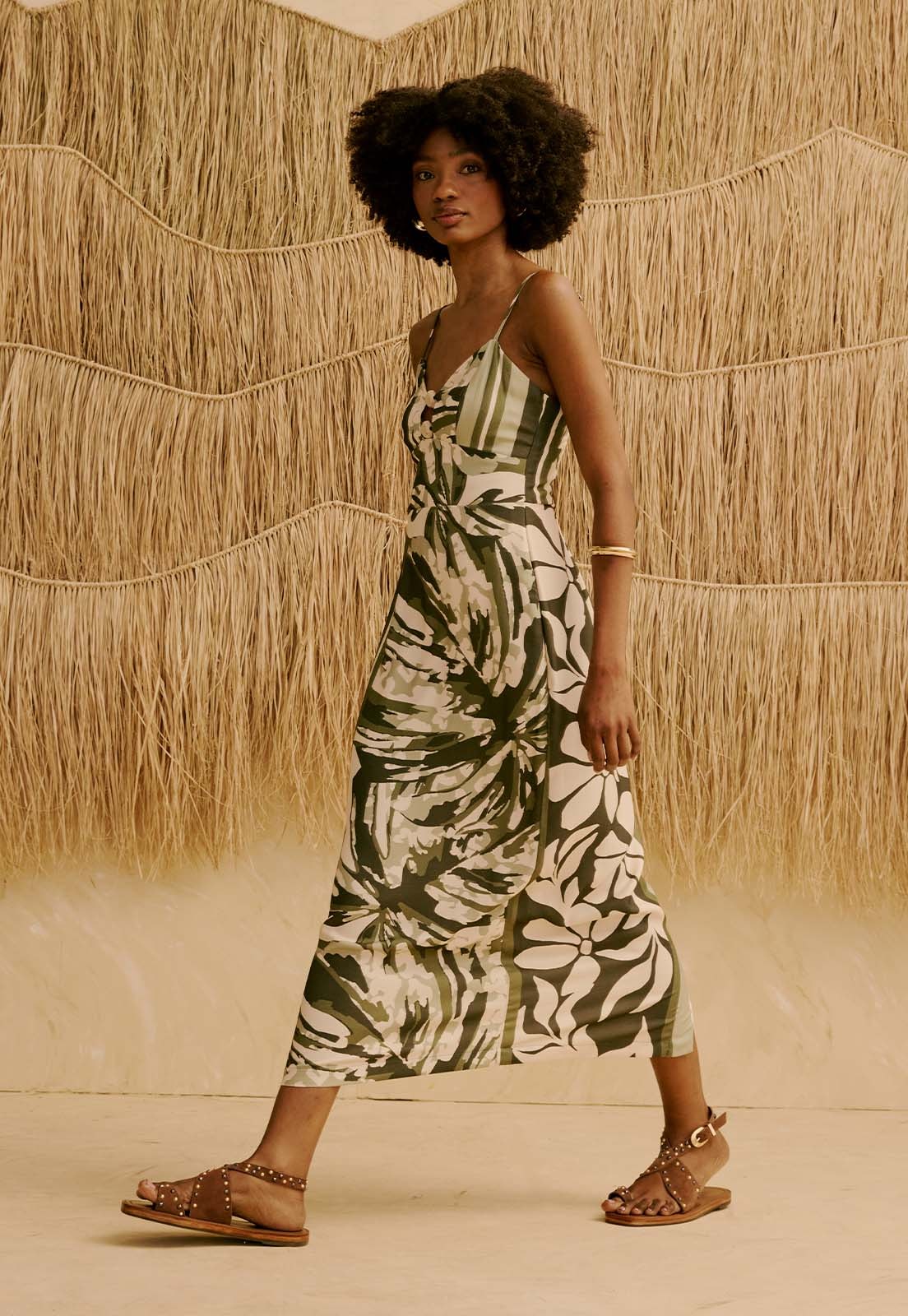 O Vestido Midi Detalhe Ponteira no Decote Estampado Wayra da CaCay apresenta modelagem elegante e confortável, com caimento suave no busto e leve ajuste na cintura, enquanto o lastex nas costas garante adaptação natural ao corpo. A saia acompanha o quadril com fluidez e o comprimento midi valoriza a silhueta de forma atemporal. A forma é grande, então se estiver em dúvida entre dois tamanhos, opte pelo menor e consulte a tabela de medidas para precisão. A modelo da foto tem 1,75m, veste manequim 36 e está usando o tamanho P.