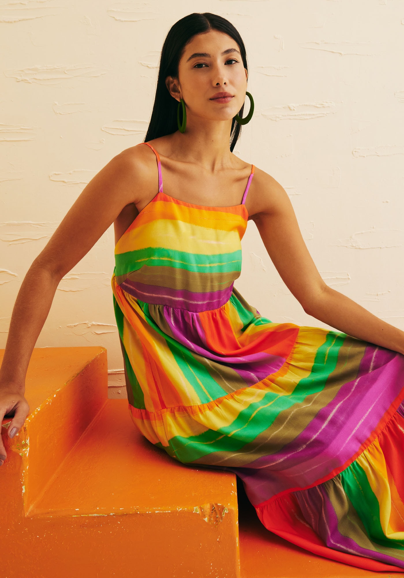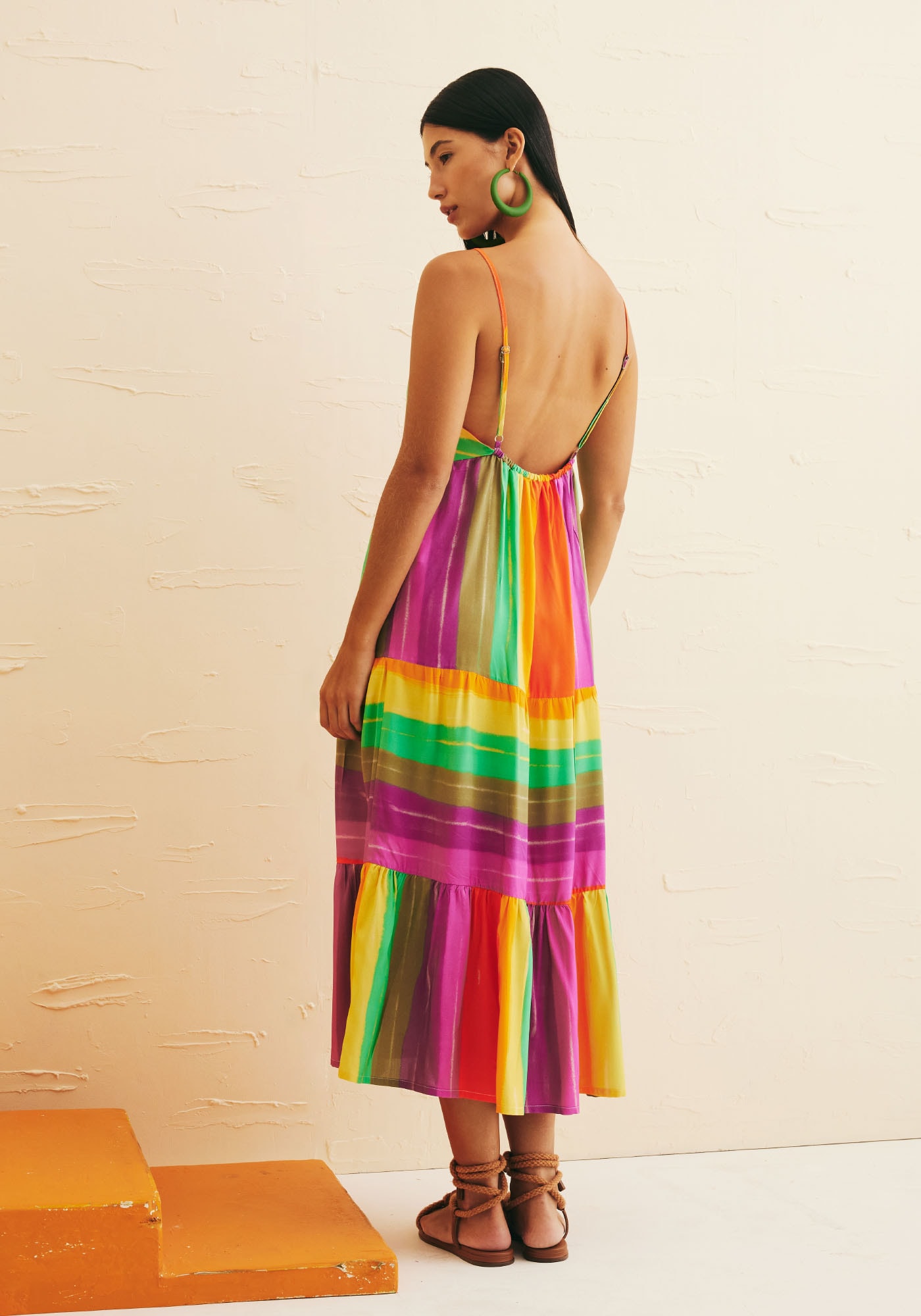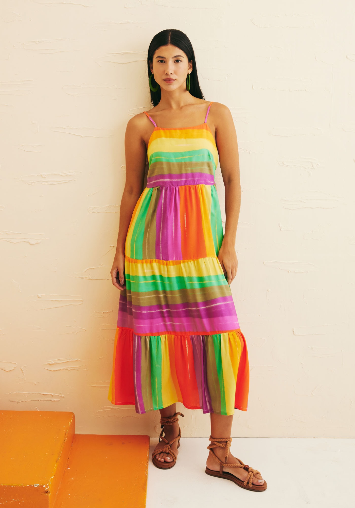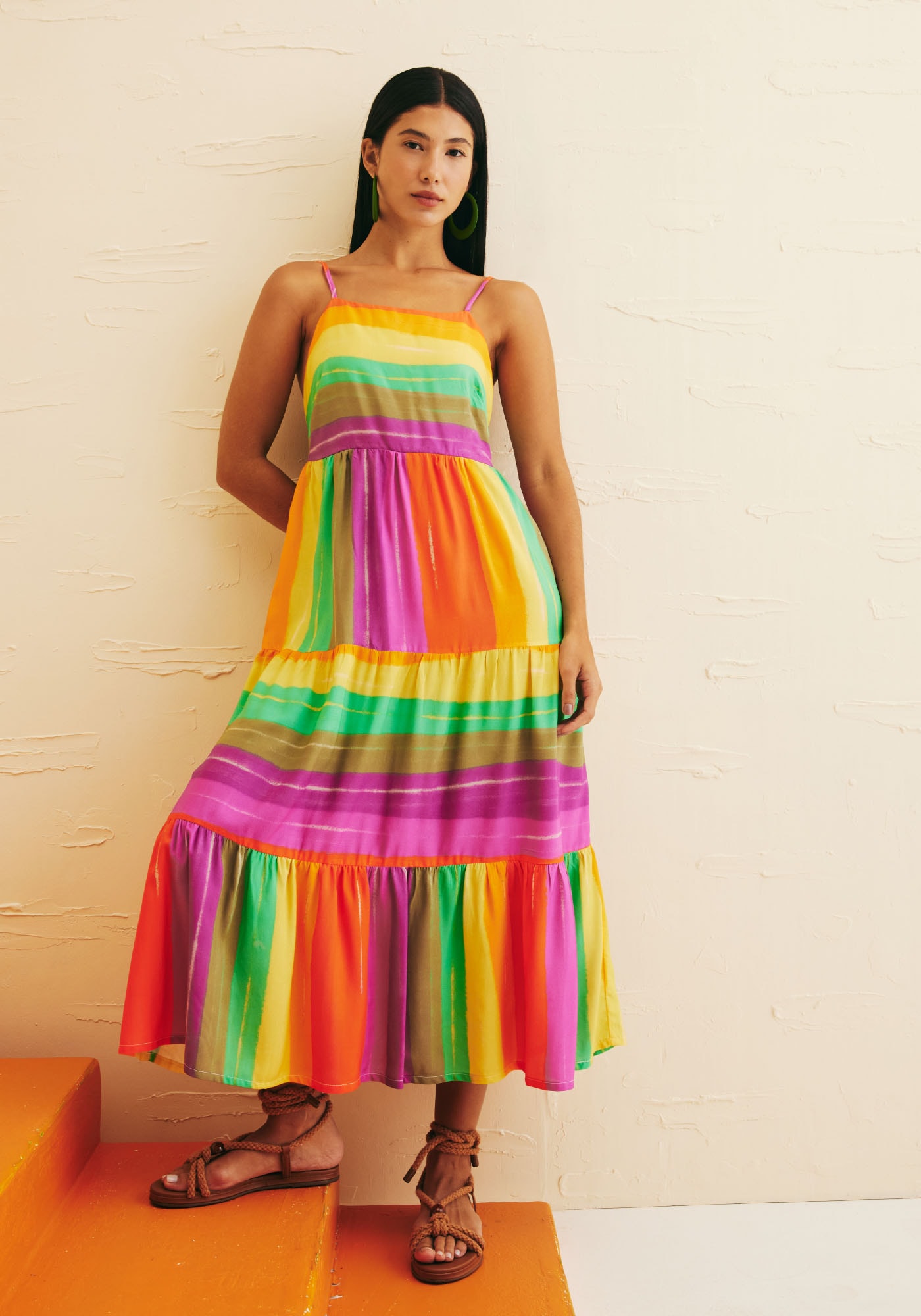 OVestido Midi Jogo de Listras adiciona ao seu guarda-roupa um toque de diversãoe alegria. Este modelo apresenta um decote reto que destaca o colo de formasutil e possui três marias que adicionam movimento, leveza e feminilidade. Seutecido é de 100% viscose. Na parte das costas tem decote com acabamento emelástico e suas alças são ajustáveis. Sua estampa em listras Vinicunca é única,descontraída e vibrante e é perfeita para quem busca trazer um toque de cor.