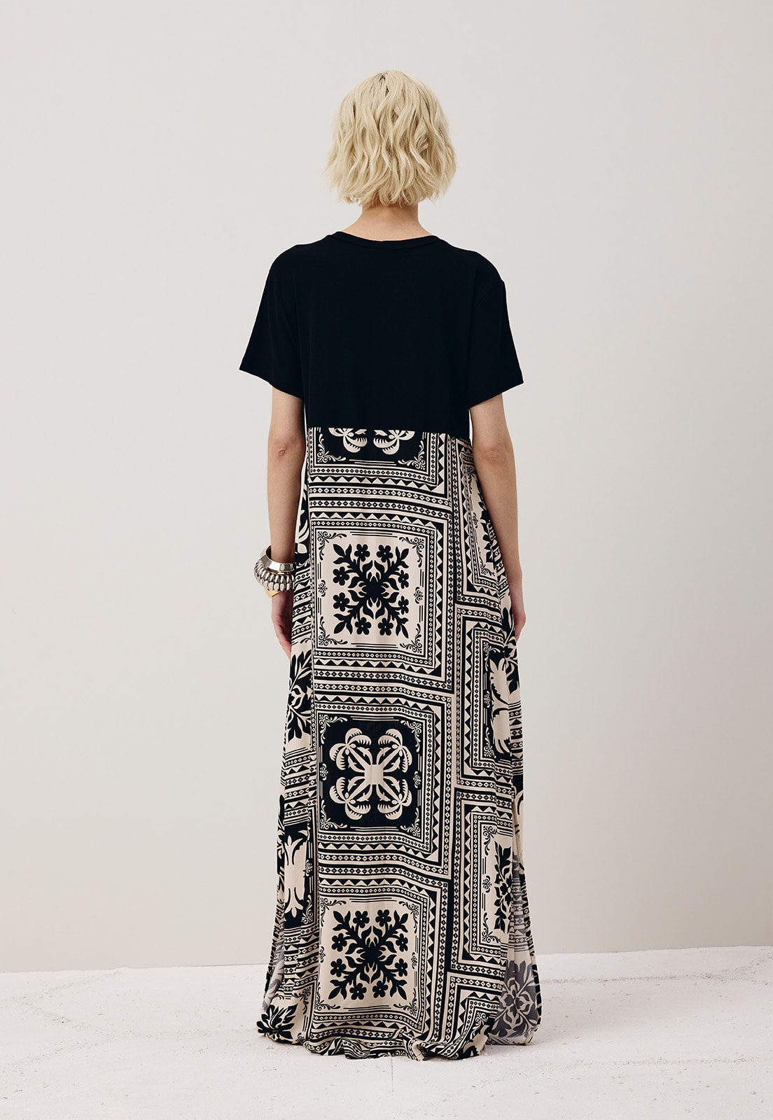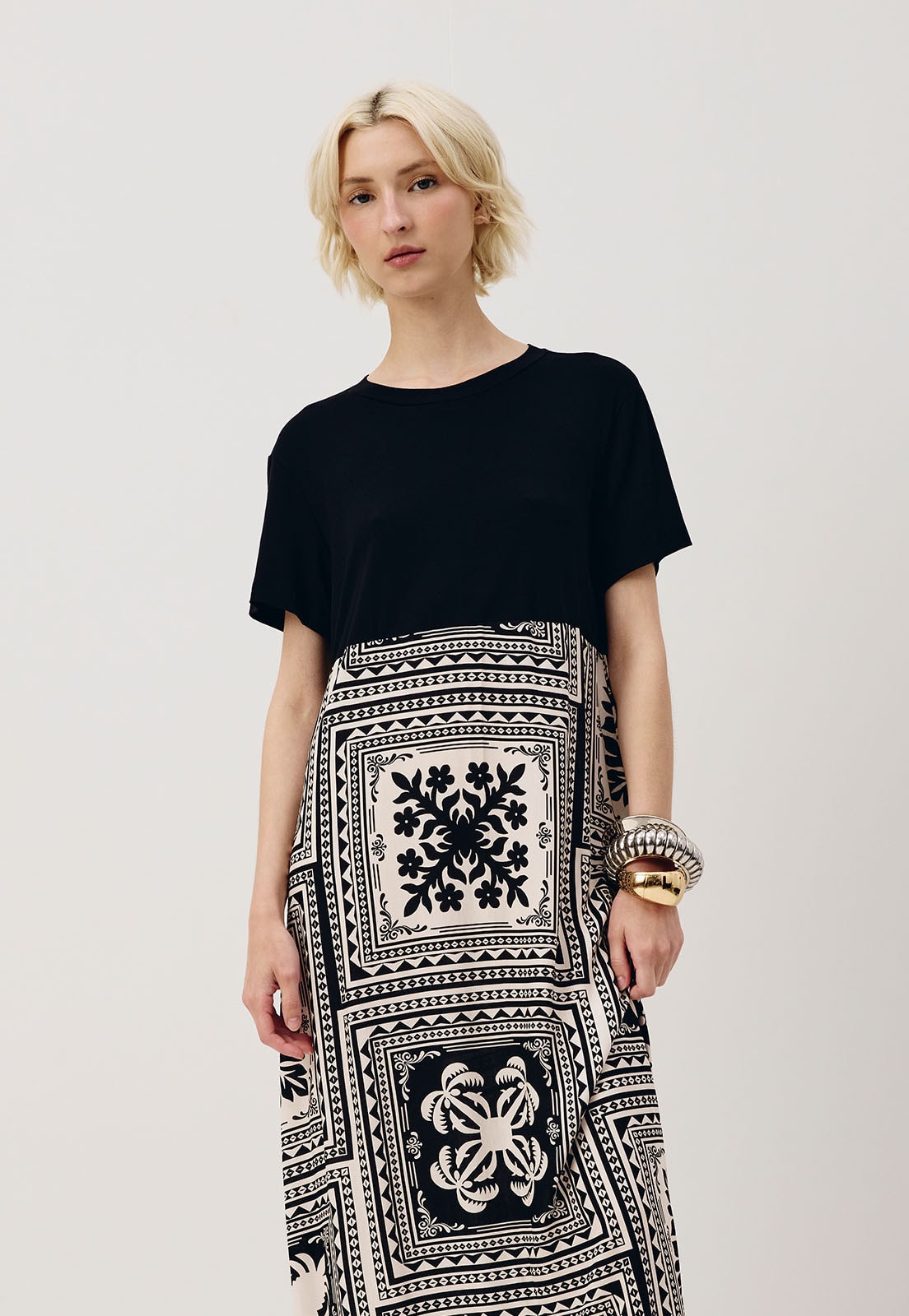 Com estampa exclusiva e modelagem fluida, esse vestido midi une conforto e elegância em uma proposta leve e versátil. A parte superior em malha se ajusta ao corpo com suavidade, criando contraste com a saia ampla em 100% Viscose, que tem caimento solto e movimento natural. O decote redondo e as mangas curtas equilibram o visual, resultando em uma peça prática e feminina, ideal para o dia a dia com um toque de sofisticação.
