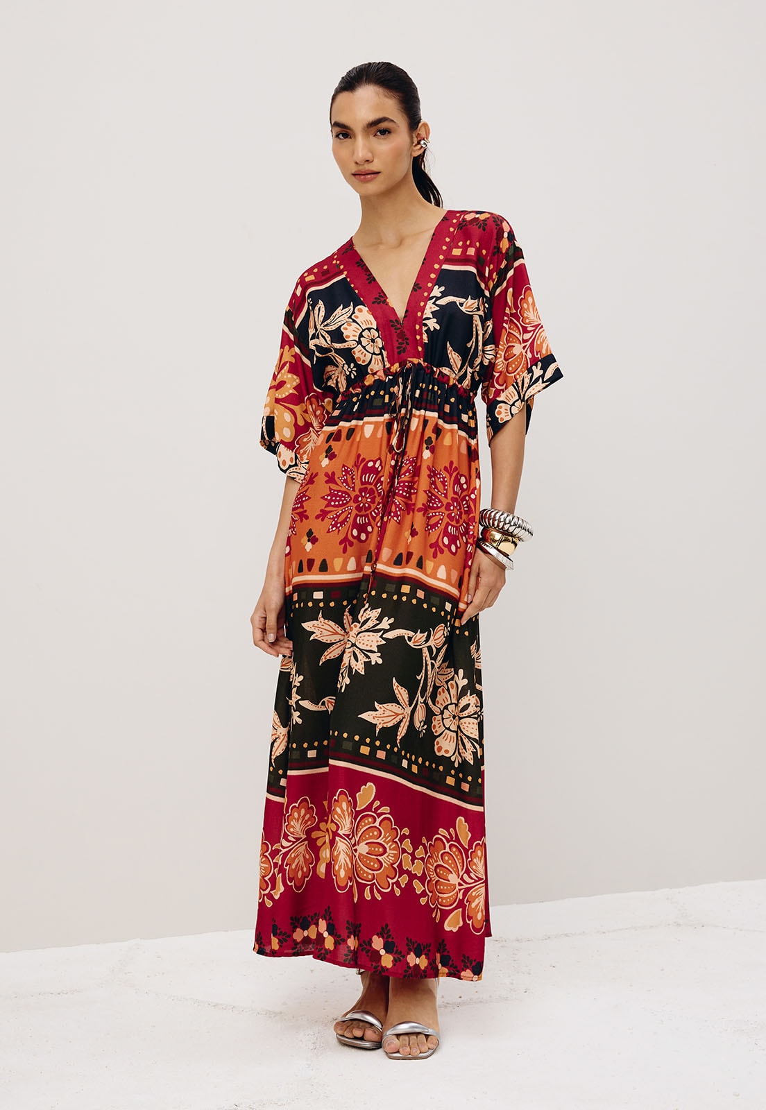 O vestido midi estampado Malbec é confeccionado em tecido 100% viscose.O modelo possui decote em V, com manga ampla e amarração em túnel abaixo do busto. O shape é solto e confortável.