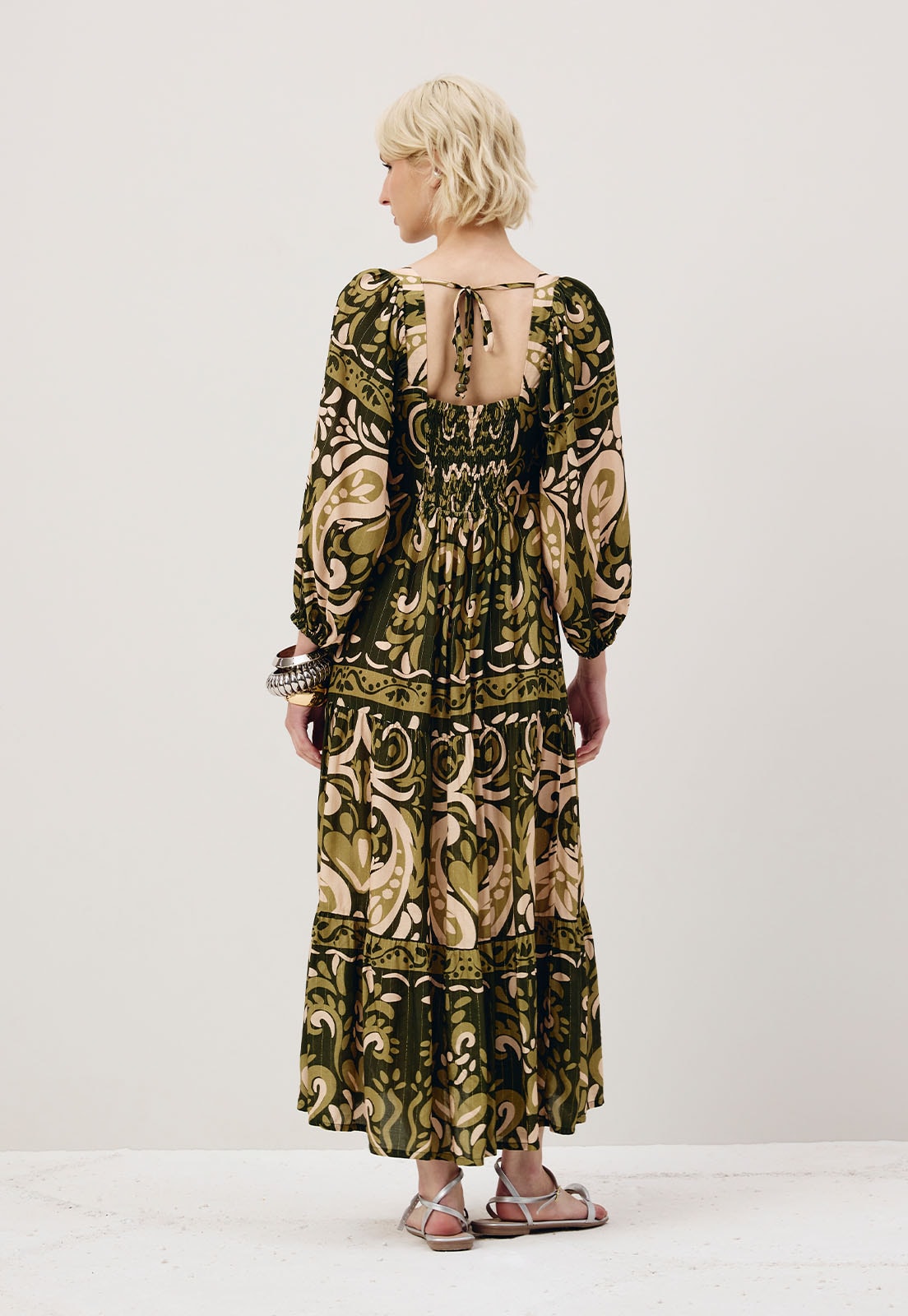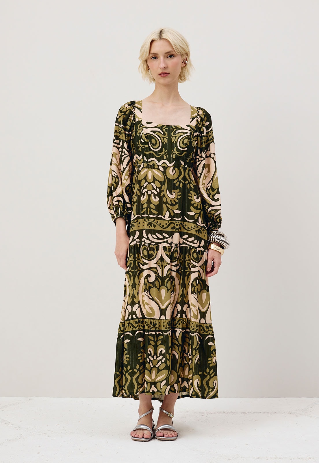 Confeccionado em tecido 99% viscose 1% poliéster,o vestido midiestampado Nomadeé um modelo gracioso e romântico.O modelo possui decote quadrado com manga bufante e elástico na parte de trás. Também possui babados ao longo do comprimento, elemento que dá volume e movimento à peça.