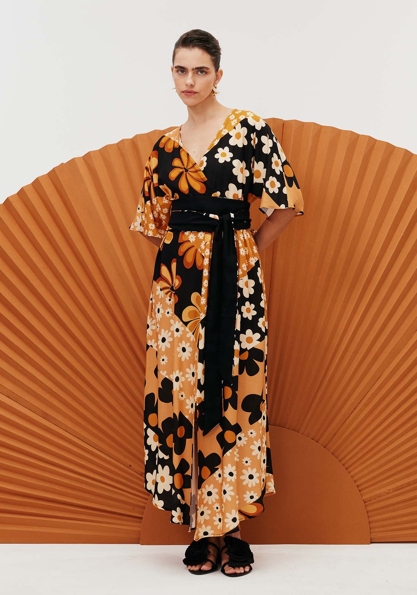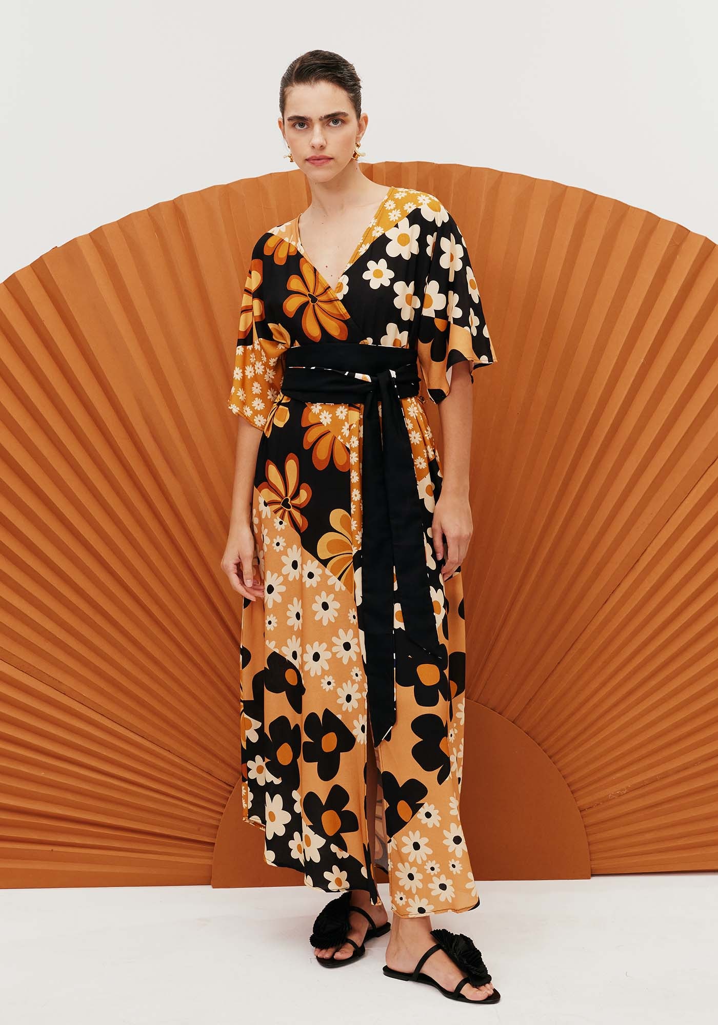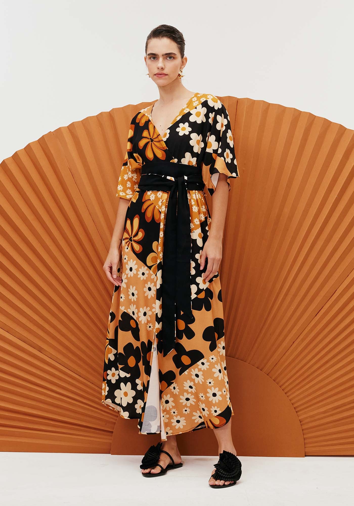 Confeccionado com decote cruzado, o vestidomidi possui fenda frontal, que dá um toque de modernidade para o modelo. Asmangas amplas deixam a peça com mais movimento. A estampa Salsa é belíssima eapresenta uma combinação de recortes florais em diferentes tons.