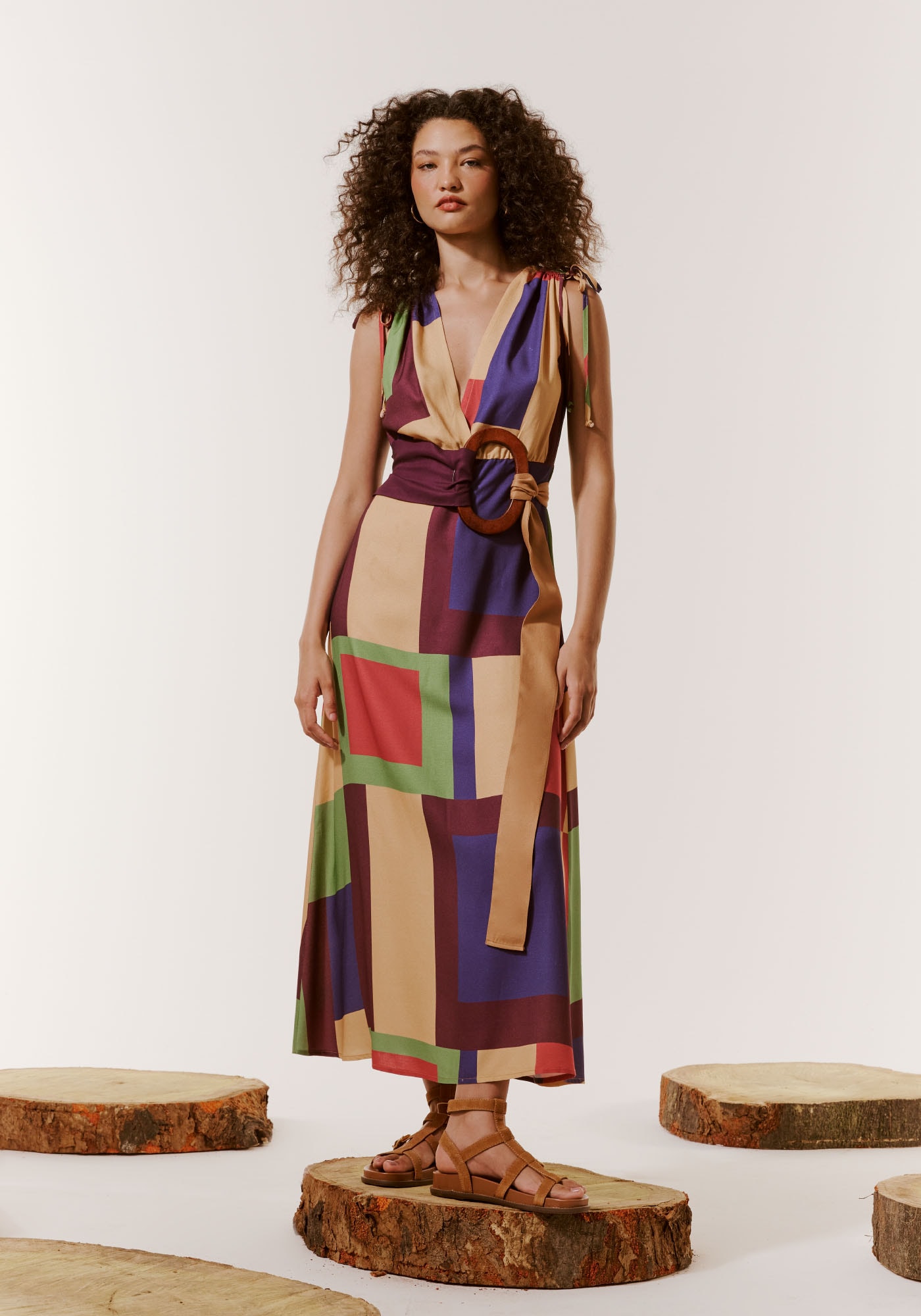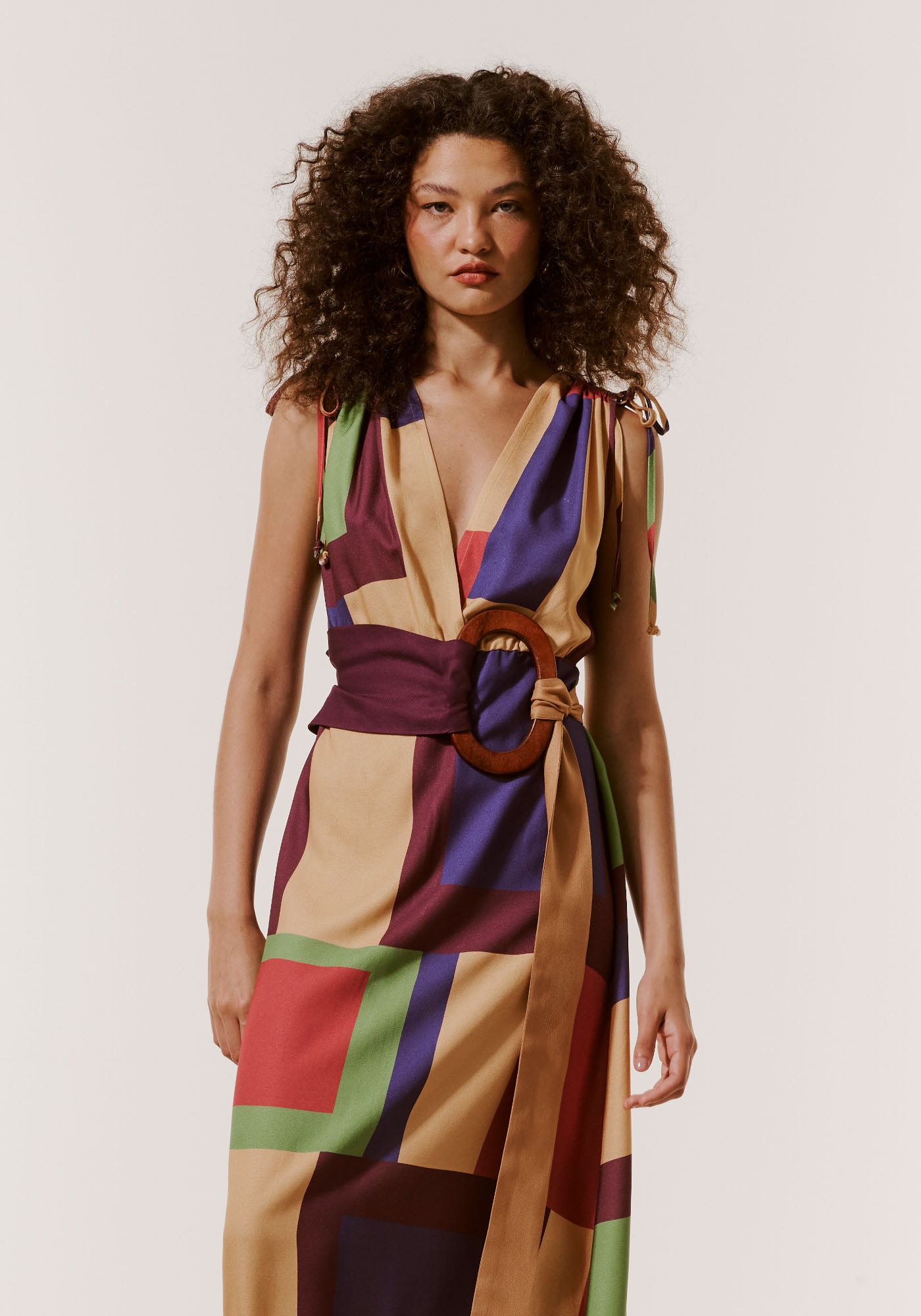 O vestidomidi franzido combina charme e sofisticação. A estampa Chapadas possui formasgeométricas em diferentes cores e tamanhos, o que garante um toque demodernidade à peça. Confeccionado em tecido 100% viscose, o vestido possuidecote profundo em V e detalhe franzido no ombro, deixando a peça mais sensuale ousada.