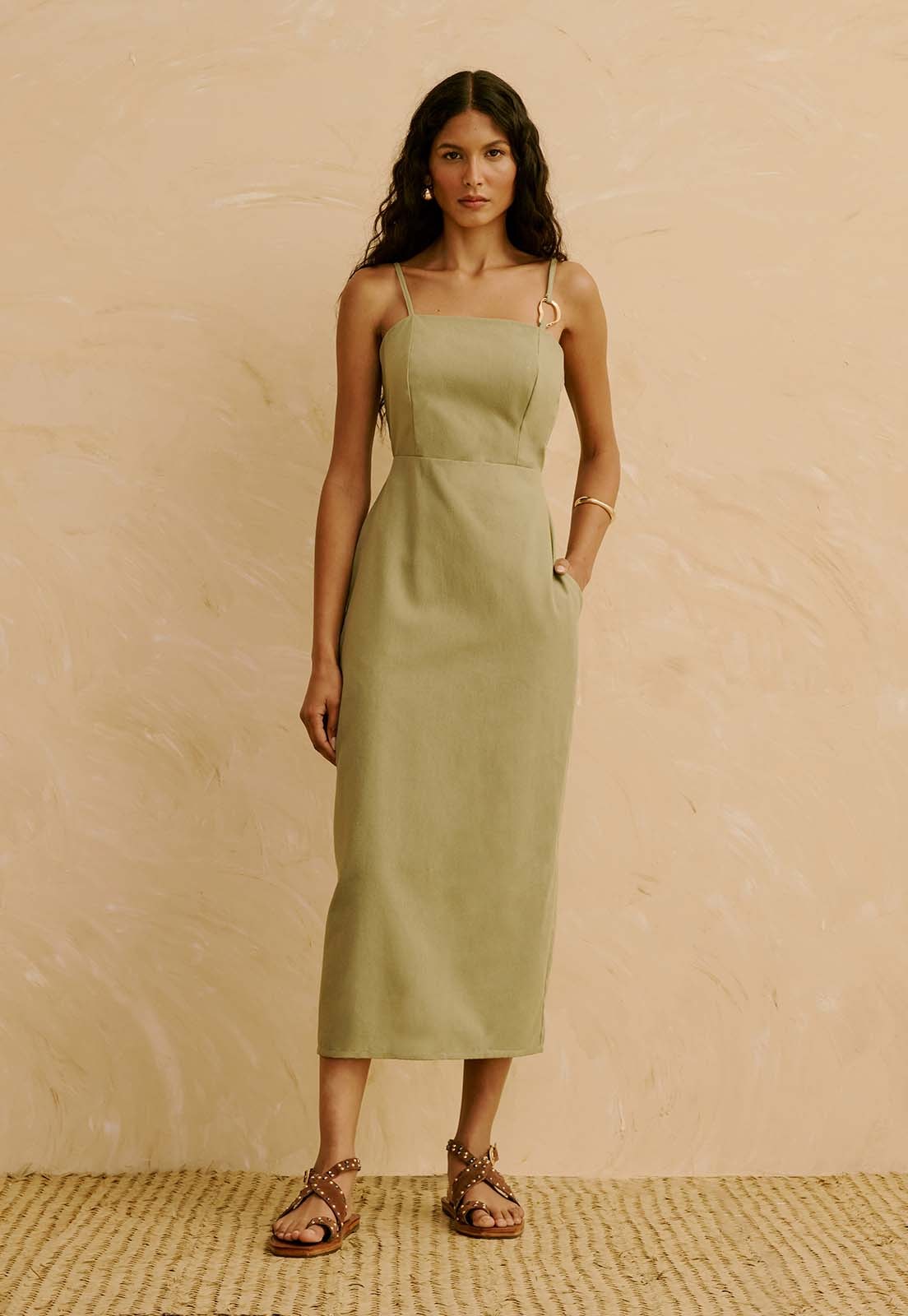 O Vestido Midi Liso com Argola Orgânica na Alça da CaCay tem modelagem reta e elegante, com caimento fluido que acompanha o corpo. O busto é ajustado, a cintura suavemente delineada e o quadril segue solto até o comprimento midi, que valoriza a silhueta com sofisticação. A forma é grande. Se estiver em dúvida entre dois tamanhos, recomendamos optar pelo menor, com base na tabela de medidas. A modelo da foto tem 1,75 m, veste manequim 36 e está usando o tamanho P.