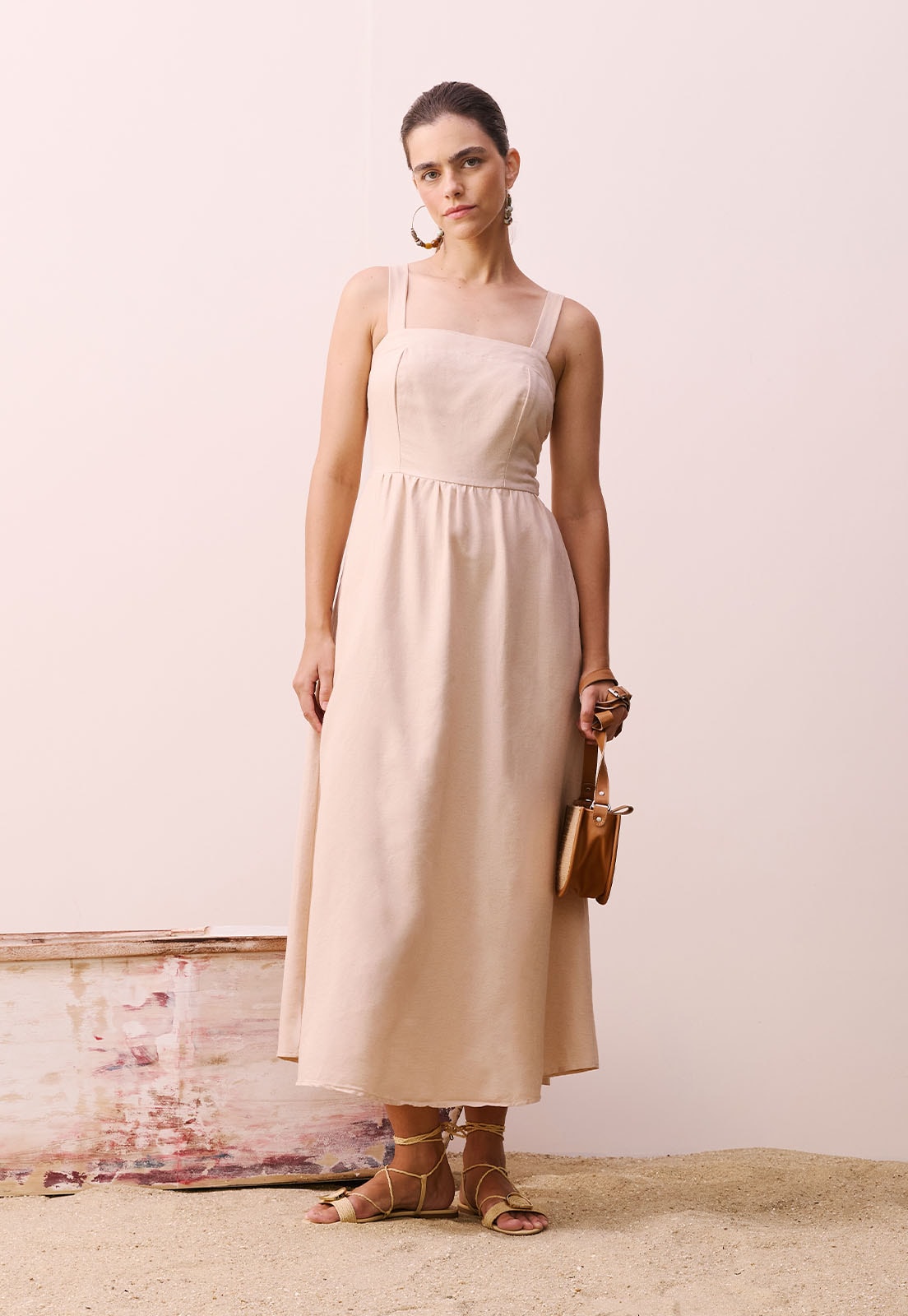 Confeccionado em tecido misto de algodão, viscose, modal e linho, o vestido não possui elasticidade, mas proporciona toque macio e uso prolongado com frescor. Versátil e sofisticado, transita bem entre ocasiões casuais, encontros diurnos ou eventos que pedem leveza e estilo. Combine com sandálias delicadas, bolsas estruturadas ou acessórios marcantes para compor produções que equilibram conforto e personalidade.