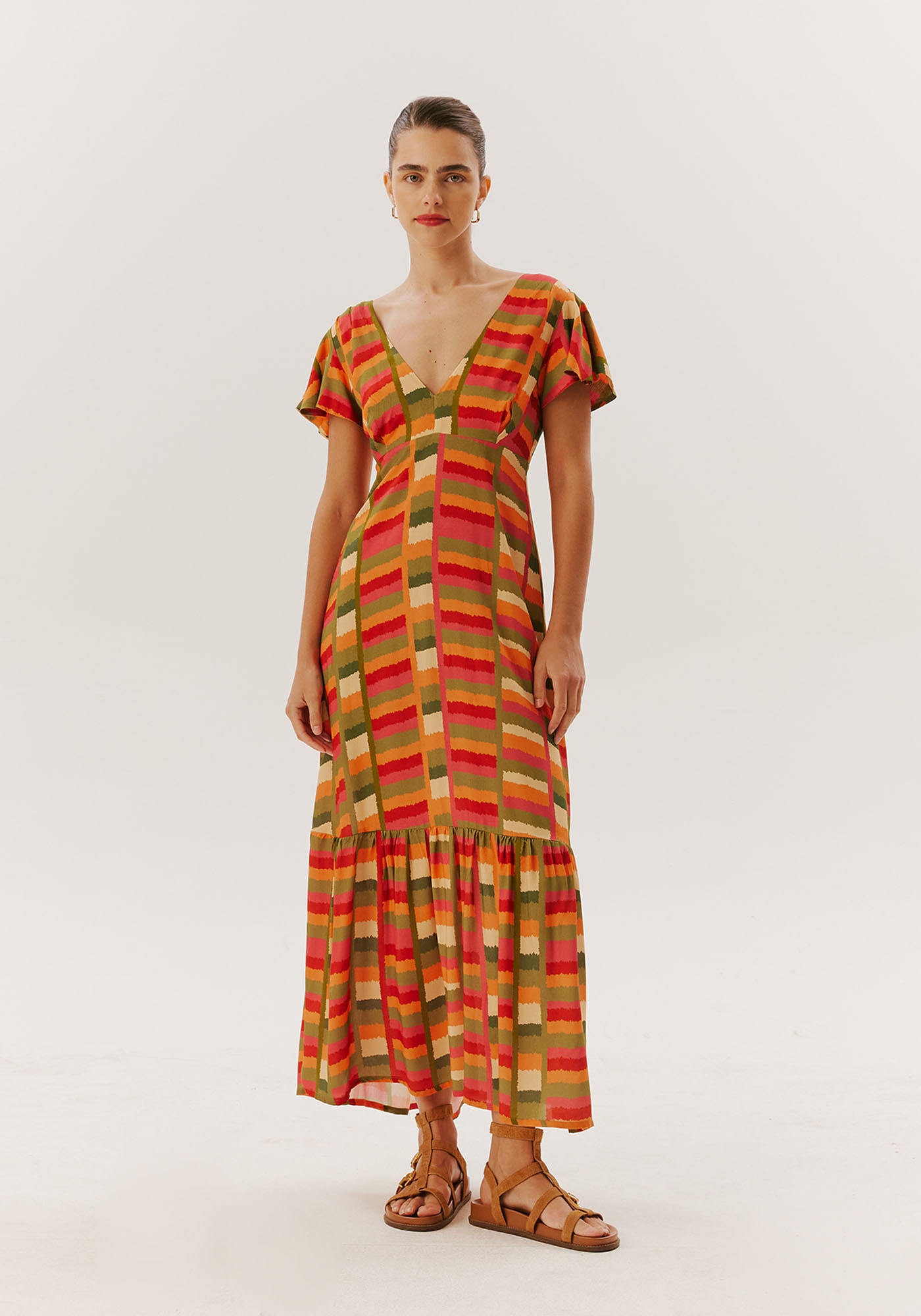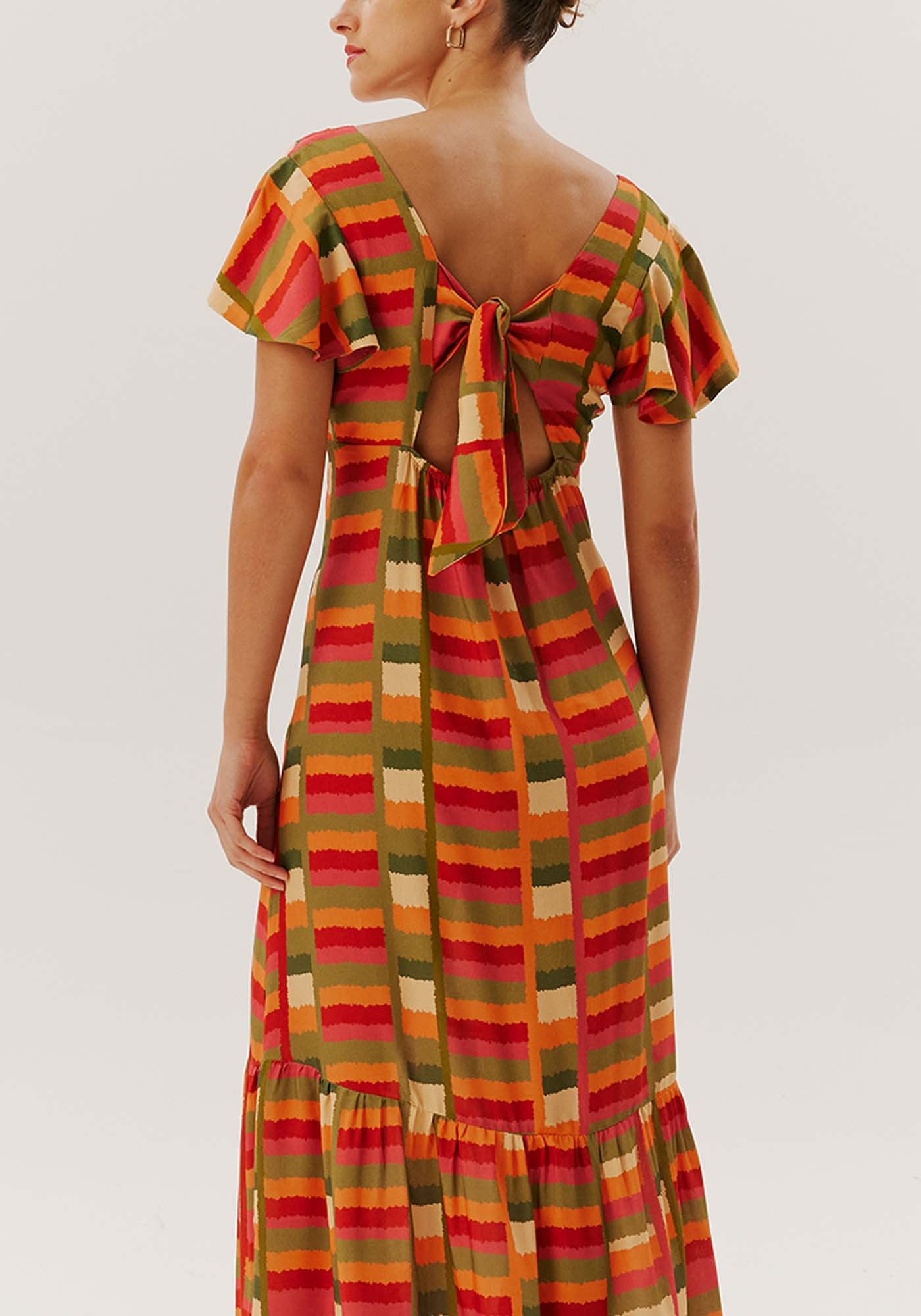O vestidomidi estampado é exclusivo e encantador.Confeccionado em tecido 100% viscose, as mangas amplas e a amarração nascostas adicionam um toque especial à peça, enquanto a maria no comprimentocombina conforto e elegância.