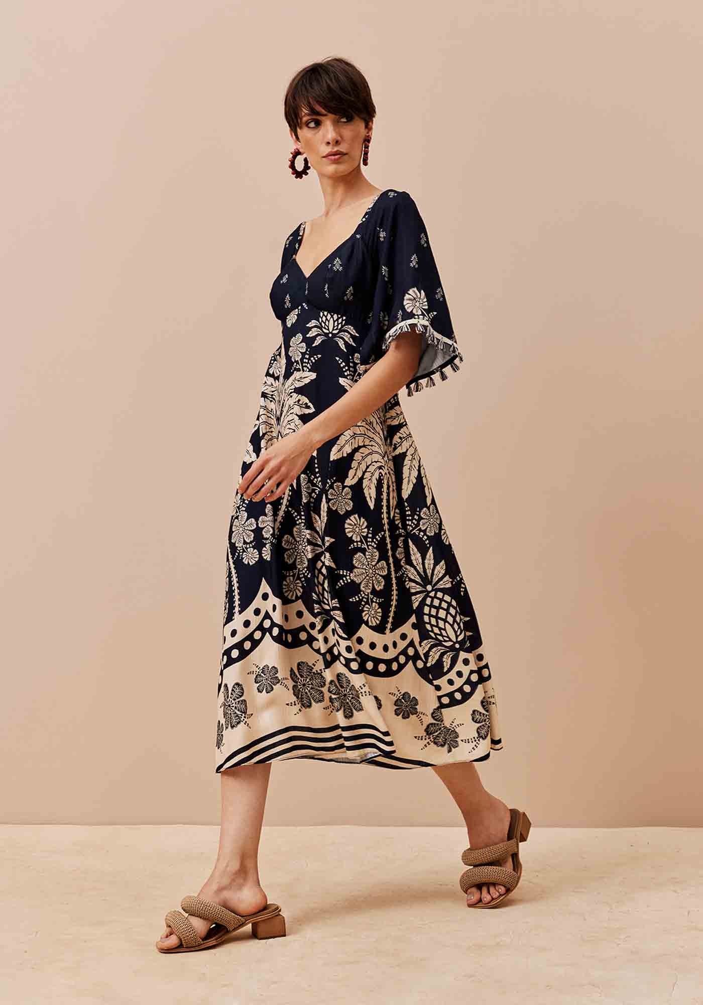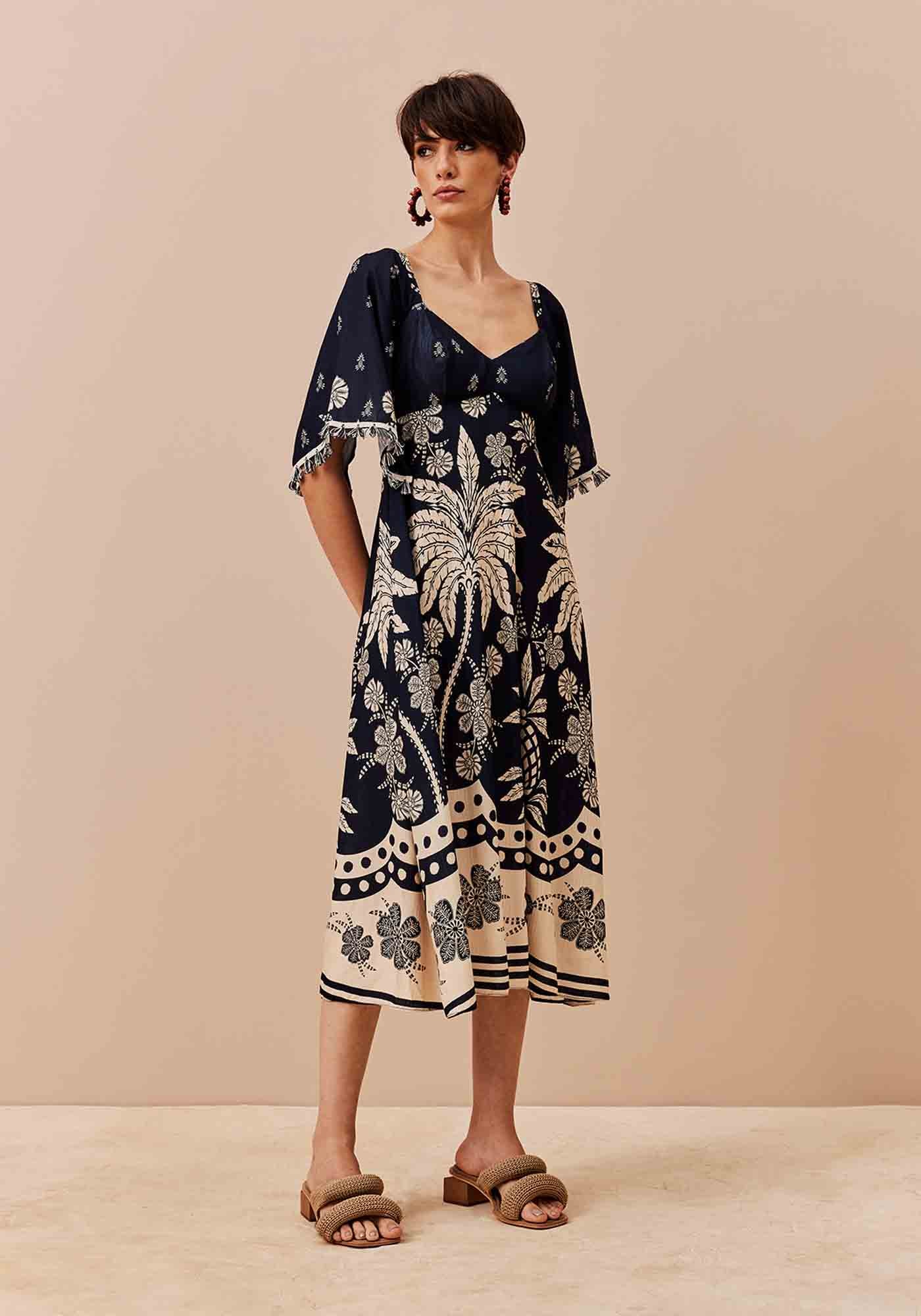 O Vestido Midi Estampado Árbol de Coco é uma peça cheia de estilo e movimento. Com saia evasê, decote em V e mangas amplas, ele traz um toque despojado e moderno. O detalhe das franjas adiciona um charme extra, enquanto o lastex e a amarração nas costas garantem um ajuste perfeito. Em 100% viscose, é uma ótima opção para diversas ocasiões unindo estilo e praticidade.
