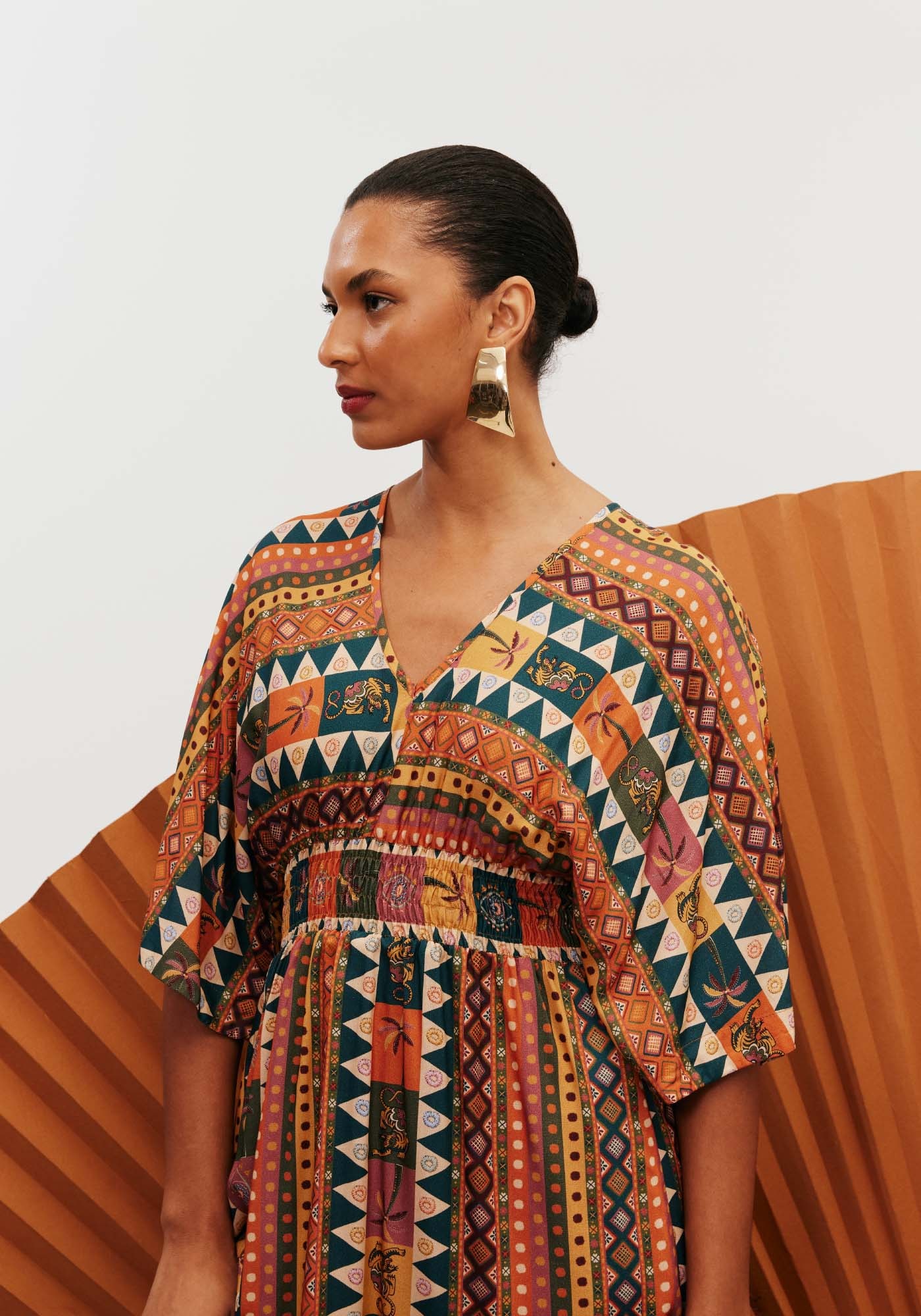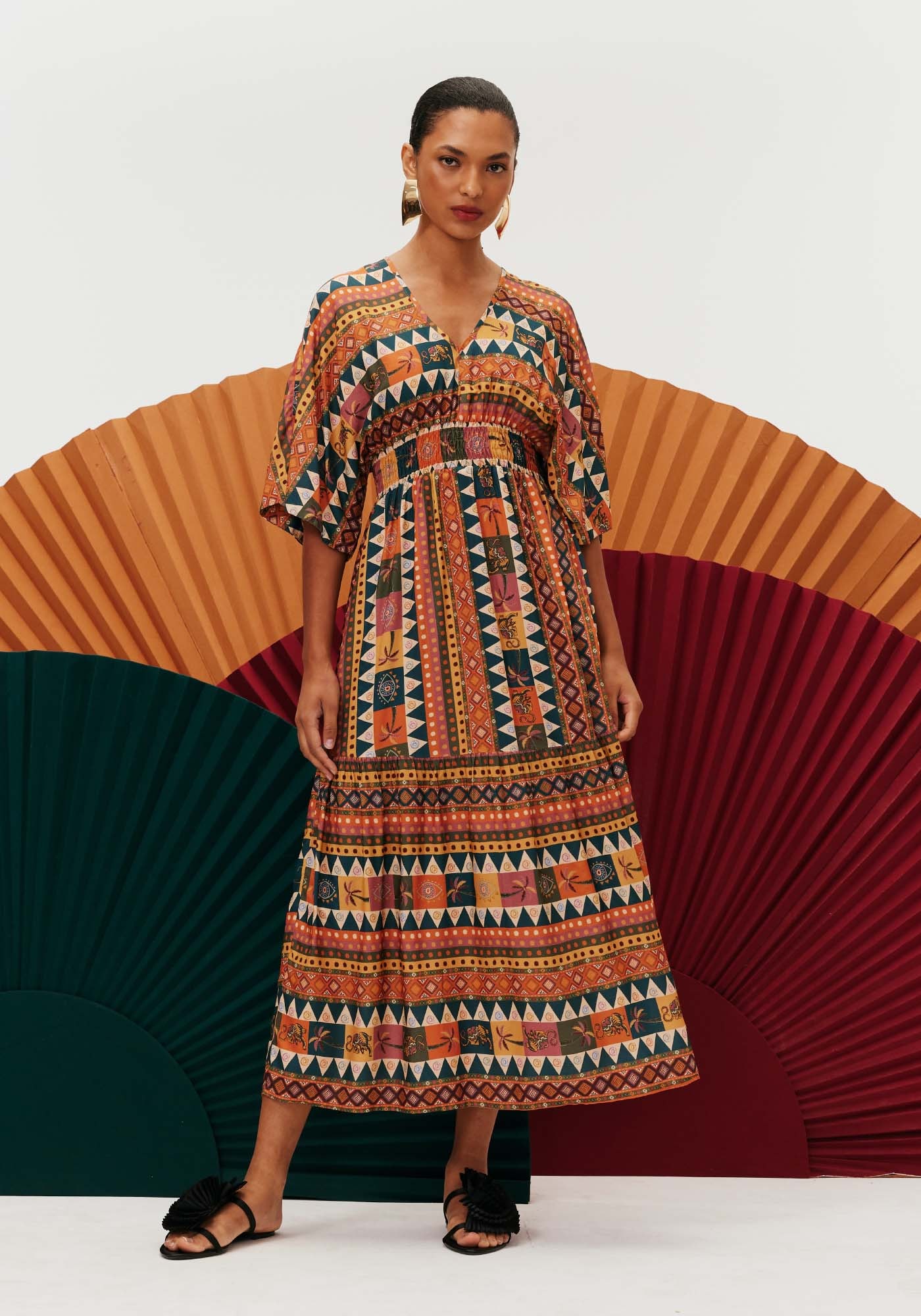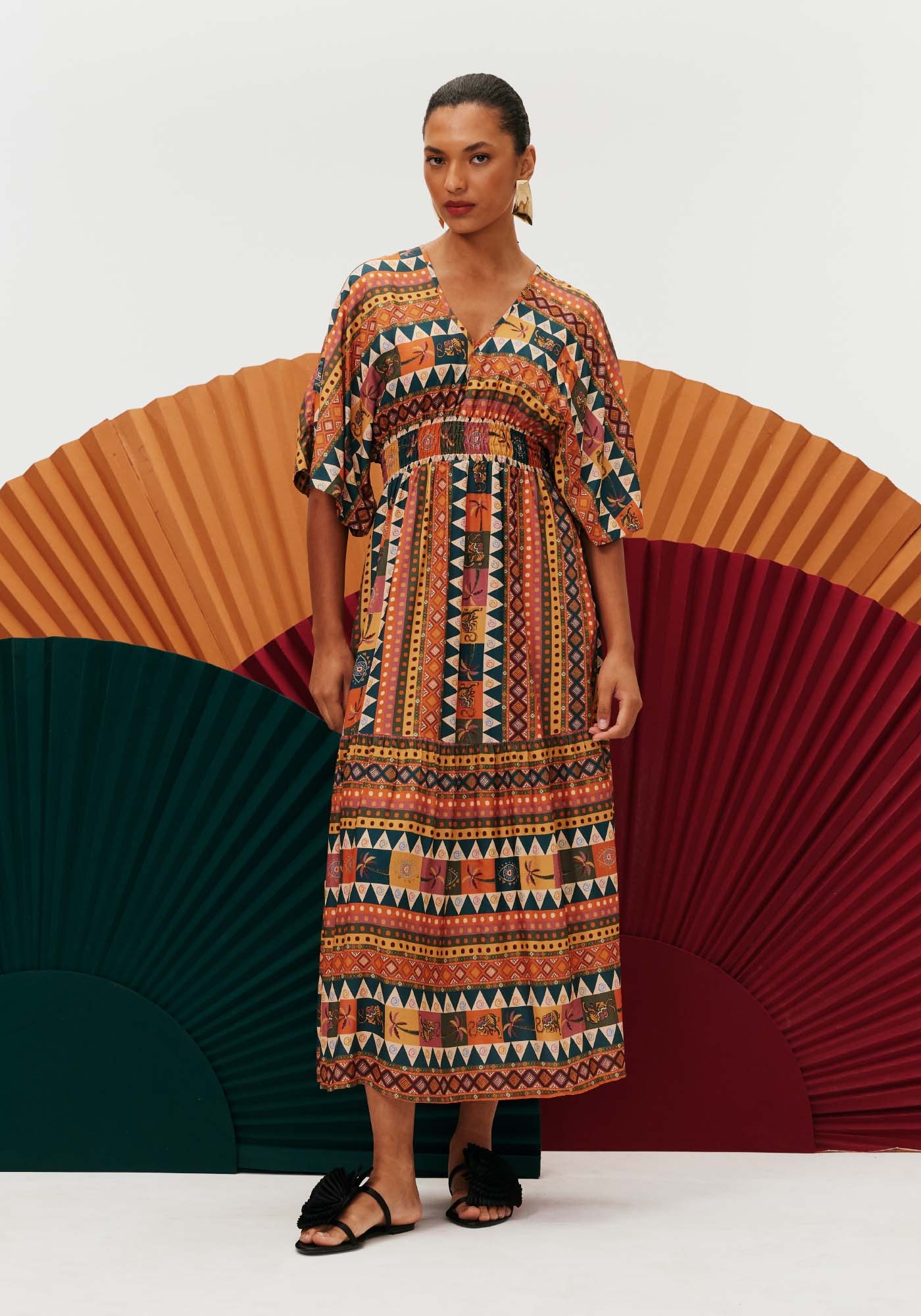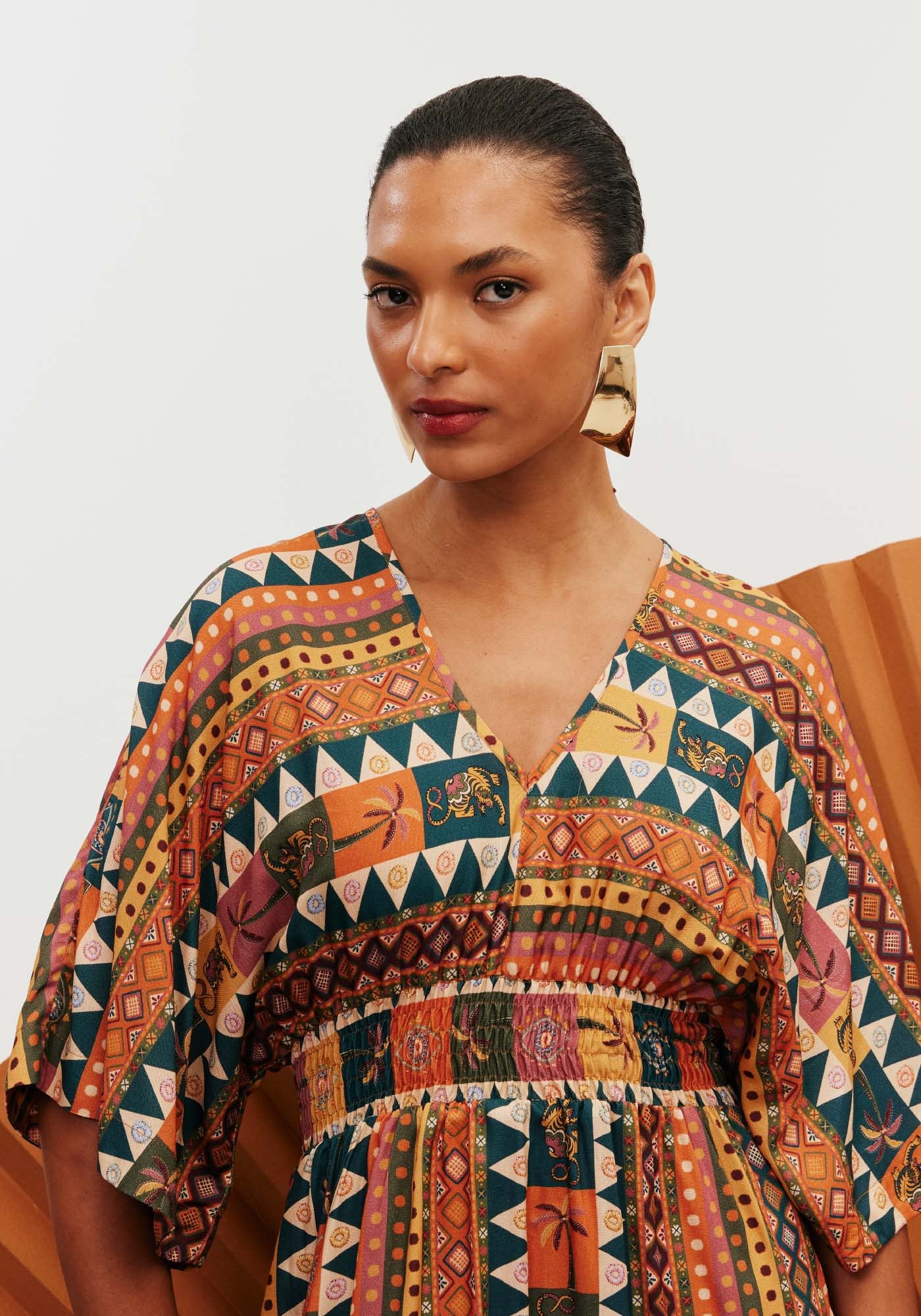 Confeccionado em tecido 100%viscose, o vestido midi é um modelo super charmoso e democrático. Com gola em Ve lastex abaixo do busto, a peça possui manga ampla estilo kimono e bastantemovimento e fluidez.