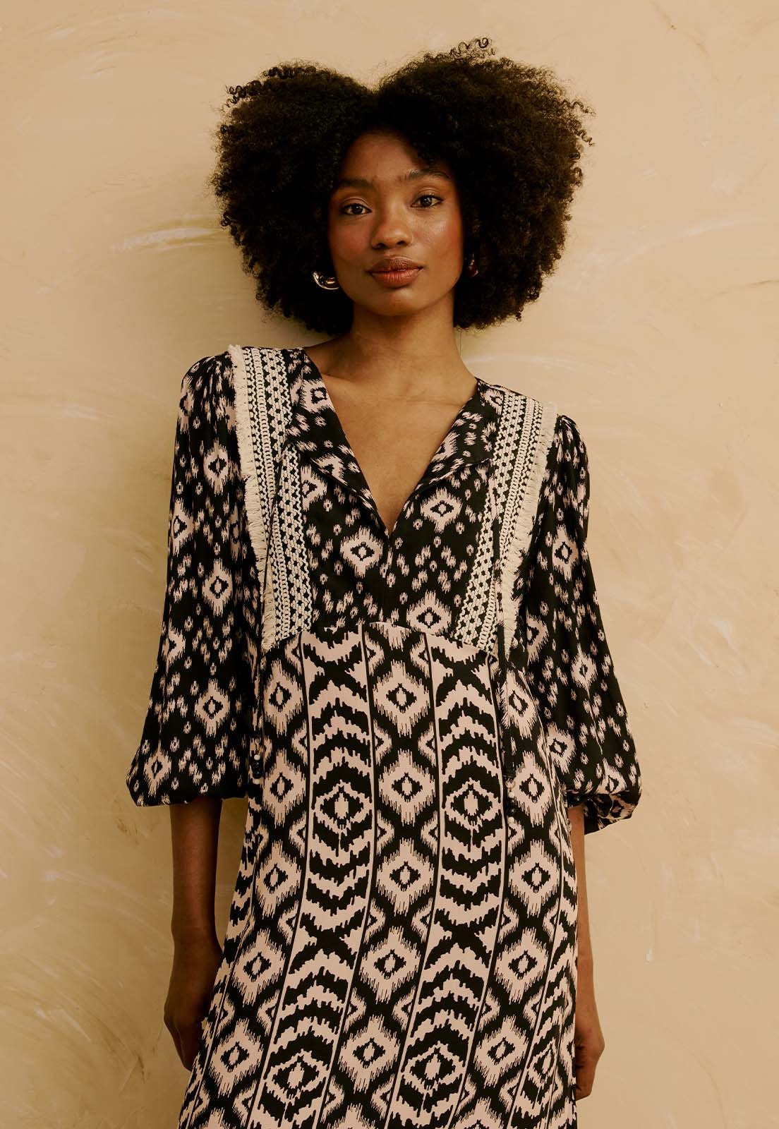 Confeccionado em 100% viscose, o tecido é leve, garantindo conforto prolongado para o dia todo. Ideal para ocasiões casuais, trabalho ou eventos diurnos, o vestido traz um toque contemporâneo com sua mistura de estampas geométricas e mangas com volume sutil. O estilo versátil permite combinações com sandálias de tiras, bolsas de palha ou acessórios em metal fosco para uma proposta sofisticada e descomplicada.